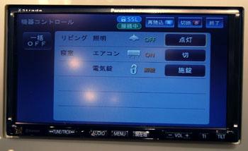 いやあ最近のカーナビってすごいっすね。と、パナソニックのカーナビ2008年夏モデル発表会に行って感じてきました。すでにカーナビの恩恵はジンジンと感じているのですが、まさかここまでできるとは!今回発表されたのは、ストラーダのハイエンドモデルであるFクラス。CN-HX1000DとCN-HW1000Dの2機種。地図デザインが一新され、さらに見やすく、わかりやすくなり、地デジ放送もDVDもきれいに観られる「液晶AI」を搭載し、音質にこだわりたい人も納得の、音の匠「ミキサーズ・ラボ」がサウンドをチューニング。などなど、あまりうまく説明できていませんが、とにかく機能てんこ盛りなんですね。で、ここまででも撃沈ぎみなワタクシに、さらなる追い打ちが……。strada LINKと呼ばれるそれは、”家”とクルマをリンクする、とっても便利な機能。●CN-HW1000Dでの「ライフィニティ」操作画面●エアコン、照明、玄関ドア電気錠の操作と「かえる通知」機能体験パネルの図ざっくり言いますと、ブルートゥース対応の携帯電話を介して、自宅の・玄関ドア電気錠の施錠・解錠・照明のON/OFF・エアコンのON/OFFなどの制御・床暖房のON/OFFなどの制御・「かえる通知」機能で帰宅情報を自宅のコントロールパネルに通知(くらし安心ホームシステム「ライフィニティ」を利用することによる)ができたり、地デジ視聴中に番組情報画面で、みたい番組を自宅のハイビジョンレコーダーなどに録画(ディモーラおよびハイビジョンレコーダー<ディーガ>を利用することによる)さらに、自宅のホームネットワークカメラの映像をナビの画面で見られる(「みえますねっと」およびホームネットワークカメラの利用による)など、クルマの中からさまざまな家電製品の制御を行うことができる、夢のような親切機能が、じつは現実になっていた。その衝撃は、「未来が今ここに」状態。カーナビは、クルマを飛び出し、さらに多くのネットワークを構築することができる、まさにマルチなシステムになってきているんですねぇ。(コジマ)