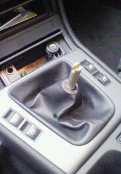 毎度、キヨハラです。編集部に来ていた岨山レポーターを捕まえてみました。そうです。この前のクイズ?の正解は「BMW318Ciの岨山号」でした~。パチパチパチで、なぜシフトがあんな形になっていたかというと……シフトパターンのシールがはがれてしまって、直していたのです。どう直すかって? えぇ~、……ボンドで貼るだけですこれでバッチリ! ハイソカー?に戻ったとさっ。めでたしめでたし。 (キヨ)