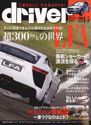 driver 1-5号明日発売です。今号の内容は……そこに到達できるのは選ばれたクルマのみ!LFA 超300km/hの世界リミテッドモデルの魔力に迫るWe Love 限定車そのほかの内容も、もりだくさんです。最新ミニバン帰省ロングラン ステップワゴン/セレナ/ノアPNDからハイエンド機まで実装チェック2010 カーナビ最新モデルバイヤーズガイド最新ショーカーの源流を探るCR-X→CR-Zコンセプト、カローラレビン(AE86)→FT-86コンセプトN360→EV-Nなど充実装備でお買い得特別仕様車&モデル末期車をねらえ!この道一筋40数年の遠藤師匠が直伝!年末・年始に得するクルマを購入術シロウトこそ絶対オススメ!世界の一流工具をナメるな!NEWモデル試乗トヨタ アイシス 新エンジン搭載で走りはどう変わったのか?ボルボ2010 買い得グレードがめじろ押し!シボレー カマロ マッスルカーブーム再来?メルセデス・ベンツ Eクラスワゴン 5m弱のボディを1.8Lで走らせる?VWゴルフ ヴァリアント&トゥーラン 変わったのは顔だけか?シトロエンC3 パノラマ感満点の超絶フロントウインドー!連載d’s総研 レクサスHS250hバージョンS俺がのらなきゃ誰が乗る!マツダ キャロルもちろんクリフカットの初代です。本誌・鈴木
