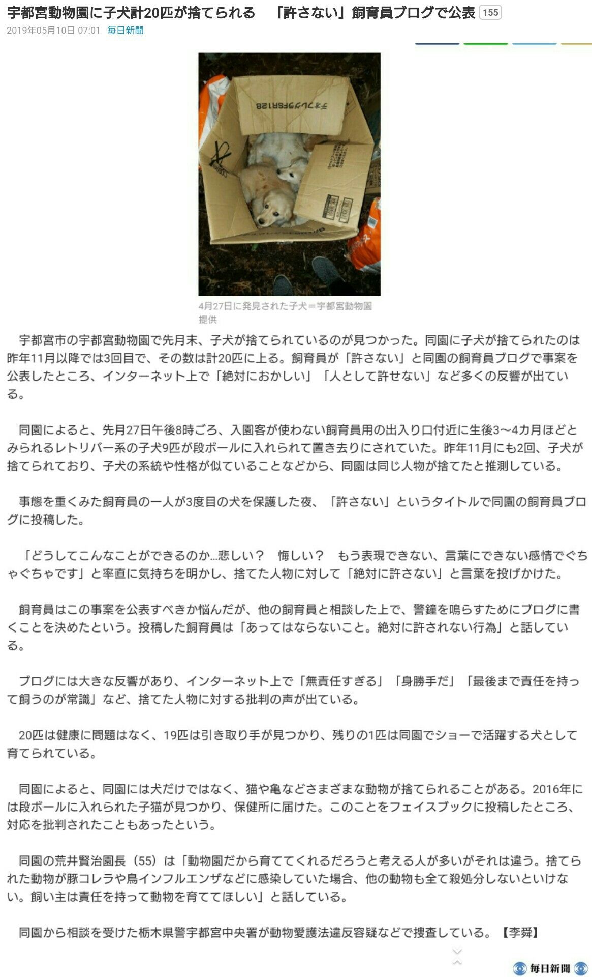 宇都宮動物園に何度か行った事のある人なら『またかよ⁉』という印象。毎回、雑種の子犬が捨てられている。ついに毎日新聞が記事にした。元記事が消えても読めるように、啓蒙の為にスクショした。記事の啓蒙を禁ずるのであれば削除するが、良い記事なので永遠に消してしまうのは勿体ないと思う。ネット民のコメントでは、一度に9匹だから業者の仕業を疑う声もあるが、Gレトやラブの中には1度の出産で11匹生んだケースもある。うちの犬は雄のシェパードだが、それでも同胎の兄弟犬は7頭もいる。こういうケースに有りがちな犯人の言い分は、『不妊すると可哀想』だとか『金の無駄』といった無知で身勝手な理由から不妊せず、出産と捨て犬を繰り返すという所ではないか。記事にある写真から推測すると、母犬はラブラドールレトリバーである可能性が高い。雑種であれば一度に9匹の出産は難しい可能性も出てくるが、子だしの良い純血のラブの雌ならば、大型犬なので、9匹生んでも不思議ではない。恐らく犯人は、ラブを避妊させずに、ドッグラン等で、ろくに管理も監視もせず他の犬達と接触させて毎回かかっているのではないか。こういった問題の解決は、厳しい法規制しかない。犬の飼育には、狂犬病予防接種と納税が義務付けられている。よく、狂犬病予防接種は不必要だとする説があるが鎖国でもしない限り狂犬病ウイルスが人や動物によって媒介されるリスクは必ずあるので、毎年きちんと接種すべきだ。これに加えてすべきなのが、避妊手術の義務付けだ。犬の繁殖には、PDに倣い種犬認定試験を全犬種で義務付ける。種犬認定試験受験予定犬は、PDのシェパードと同じだけの訓練試験合格と、遺伝性疾患の有無、スタンダード、など、種犬認定試験受験資格の条件を満たし、2歳半迄に合格するため、訓練所に毎回通う事を義務付ける。それが出来ない場合や、要件に満たない雌犬は全犬種生後1年以内に避妊手術を義務付け、違反した者には5万円以上の罰金を、避妊手術するまで毎年支払わせる。滞納した場合は犬を取り上げ、滞納分の資産差し押さえをする。加えて、繁殖資格も厳しくする。まず、JKC、PD、JSVの3畜犬団体のいずれかが認める訓練士資格試験の合格(3級以上)と、動物看護士資格の両方を有している事、或いは、獣医師である事を、繁殖資格試験受験の最低要件とする。繁殖資格の無い者が勝手に繁殖した場合10万円×飼育頭数(母犬1頭にその時生まれた子犬が9匹ならば計10頭だから10の2乗で100万円)の罰金を取る。こうして得た収入を元に、今、保健所に収容されている犬達に不妊手術と訓練をする。JKC、CD2かBhに合格させて、家庭犬として飼えるレベルの犬である客観的証明書を元に里親探しをする。里親には、毎週訓練所に通い、訓練を維持し飼育のアドバイスを受ける事を義務付ける。これらが本当に実現出来たとしたら、捨て犬も乱繁殖もペットショップの無駄な生態販売もなくなる。犬について学べば、良質な子犬は、訓練所か動物病院かトップブリーダーの所に行かなければ手に入らない事が分かる。ペットショップがターゲットにしているのは、犬に無知な子供連れだ。荷車引きをしていた使役犬であるバーニーズマウンテンドッグの子犬を全く無知な子供連れに、「ぬいぐるみみたいでかわいい」という理由で売り付ける。大型犬がぬいぐるみみたいなのは、ほんの一瞬。うちの子も、連れてきた次の日には、なんかでかくなったと感じ、4ヶ月で柴犬ぐらいになり、1才半になる頃には手加減するため自ら、友達の柴犬との遊び方を変えていた。それも、子犬の内から他の犬との付き合い方を根気よく躾けたから出来た事。よく『訓練しなければシェパード』ではないと言われるが、これは、全犬種に言える。どの犬でも、躾けがきっちり出来て初めてその犬種の真の素晴らしさが発揮されるのだ。その為に、抑えの効く小型犬から飼い始めて、最低でも基礎訓練位は自分で入れられるように学ぶ。昔は、ブリーダーがペットショップをやっていたから、乱繁殖はせずに、慎重にやっている優良な店があった。うちで昔飼っていたポメラニアンも、母犬を見せて頂き、母犬はブリードタイプで、父犬は他のブリーダーが持っているチャンピオン犬だと教わって飼った。血統書を元に調べても嘘は無い。ポメラニアンは牧羊犬をルーツに持つ小型犬だから、訓練にもその素晴らしい性質がよく出ていた。応用力、直感力、観察力に優れており、命令には絶対服従する。小さいのに本格派で明朗快活で機敏で欠点の無い犬種だった。訓練せずにこの素晴らしい才能を埋もれさせるのは勿体ない犬だ。それでも敢えて欠点をあげるとしたら、足の弱さと、毛の長さと、体の小ささだ。もし、あれがあのまま短毛で足の丈夫な大型犬だったなら、盲導犬にも警察犬にもなれる。勇敢で、家を守る為ならば一歩も引かず捨て身で戦う側面も持つ。私の犬は、留守を守るように訓練したため最