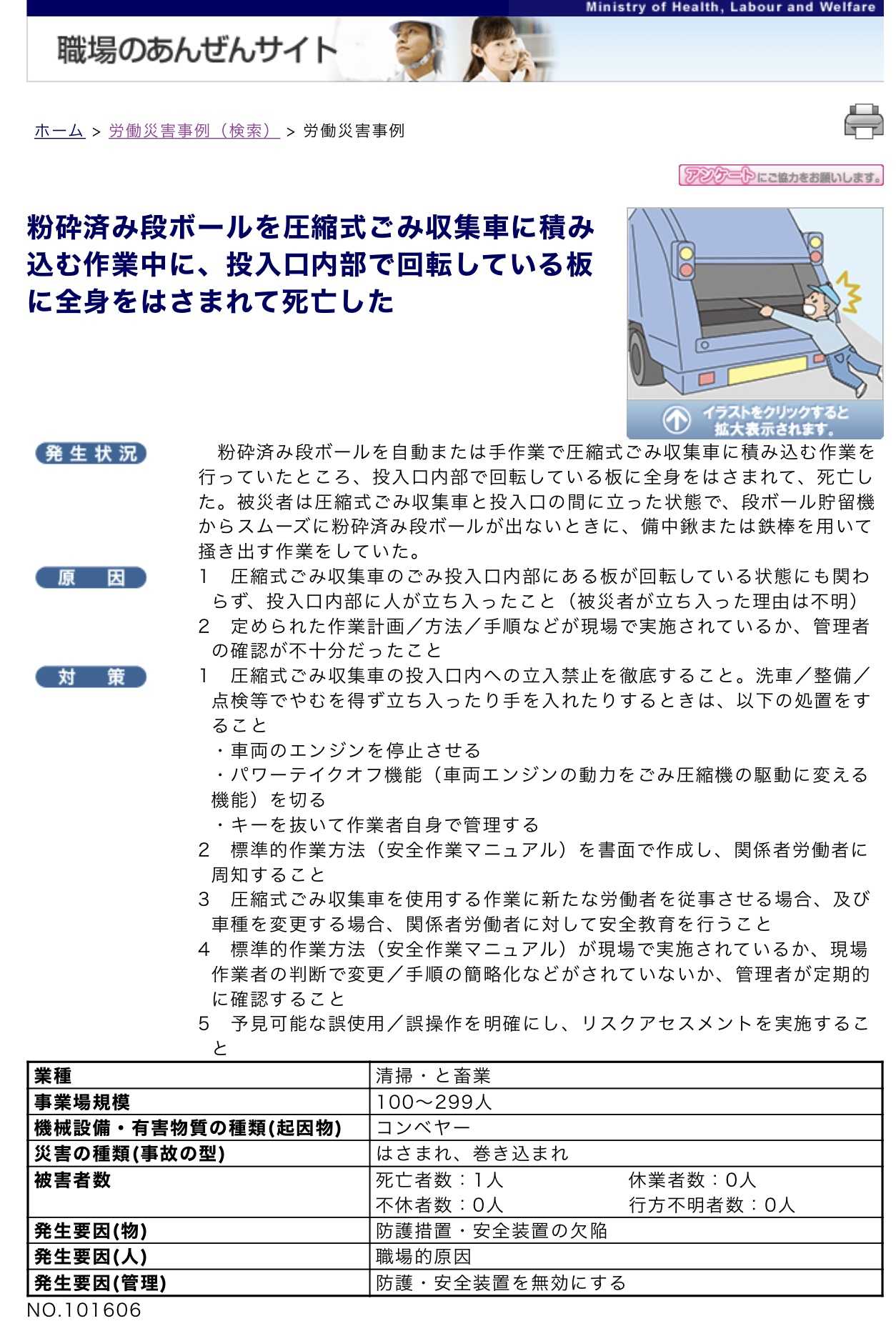 『こうした事故に対し狩野(1959)は「その事故原因として『本人の不注意を喚起し、あるいは安全教育に力を入れるべき』ということで尽きるような考え方が世の中の経営者、技術者、安全管理者には、極めて多いし、これが一般のようである」(p.29)と指摘し、この種の事故が本人の意識・態度を改めるだけでは決して防げないことを強調している。(中略) 中條(2006)は「エラーは人の注意力によって防げる」「エラーは教育・訓練・動機づけによって防げる」という誤解をまず払拭しなければならないと、狩野と全く同じ指摘をしている。』(森 津太子, 星 薫 (2017)『危機の心理学(‘17)』一般財団法人 放送大学教育振興会)(p.42)以上の教科書の引用から考えて、投入口内部に被災者が立ち入った理由は不明とあるのと、事業場規模は100人から299人とあるが作業を1人で行っていたのか、職場の人間関係がどうだったのか、疑問が多い。安全マニュアルの周知徹底だけでは防げない事故だと思った。また、作業慣れによる楽観性バイアスが働いてヒューマンエラーが起きやすくなっていた可能性があるのだろうか。職場の人間関係に起因する事故ならば、向山洋一先生のクラス運営に関する御著書のいくつかを応用したマニュアルを管理者が実践する事で改善して協力関係を高める事が可能だろうか。その都度、機械を停止させるという動作を省いた事も原因と考えるとすると、ノーマンがいうように、「人が悪い?いやデザインが悪い」(Norman,2013)(危機の心理学 p.30)と言える。職場のあんぜんサイトで指摘されている、防御装置や安全装置のデザインや、作業も含めたシステムの見直しと改善はノーマンの指摘と共通すると思う。あと、ヒヤリハットの事例だけだ。事故事例は最新の分だけで5例ある。一応全部目を通しておこう。