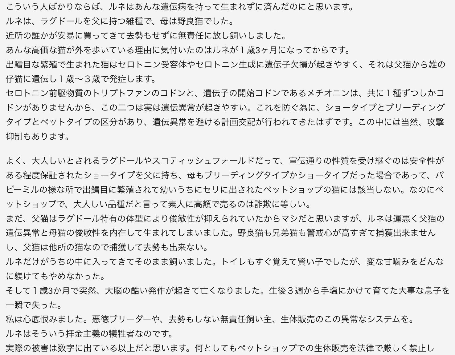 でぃは昨日買って貰ったおもちゃがすごく気に入ったのかどこに行くにも持ち歩き、お昼寝も一緒。ちゃあは、掃除、アカナ追加、水交換、氷交換。排便も排尿も充分で正常。元気も良く毛並みも若々しい。猫じゃらしも随分遊んだ。眠そうだったが、どうにかして氷ベッドに誘った。中々伝わらず苦労したが、気付いてくれたらずっと氷ベッドにへばりついて寝てた。でぃ、おもちゃ投げて遊んであげた。抱きしめて頬擦りすると、でぃもうっとりして甘えてくる。とても癒される。レイジシンドロームの子はこういう当たり前の幸せが得られないまま、自らの多すぎるドーパミンで脳細胞が破壊されていく。一度発作が起きると次からは原因に一貫性のない発作が繰り返される。誰よりも寂しがり屋で甘えん坊で焼きもち焼きのルネには残酷過ぎる病だ。ちゃあとでぃに缶詰をあげた。モンプチ セレクション あらほぐし仕立て ロースト若鶏 85gいなばペットフードとろみ とりささみ野菜入り 80gでぃは夢中になってあっという間に完食。台所に立つと缶詰を催促して鼻なき。ちゃあのだよと言って2fのちゃあに届けると、夢中になって食べた。液体を全て舐めて、具を3分の1食べるとお腹がいっぱいになったのか食べなかった。お座りして見つめている所を見ると食べたいのに入らないといった所か。小食な所はライヤに似ている。ルネなら全部平らげて他の子の分まで食べたがってにゃあにゃあ言っただろうな。