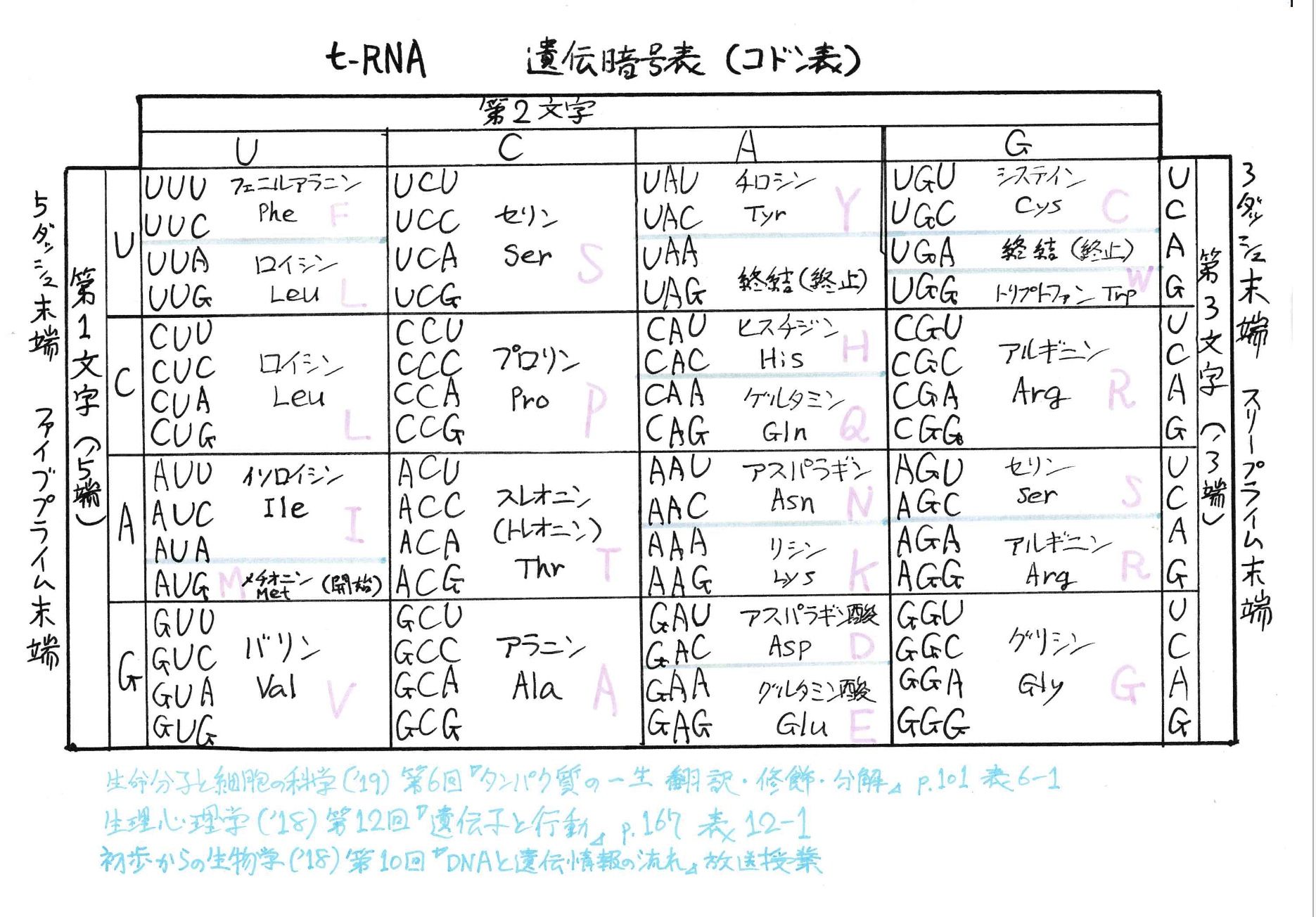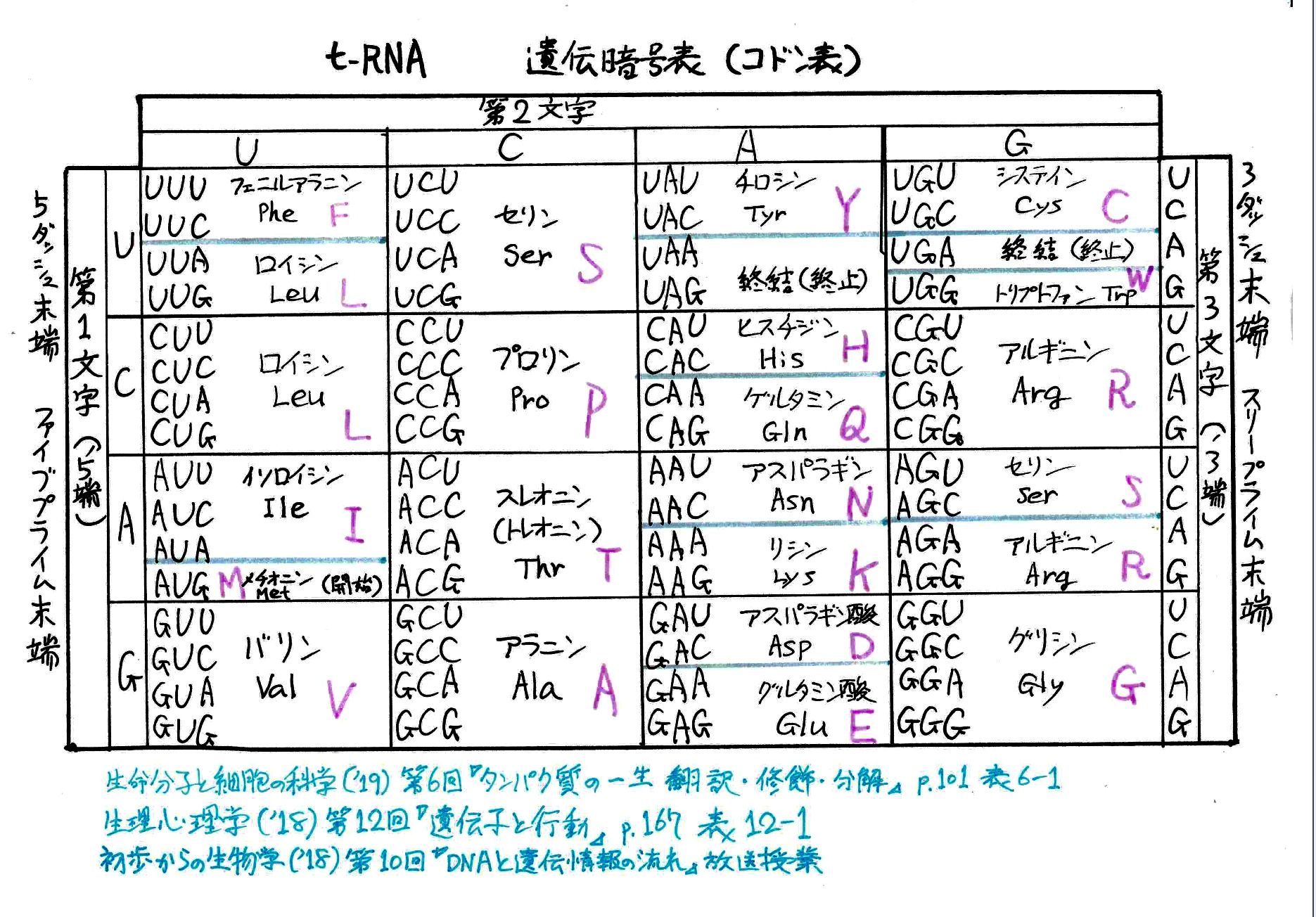 更に画像補正したコドン表。でもInstagramでは一部カットされてしまった。今は更に構造式も一つ追加してある。コドン覚えるアプリにあったやつだ。構造式は3種類ぐらいあるのか。