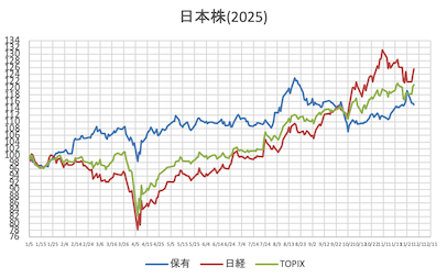 様子見日経寄与(大きい順に4銘柄)①寄付きアドテス(-224.62)ファーストリテ(+77.81)TEL(-52.14)SBG(+18.05)②前引けSBG(+81.22)ファーストリテ(+77.81)フジクラ(+18.89)コナミ(+13.20)③大引けTEL(-62.17)アドテス(-29.41)ファーストリテ(+28.08)イビデン(-16.71)前日比①寄付き保有株 =+0.59%日経平均 =-0.73%(48,328.82)(前日比-358.38)(保有株-日経平均=+1.32%)TOPIX =-0.56%( 3,231.59)(前日比-18.28)(保有株-TOPIX =+1.15%)②前引け保有株 =+0.78%日経平均 =+0.70%(49,077.49)(前日比+341.73)(保有株-日経平均=+0.08%)TOPIX =+0.75%( 3,275.36)(前日比+24.26)(保有株-TOPIX =+0.03%)③大引け保有株 =+0.44%日経平均 =-0.33%(48,537.70)(前日比-165.28)(保有株-日経平均=+0.77%)TOPIX =-0.17%( 3,245.58)(前日比-5.52)(保有株-TOPIX =+0.61%)