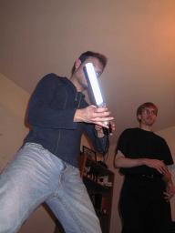 金曜の夜、カフェで彼氏と本を読んでいると彼氏の友達のマイクがやってきた。マイクは彼氏と同じ大学院の数学の博士課程の生徒。見た目はいかにもがり勉タイプだが私の周りのアメリカ人には珍しく礼儀正しく控えめな所がハニーバニ的にはどこか日本人っぽく思えて好感が持てる。その夜急遽「ビデオでも借りてみんなで観よう」という話になった。ビデオも借りて部屋に戻ってきたところで前回の日記に書いたスターウォーズ・ゲームの話になった。マイクも彼氏と同様スターウォーズ・ファン。早速ゲームを始める3人。誰一人「映画を観よう」とは言わず気がついた時には午前5時。午後の11時半から初めて5時間半。3人交代で戦った。それが今日の写真。マイクが彼氏と一服してワインを飲んでうちのアパートを後にしたのは午前6時だった。見た目は真面目だけどいつも付き合いが良いところがマイクの魅力である。ちなみに真ん中の写真がマイクです。