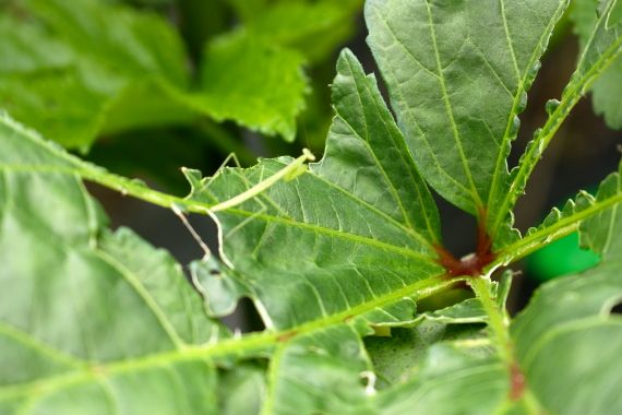 まずは、ちいさなカマキリ画像虫食いだらけの悲しいオクラの葉の上に、ちょこんと居ました。頑張って害虫を退治してください。本日の収穫彩りよく収穫できました。極端に曲がったきゅうりは、茎をネットにクリップしていたら、その隙間に入り込んで変に成長していた赤ちゃんきゅうりの成長した姿。少し色が悪いです。今日はずっと曇り予報だったので、早起きせずにゆっくり時間でBT剤散布雨続きで散布していなかったので、ナスやピーマンが穴だらけですが犯人見つかりません。カマキリ画像のように、悲惨な葉っぱのオクラも少しずつ成長。去年も今年も両脇に支柱建てて、紐を張って、それにオクラを誘引していましたが、色々面倒なことが起きたので、1本に1本支柱を立てることに。オリジナル鋼管竹 径16mm×長さ180cm 50本(園芸支柱 イボ竹 園芸 支柱 園芸用支柱 農業用 園芸用 農業資材 花 野菜 畑 庭 園芸用品 家庭菜園 トマト キュウリ ピーマン 山芋 誘引 菊 カーネーション 観葉植物 花卉 梨 桃 みかん ぶどう 矯正 つる 農業 園芸道具 園芸用具)価格:6000円(税込、送料別) (2019/7/6時点)楽天で購入先日、こちらの支柱をまとめ買いし、本日1本1本に支柱を立てて誘引しました。ブルーベリーは画像を撮るの忘れましたが、青く色づいた粒も出てきました。【ポイント5倍】【プロトリーフ】ブルーベリーの肥料 2kg価格:980円(税込、送料別) (2019/7/6時点)楽天で購入7月になったので、説明に従い肥料撒き。そろそろ、ネットを設置しないと、鳥につつかれひどいことになりそうです。