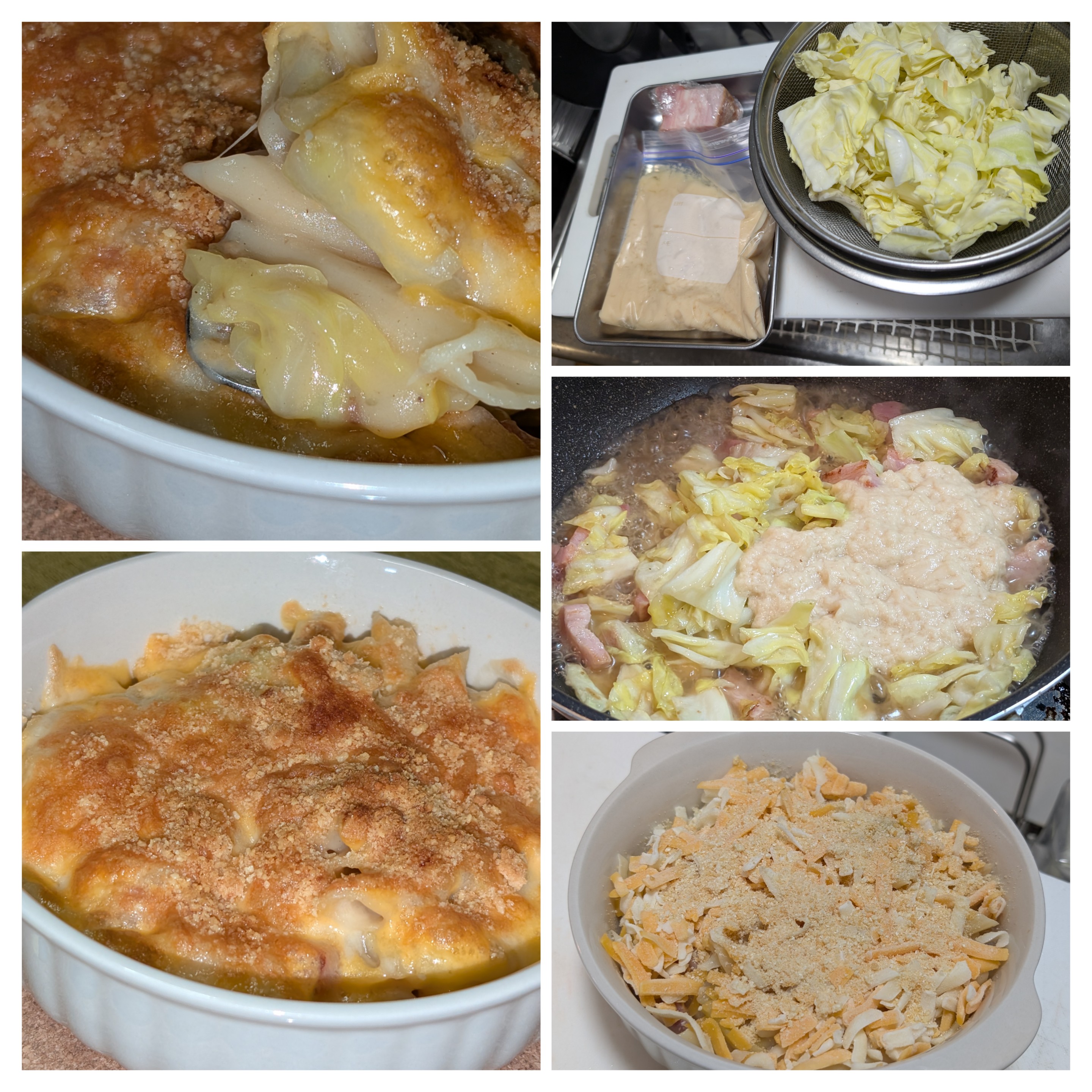 お家🏠にあった材料でクッキング材料、冷凍保存のベーコン🥓、まとめて作って小分けしているホワイトソース、キャベツ🥬芯付近在庫のペンネを塩水でボイルオリーブオイルににんにく🧄の香りをうつしてベーコンとキャベツを炒めますちょろっとしなってきたらホワイトソース投入お好みの味付けしてペンネ投入グラタン皿に移してチーズ🧀たっぷり乗せてオーブントースターでチーズ🧀に焼き目がついたらお家🏠材料で🇮🇹イタリアン😋お高いお野菜最後まで使うオッサンクッキングオッサン一人飯🍚なので明日もグラタン😋明日はチーズ🧀の種類変えてこ〜🤪