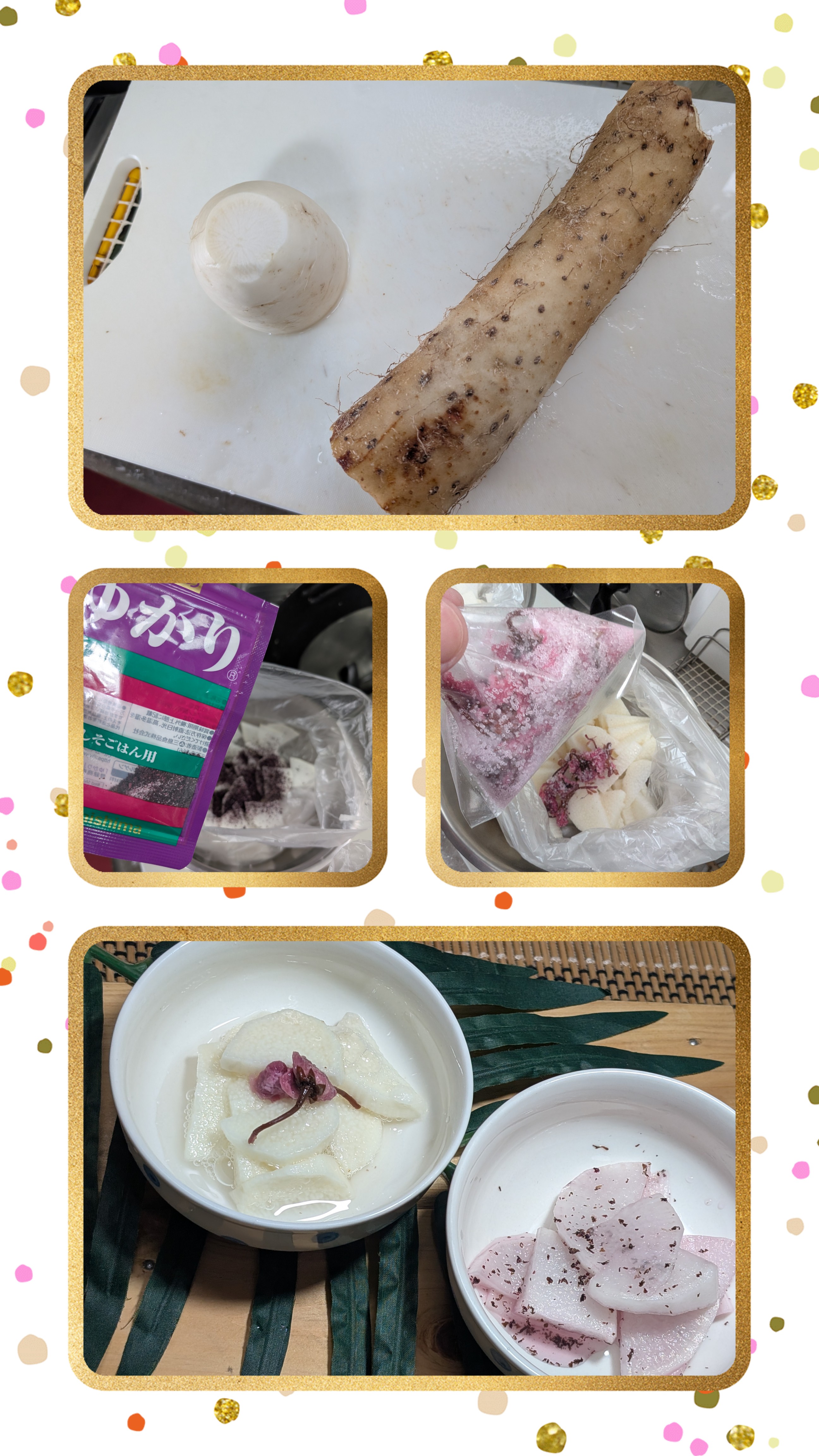 桜🌸の季節、隅田川沿い在住🏠のオッサンです✨野菜は何でも良いのですが🤔今回は大根と長芋ざっくりカットしてビニール袋にまずは長芋、かっぱ橋で購入した桜🌸の花の塩漬け、花と塩を投入、塩味を抑えた香り重視仕上げにしたいので水を少し注いで大根はゆかりでシソ風味、同じようにお水を少々ビニール袋をギュッと縛って冷蔵庫で一晩😴桜🌸の香りのうっすら塩味のサラダ風のお漬物これはオススメです✨ゆかりは¥100均一でも売っているのでお好みのお野菜に和えれば美味しいですよ〜春の浅漬いかがでしょうか🥰