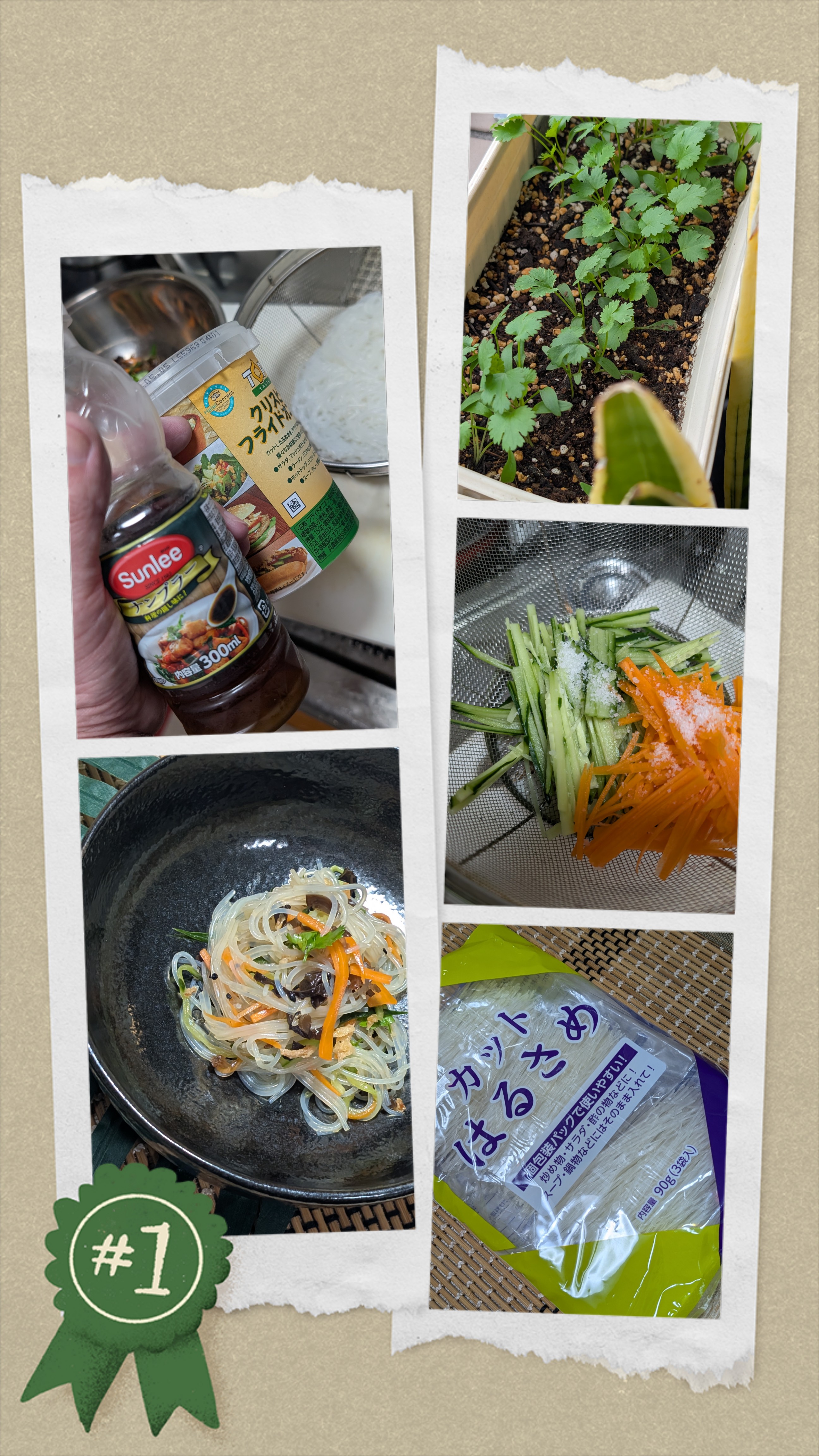 ほぼ業務スーパーの激安材料です✨今回はちょっとお手間をかけます😤業務スーパーの激安木耳を戻していきます。戻ってきたら軽く揉み洗い、、、ここまで濁ります😰ここがお手間で濁ら無くなるまで洗いましょう😤嫌な匂いがとれます😁今回サラダ🥗なので🤗きゅうり🥒人参🥕を千切り、軽く塩を降って軽くもんで冷蔵庫で数時間〜一晩😴余分な水分を抜きます🫡この一手間大切なんですポテトサラダやマカロ二サラダ、、、出来立ては良いけど次の日、、、水が出てベチャベチャ😱ここの一手間で作り立てを作り置き🥰業務スーパーの激安春雨、3パックに分かれていてとてもご親切🤗春雨をボイルしてベランダ菜園の今年最初のパクチー🌿サッと洗って🥒🥕の水をギュッと絞って業務スーパーのナンプラーとフライドオニオン、ライムジュース、塩、ラー油、醤油 等で味つけ黒ゴマも足して混ぜるだけピリ辛🇹🇭タイ風春雨サラダ🥗の完成です✨