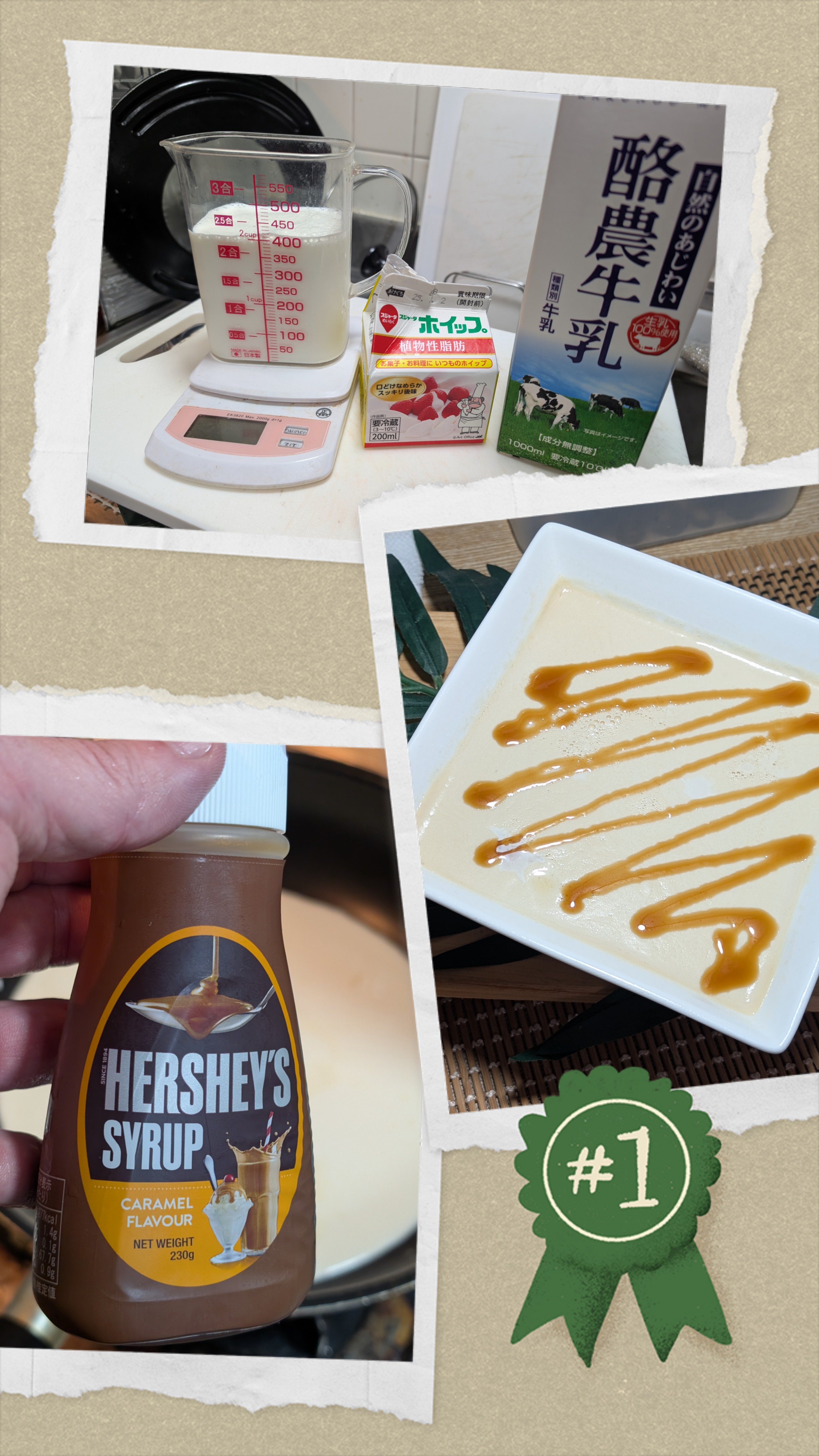 キャラメルソース消費メニュー🫡牛乳300cc 生クリーム100cc粉ゼラチン4g鍋に投入😲で加熱🔥お家🏠にあったキャラメルシロップで甘味づけ加熱🔥しながら混ぜながらお好みの甘味材料でOKです✨沸騰させずに混ぜながら、3分程度かと、、、ちょろっとグラニュー糖で甘味を足して茶濾しで濾しながら、器に≒400CCの巨大パンナコッタ🤯予熱を取ったら冷蔵庫で🛌キャラメルソースをトッピングして特大キャラメルパンナコッタ🇮🇹の完成です✨