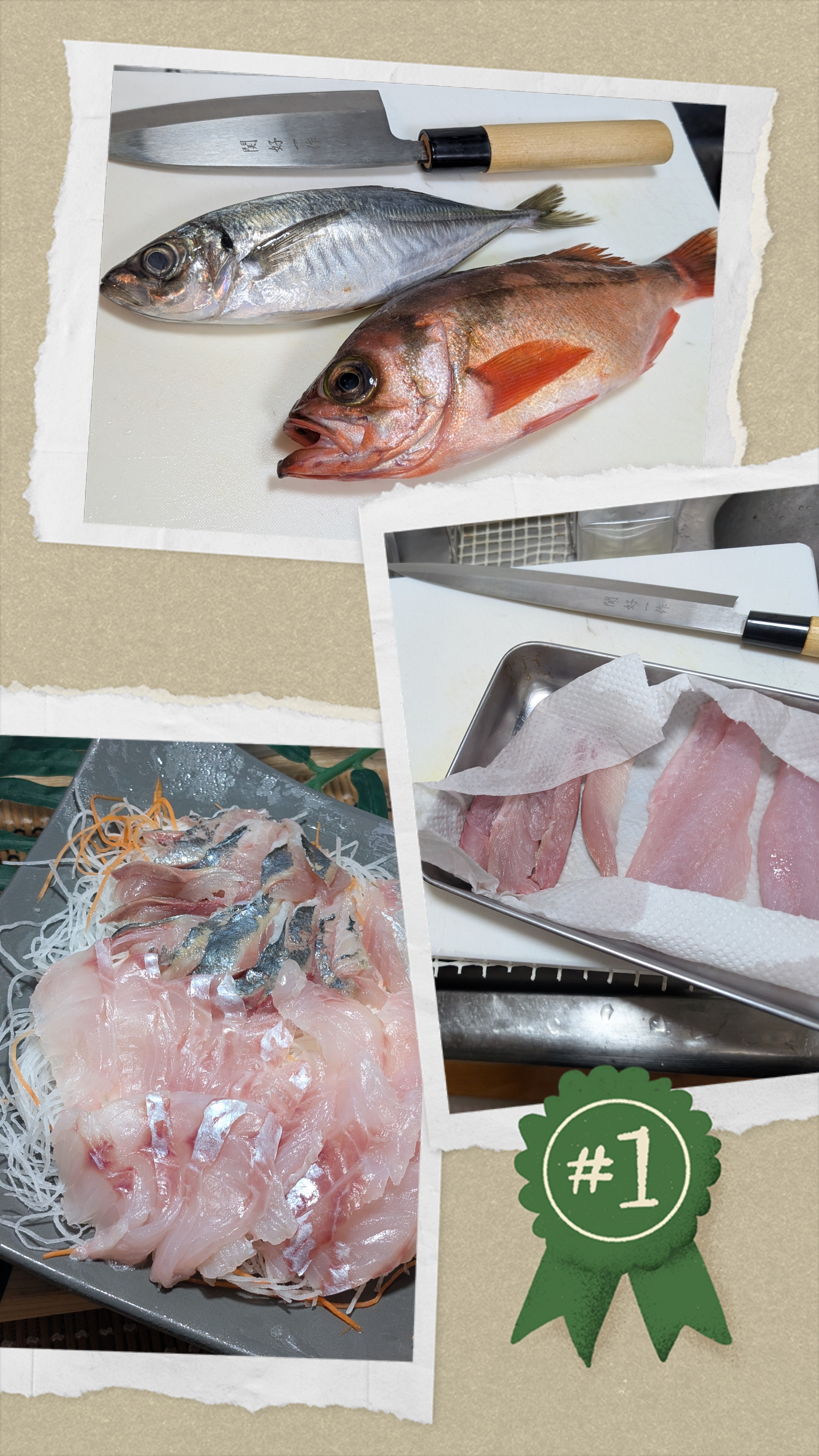 いつもの近所のスーパーライフでメジナ¥680 アジ¥130🤔 お安いお刺身が無性に食べたくなって、、、取り敢えず3枚におろしていって皮剥いで柵取りつまはパックで購入😅柵取り完了メジナのお刺身アジのお刺身大葉等の🟢🌿物、、、買うの忘れた😭まだベランダ菜園蕾だった😰漁師🚣飯の様な豪快盛りでご飯🍚が進む君でした~😋