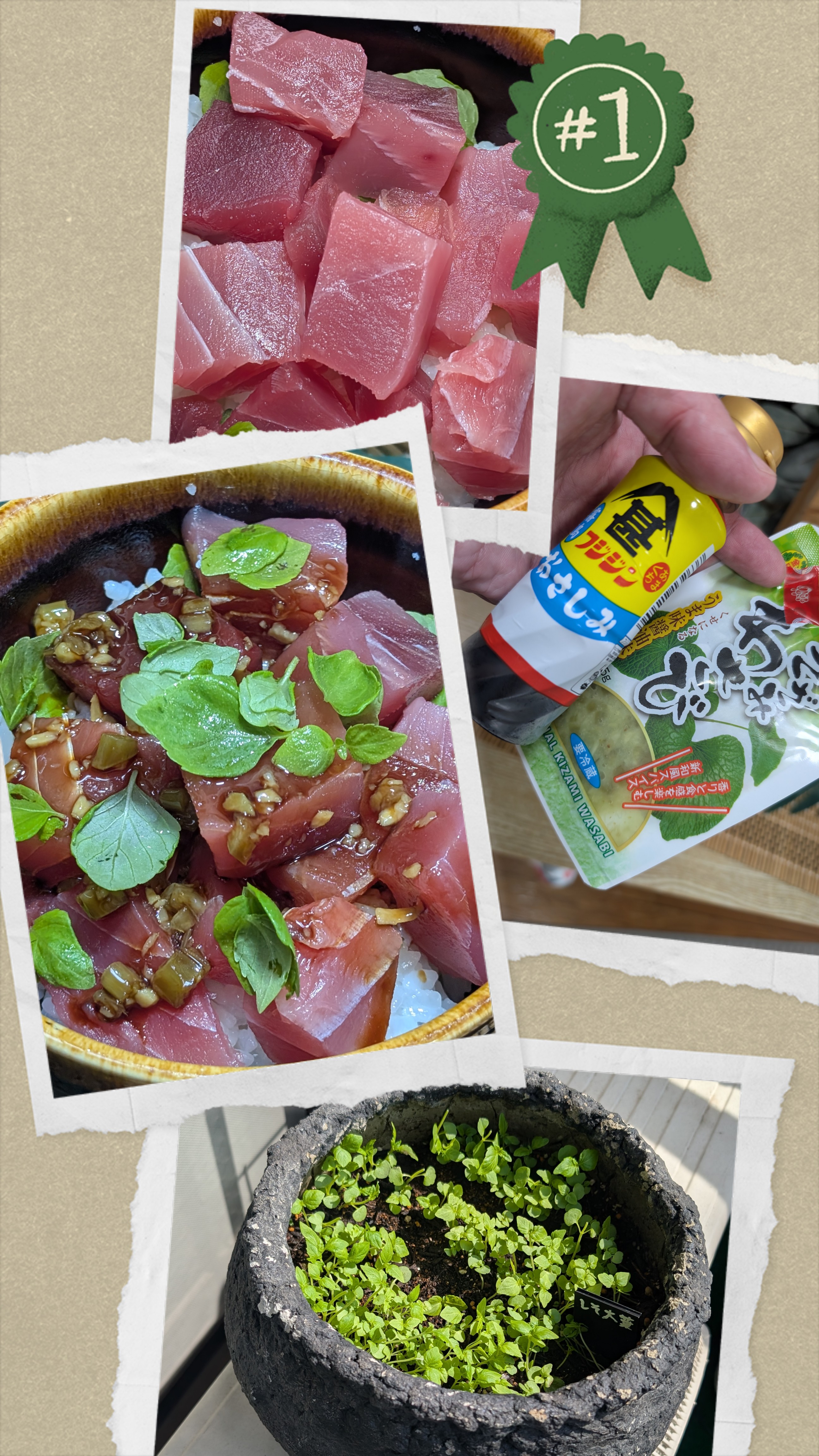 あまり海鮮系の「丼」は好みではないオッサンですが、、、ふと食べたくなって、米炊開始😤家庭菜園の大葉が育ってきました。今年も早い😲先に育った大きめのお子様青じそを摘んでサッと洗って醤油ダレは、霧島の甘い刺身醤油と辛味と風味が美味しい刻みわさびで😚ちょっと関東🤔の刺身醤油で調整炊きたてご飯🍚、お正月の残りのもち米と無洗米を3対7で炊いて、大葉を散らしてスーパーで激安マグロブツをたっぷり乗せてタレと大葉をたっぷりかけて甘辛ダレの「マグロ丼」の完成です✨