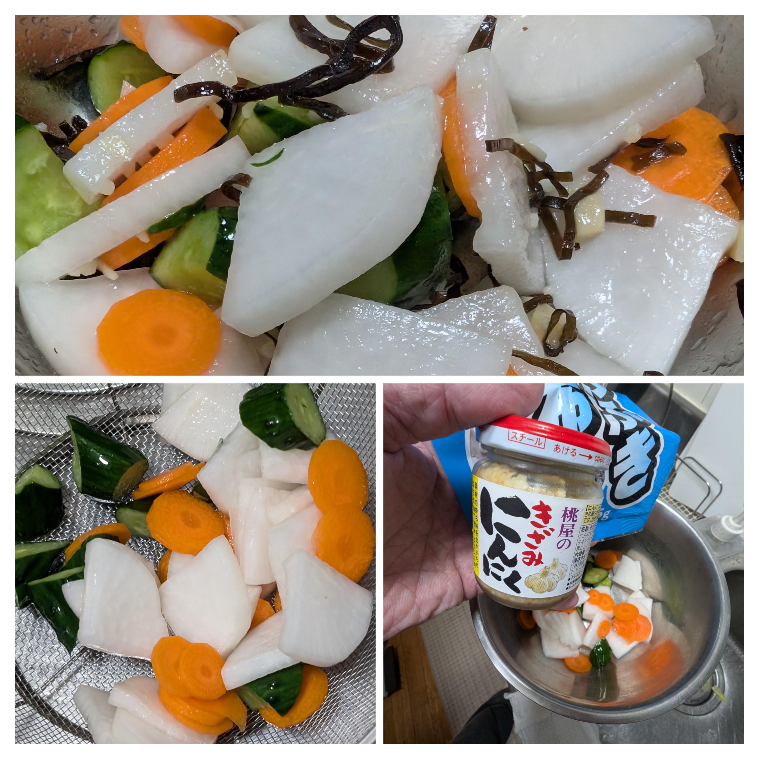 老若男女🍚でも🍻🍶でも🥳ビニール袋にお野菜を、今回は胡瓜🥒人参🥕大根で、軽く塩を降ってフリフリ😜ビニール袋をキュッと縛って冷蔵庫で数時間水分抜きと軽く塩味ザルに開けて水を切ってうっすら塩味はついているので、きざみにんにく➕️塩昆布で後は混ぜるだけ🫡お好みで、胡麻油やラー油も合いますよ♥サクッと1品です✨