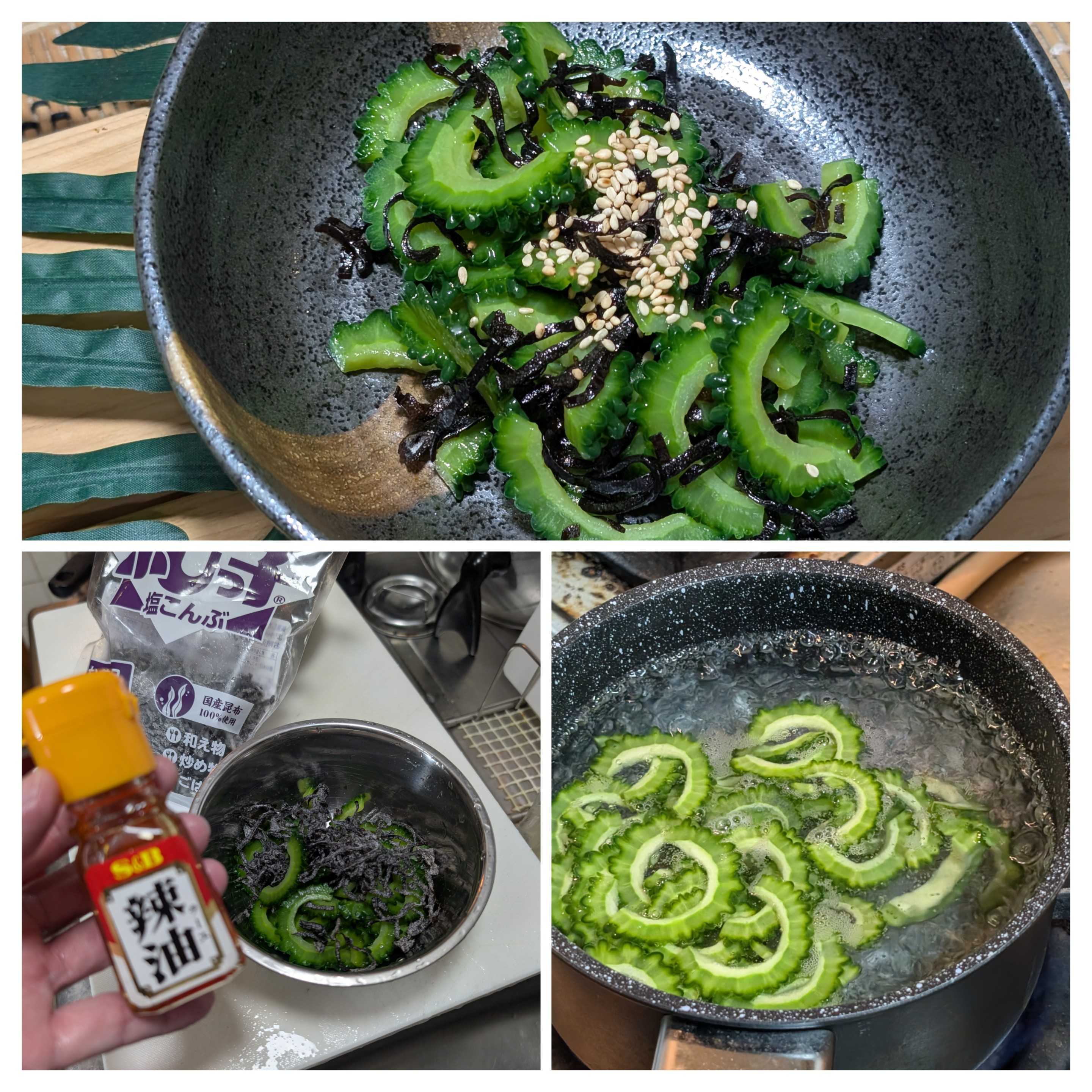 お手軽簡単クッキング2/3はゴーヤチャンプルに😜軽く塩茹でします良く水を切ってゴーヤ、塩昆布、辣油で和えるだけほろ苦いゴーヤ🥒と塩昆布の塩味と旨味、辣油で締めてごまパラパラで美味で御座います😋