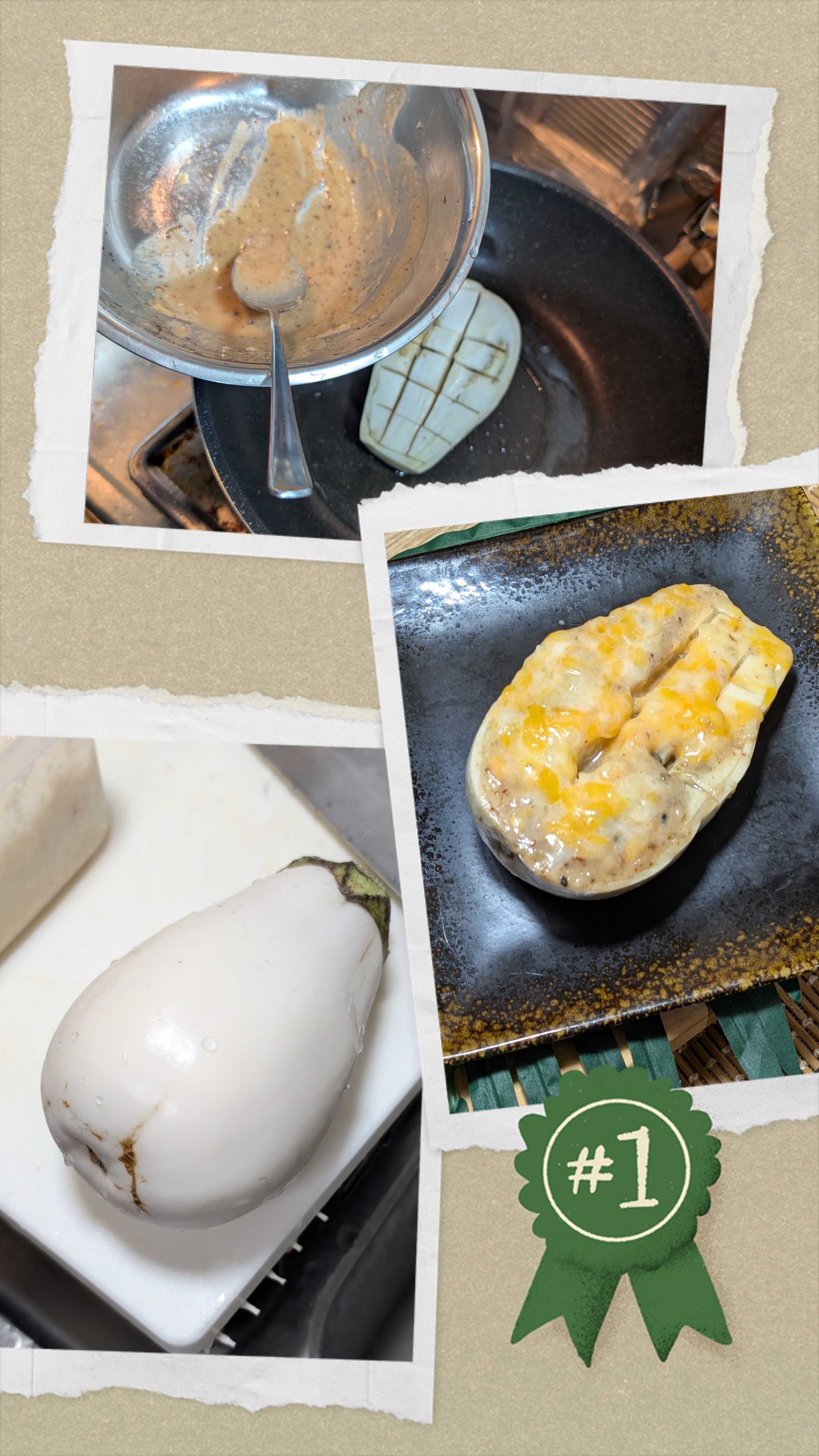 白ナス発見今年は良く近所のスーパーで白ナスを見かけるので半分に切って切り込みをオリーブオイルで両面焼きます蓋をして蒸らし焼き白味噌、白ごま、酒、七味🌶️で合わせ味噌合わせ味噌を塗って、チーズ🧀を乗せて更に蒸し焼き、チーズ🧀が溶けたらピリ辛味噌とチーズ🧀のハーモニー😍是非お試しあ〜れ〜
