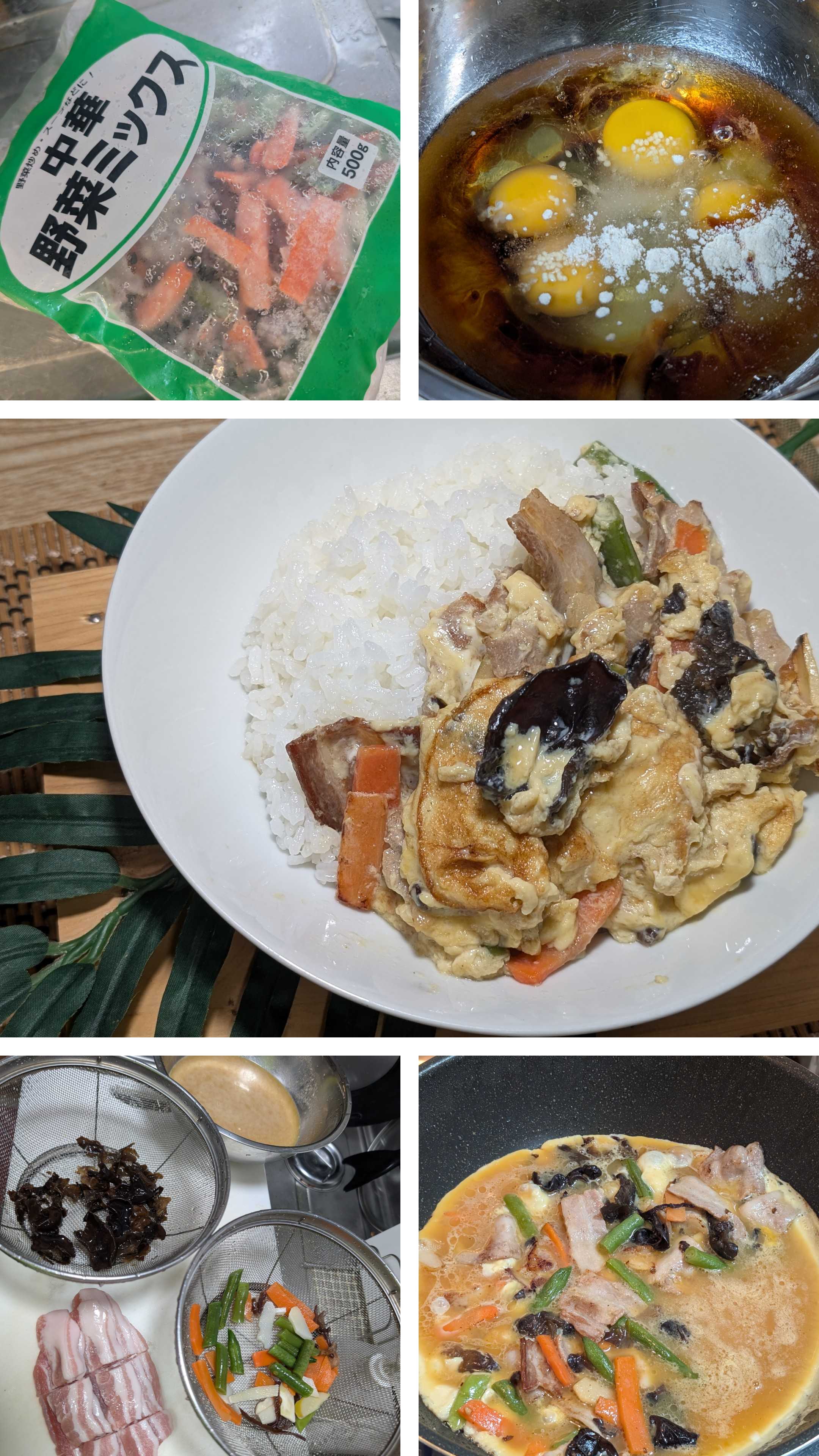 業務スーパー激安材料で😍業務スーパーの激安冷凍野菜MIX全卵に上湯、鶏ガラ、醤油、塩胡椒、水よ〜く混ぜておきます木耳も業務スーパー激安です✨サッと豚肉を炒めます、冷凍野菜、木耳を投入、軽く塩卵液投入、回りからゴムベラではがすようにふわっと玉子お手軽激安「木須肉」木耳玉子炒めの完成です✨