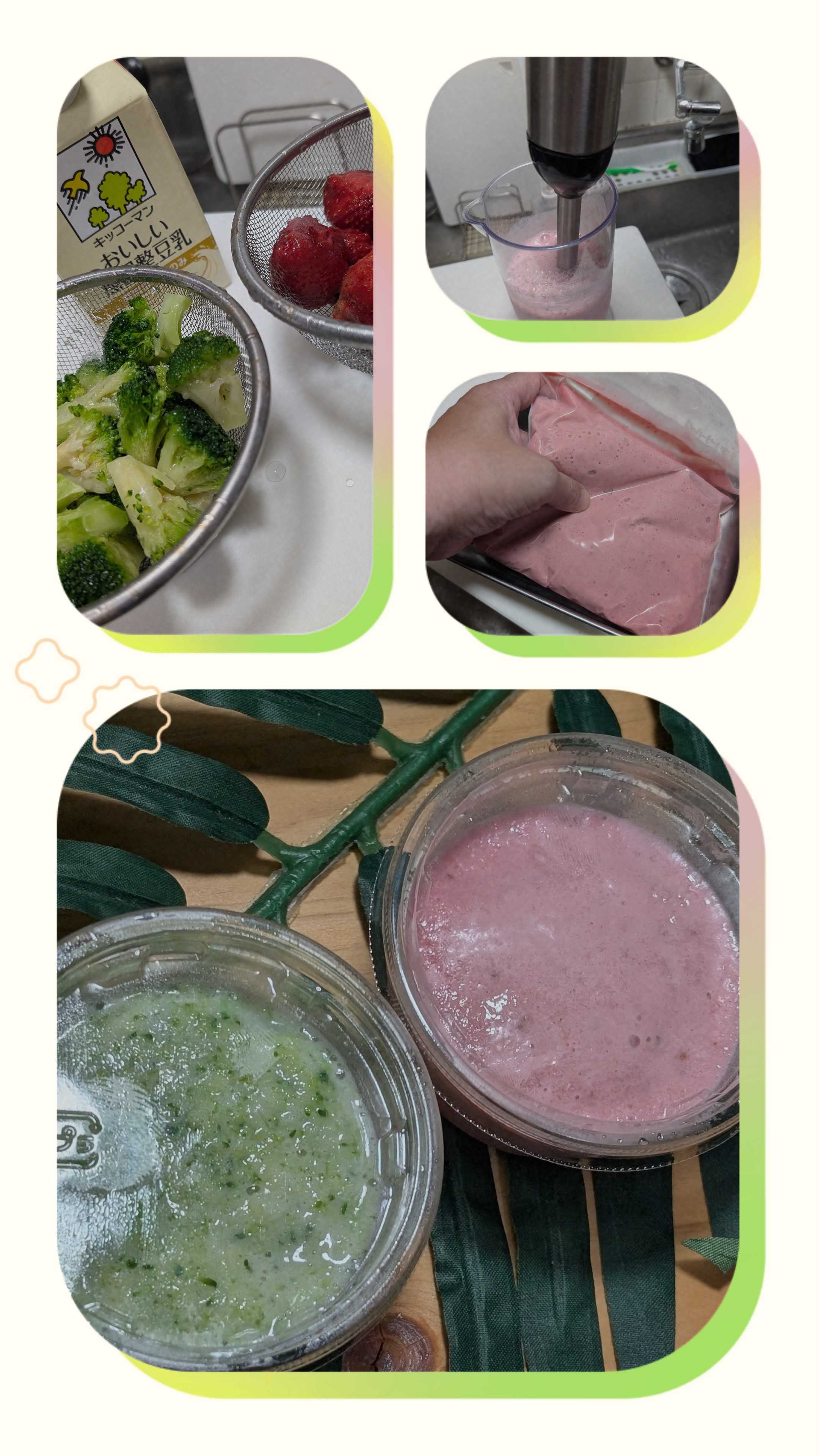 ひょんな事から、、、ワンちゃん🐕️のアイスクリームを作る事に😜無調整豆乳と、冷凍ブロッコリー🥦、ストロベリー🍓初挑戦なので手探りで😅豆乳に冷凍ストロベリー🍓ブレンダーかけて味確認甘すぎ要注意なので、きび砂糖を味見しながら投入すごーく甘さ控えめストロベリー🍓アイスクリーム甘いの苦手な方にはピッタリ甘味位かも🦆ジップロックに入れて冷蔵庫で🛌同様にブロッコリー🥦も作りました。ワンちゃん🐕️がお野菜苦手と言う事なので克服のキッカケにもしなったらと、、、こちらは、きび砂糖、三温糖、グラニュー糖をブレンドしてなるべく青臭さを控えめに🥰60分前後で凍ってきたらモミモミモミモミシャリシャリになったら器に小分けブロッコリー🥦とストロベリー🍓の豆乳ワンちゃん🐕️アイスクリームの完成です✨ワンちゃん🐕️用、、、甘いの苦手だけどアイスクリーム🍨食べたい「人間対応🤪」でございます😊お友達のワンちゃん🐕️🥰 rrちゃん😘食べてくれたら嬉しいです✨
