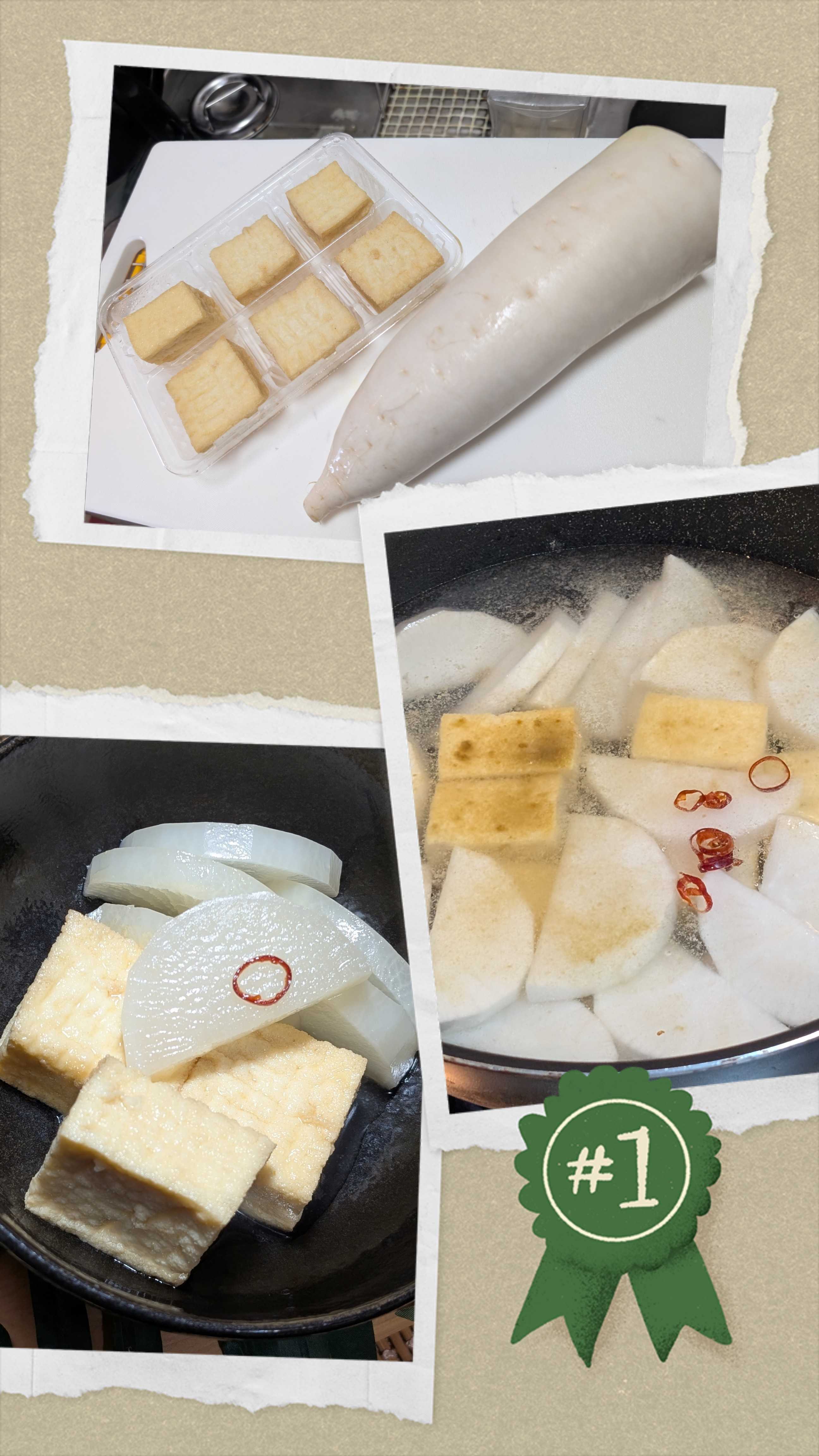 お手軽簡単激安で本格的な煮物クッキング🫡スーパーで見切り&値引き品😜お鍋に大根、厚揚げ、ひたひたお水昆布茶と塩、お好みで唐辛子🌶️こんだけです✨じっくりコトコト煮込んで、一度クールダウン😲再度加熱で味がしみて美味しくなります♥温🔥冷❄️どちらでも美味しいかと昆布茶と塩のみクッキングでした~