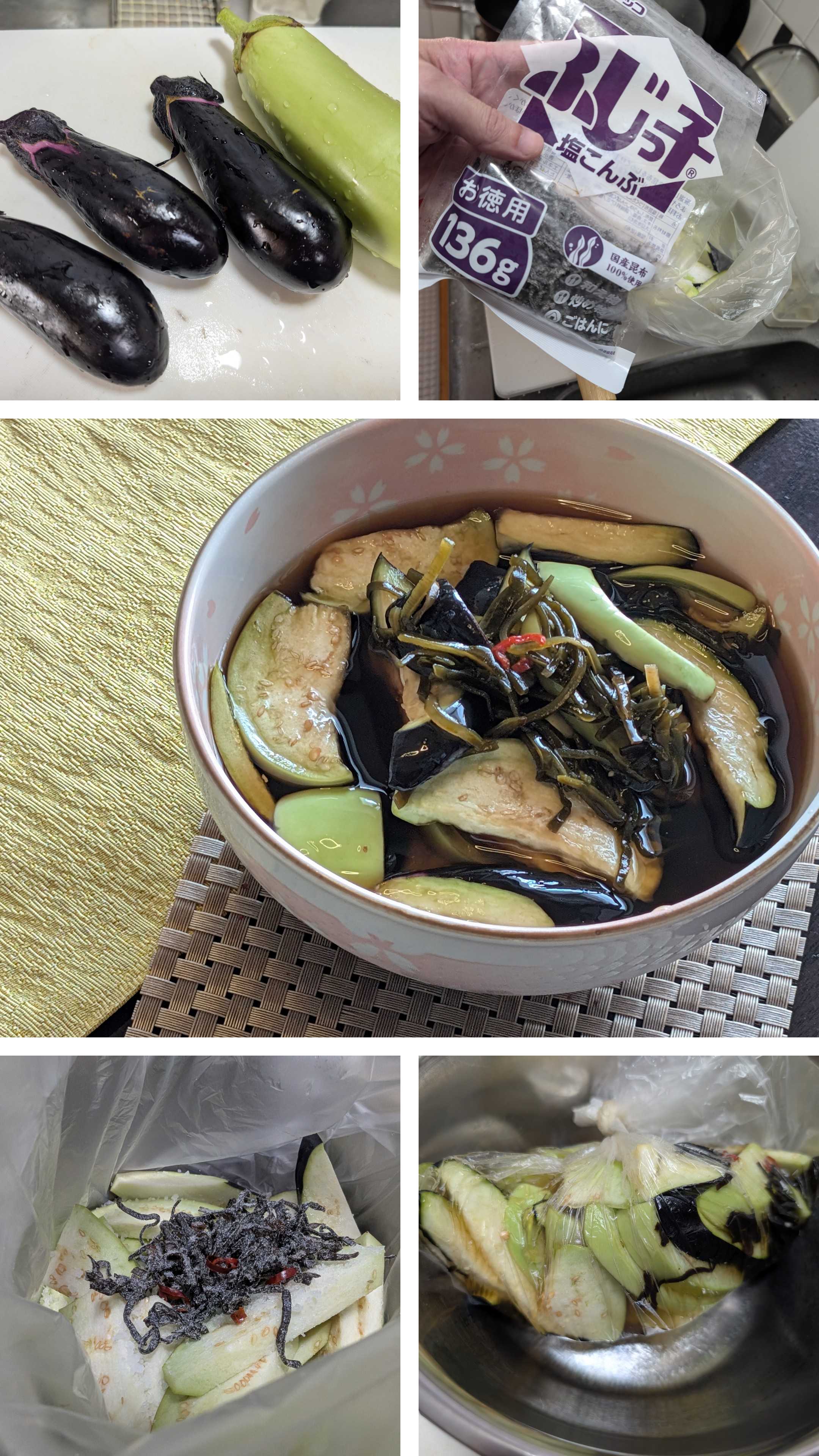 2色の🍆と塩昆布漬けてみたご近所スーパーの生産者コーナーでお安かったので、後ナス味噌🍆🫑炒め作るのでいつものようにビニール袋に🍆入れて美味しいお塩でお漬物塩昆布あったので投入唐辛子🌶️をちょっと入れて、水もちょっとフリフリシェイクしてギュッと縛って冷蔵庫で数時間🛌美味しいお塩と塩昆布の甘み出汁が出て、、、大成功の🍆と昆布のお漬物の完成です✨
