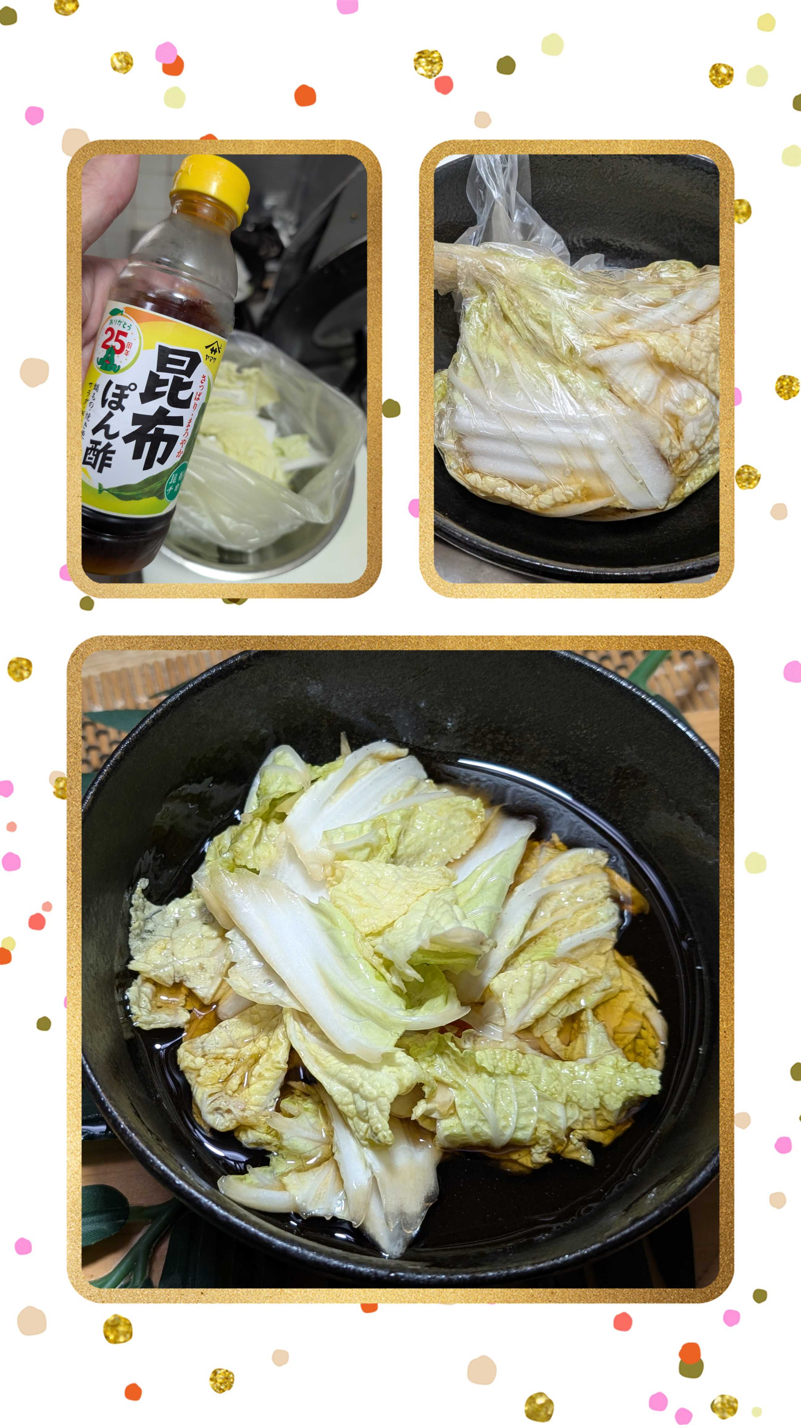 ちょろっと白菜あったので冷蔵庫にあったポン酢ポン酢、塩、和風顆粒だし、水とビニール袋にフリフリシェイクして、ギュッと縛って冷蔵庫で2〜3時間今回、、、始めてノリでつくったのですが、、、是非😲お試しあ〜れ🥰