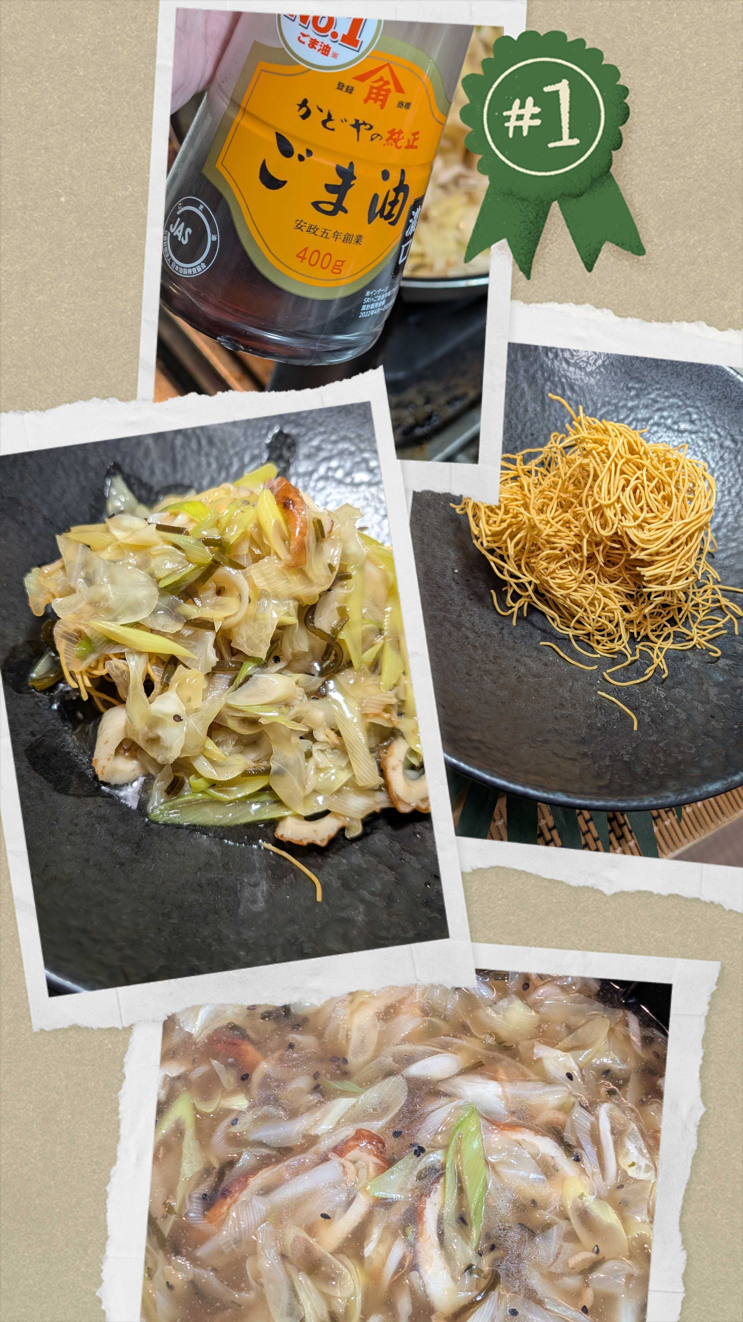 冷蔵庫にネギが、、、キャベツもあったのでかっとして冷蔵庫漁って出てきた子達サッと炒めて野菜投入お水を゙入れて和風だし等で味つけ良い感じに煮込んで水溶き片栗粉でトロミをつけて仕上げはごま油1周市販の皿うどんの麺たっぷり餡をかけて完成です✨