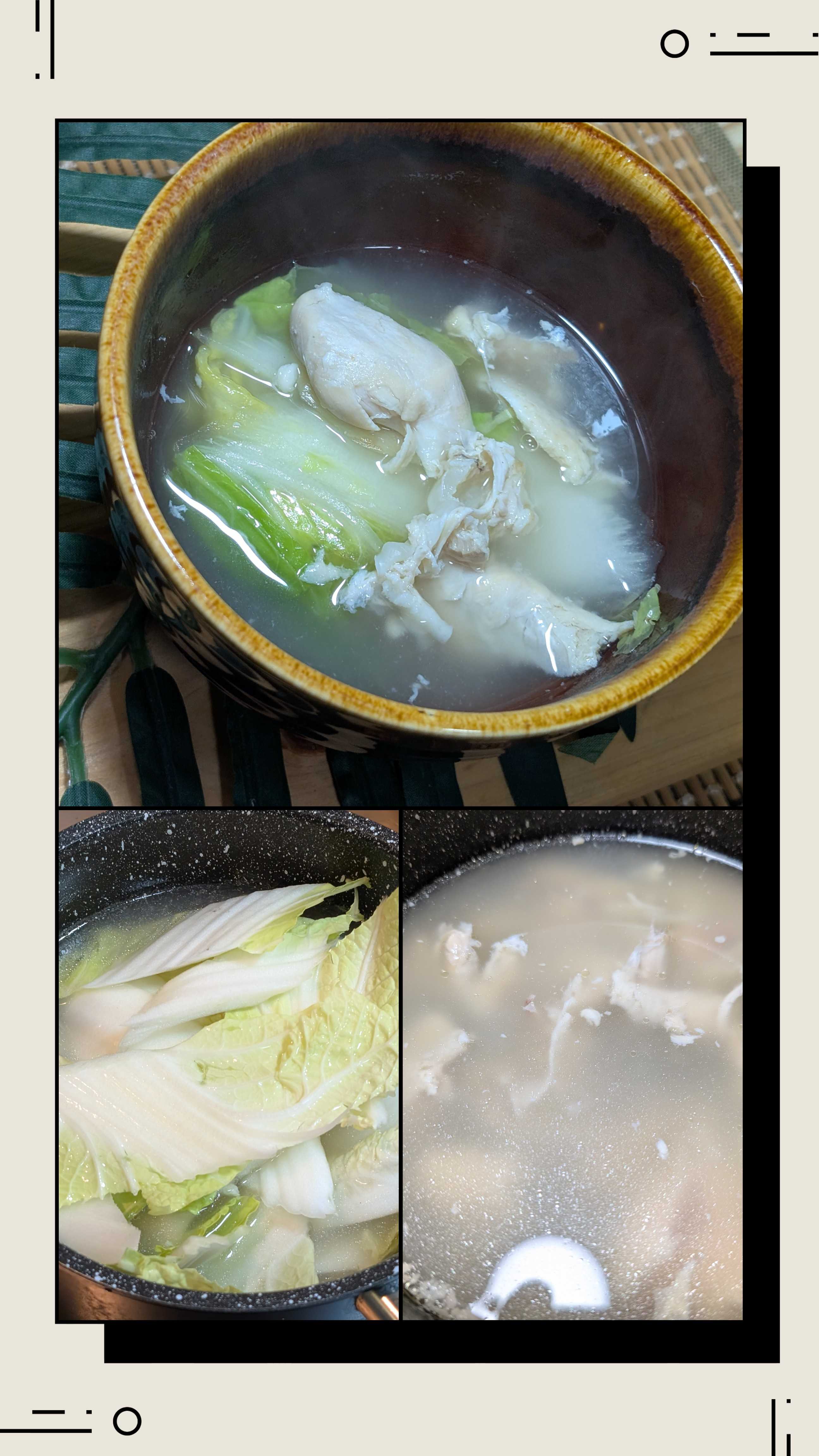 スープストックからの以前作って冷凍保存していた🐔コラーゲンスープここから再度🔥を入れてちょいと詰めていきます再度🔥詰めて骨から身が持ち上げただけでサクッと外れます白菜🥬を投入、一煮立したらスーパー🐔コラーゲン白菜🥬スープの完成です✨お肌プルプル、、、オッサン😰