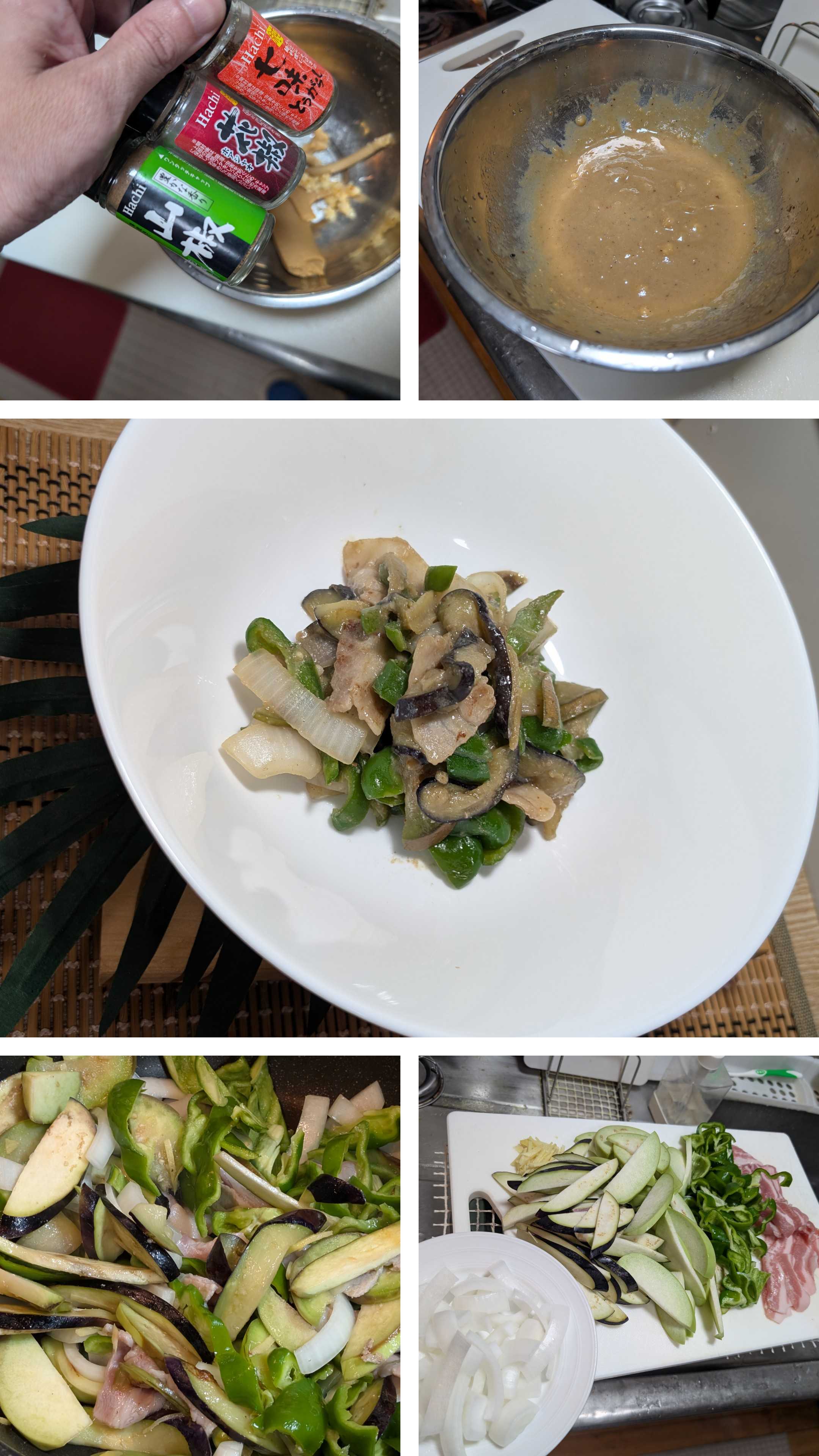 サクッとナス味噌🍆お手軽簡単クッキングまずは、味噌ダレ、基本は味噌、酒、味醂お好みで中華系だしや和風だし顆粒で十分今回は基本+上湯、鶏ガラと↑3種😜よく混ぜておきます今回は白ナスと🍆+🧅、🫑、🐷🥩ナス🍆に油をコーティングするように炒めて他の材料も投入味噌ダレ投入、味をみながらで😋味つけはここで一発お手軽簡単クッキング最初に味噌ダレ作っておけばお手軽お気軽お料理かと😃お手軽オッサンクッキング「ナス🍆ピーマン🫑玉葱🧅豚🐷」炒めでした~