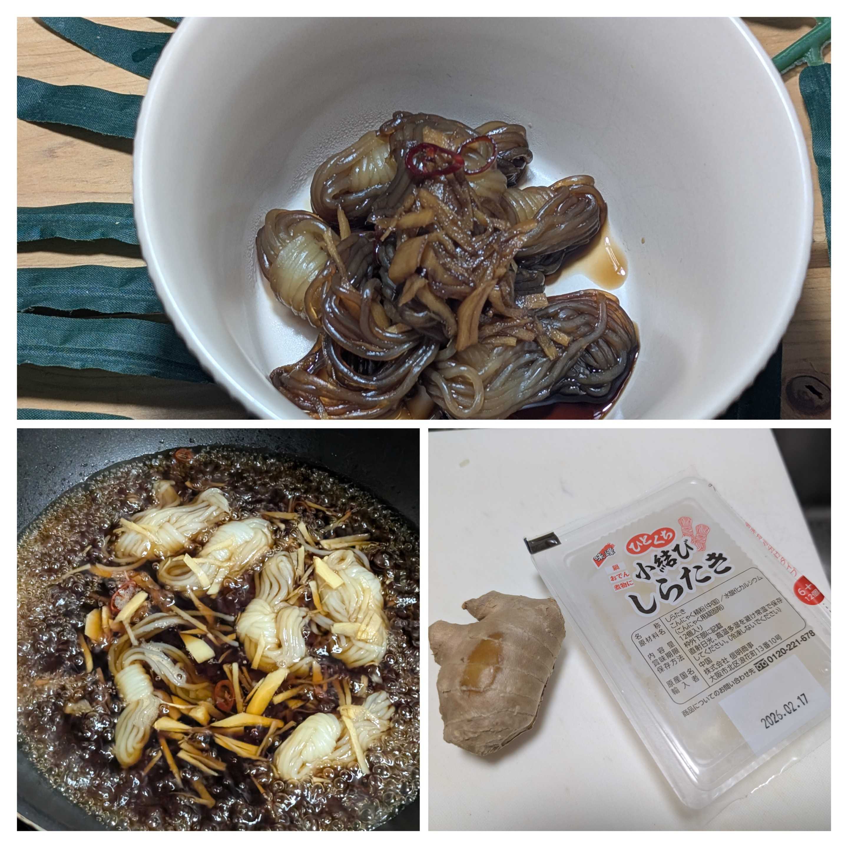 先日の肉じゃがの残りの白滝が😱中途半端な少量残し、生姜🫚があったので酒、水、白だし、ザラメ糖、塩で煮込んでいきます詰まってきたので味調整、辛味足しで唐辛子🌶️追加もうほぼ完成、お酒🍶の当てに最高本当にちょろっとの残り物も創意工夫で白滝と生姜🫚の甘辛佃煮風の完成です✨
