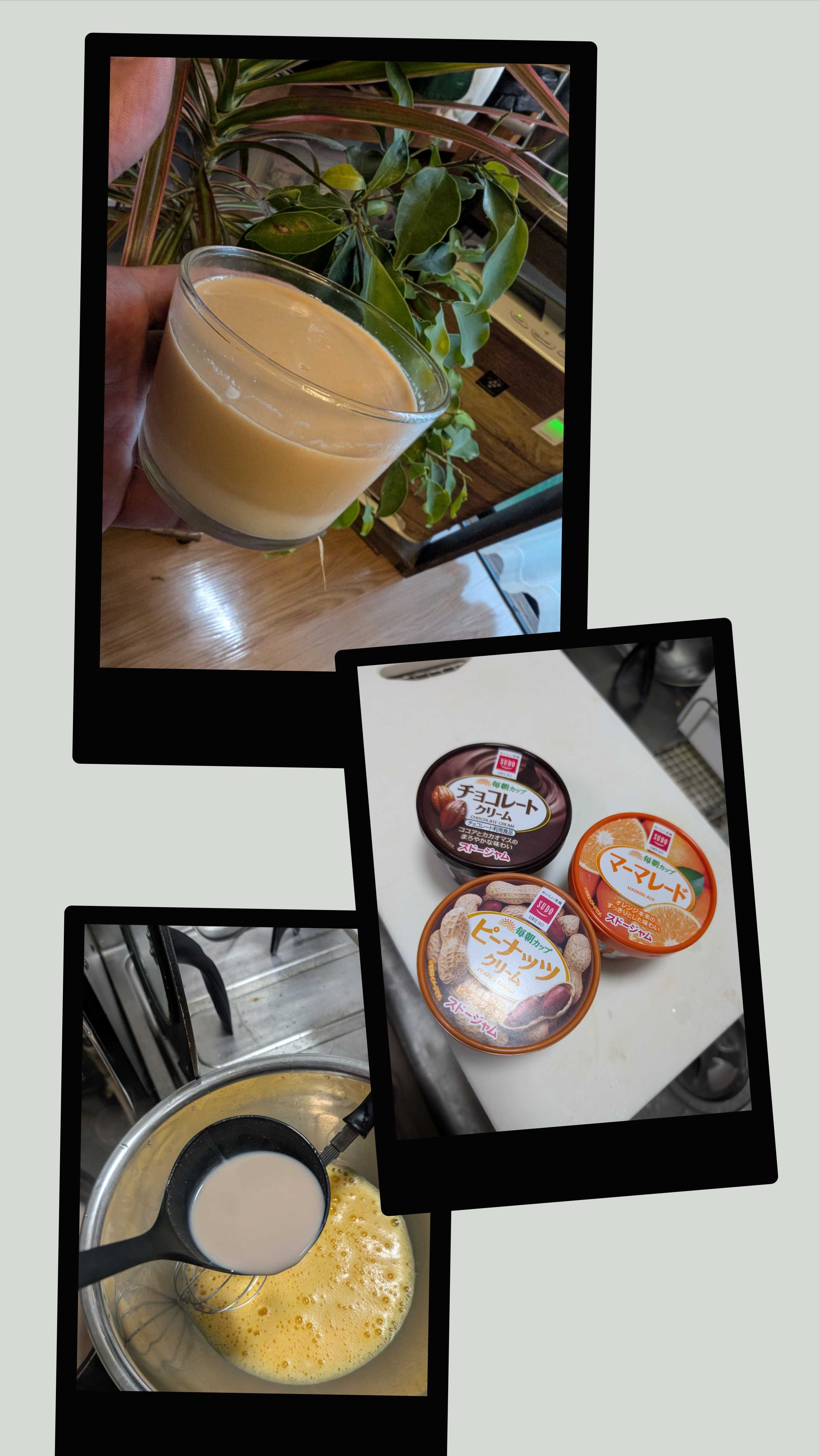 お手軽簡単オッサンスィーツ作ってみたご近所スーパーで激安購入のジャム達、🍞に塗って食べていたのですが、一人暮らしのオッサン消費が厳しいので、、、まずは牛乳にマーマレード🍊、粉ゼラチンを入れて加熱🔥すぐ温かくなるので混ぜながら沸騰注意⚠️器に🍊マーマレードゼリーを注いで冷蔵庫🛌お次は簡単プリン🍮牛乳、ピーナッツ🥜クリームとチョコレート🍫クリームを沸騰させないように混ぜながら、お好みで甘味➕️全卵をよく混ぜておきます予熱がとれたら、水でふやかして電子レンジで数秒で溶かした粉ゼラチンを🥜🍫牛乳に投入、全卵液と混ぜながら加えていきます。茶こしで濾しながら、🍊ゼリーの器に注いでいきます。冷蔵庫で🛌で🍫と🥜と🍊、、、あうのです♥丁度中途半端に残っていたジャムで思いつき🥳プルプル仕上げお手軽簡単クッキングプリン🍮の完成です✨