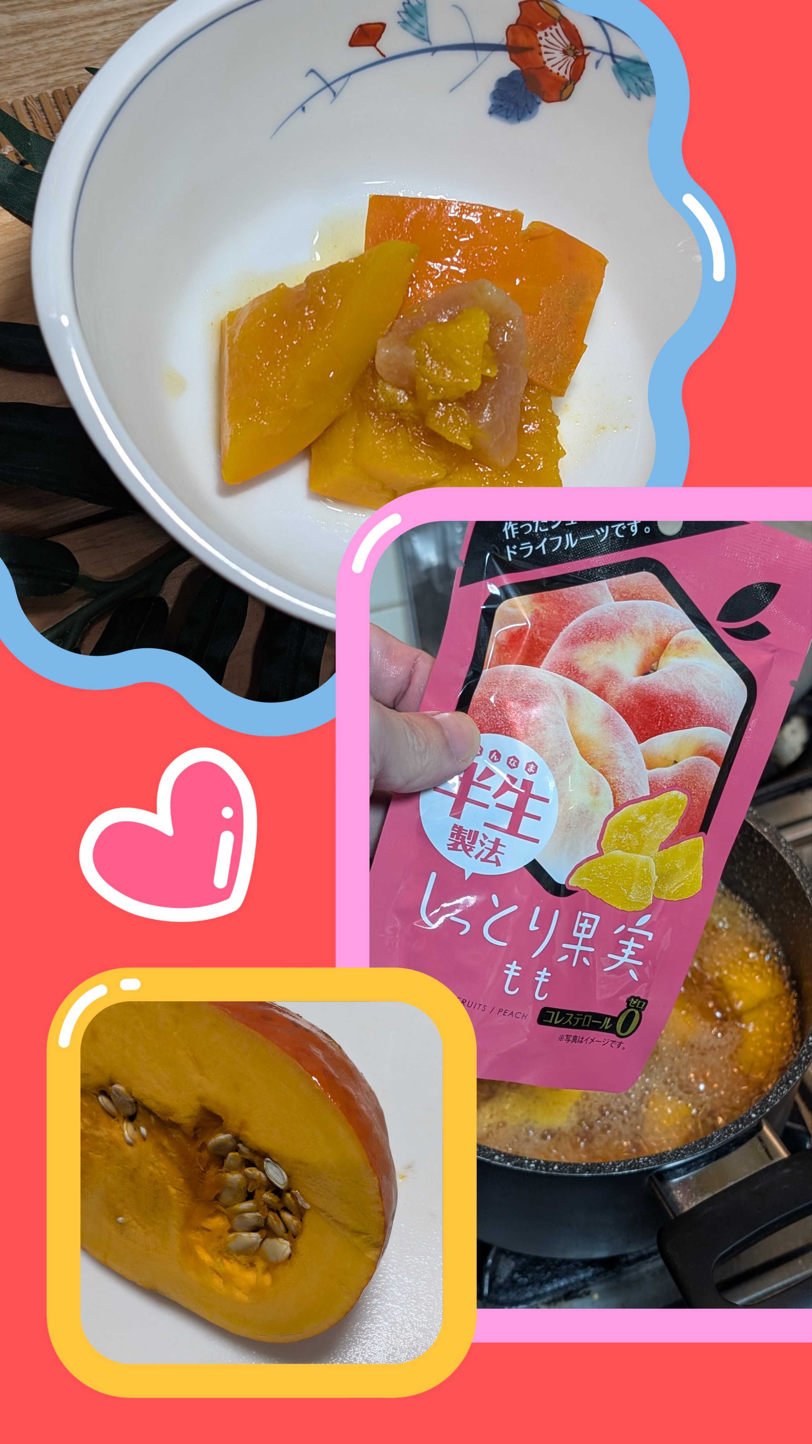 合うんです😝オレンジ色のマロンかぼちゃ🎃水、酒、和風だし少々で煮ていきます柔らかく煮えたら、ドライフルーツ🍑投入今回はもも🍑ですが、レーズン🍇オレンジ🍊何でもお好みで一煮立てしたらふっくら焚けました甘さはドライフルーツ🍑からちょろっとお上品に盛り付けて完成です✨さつまいも🍠➕️ドライフルーツも美味ですよ😋