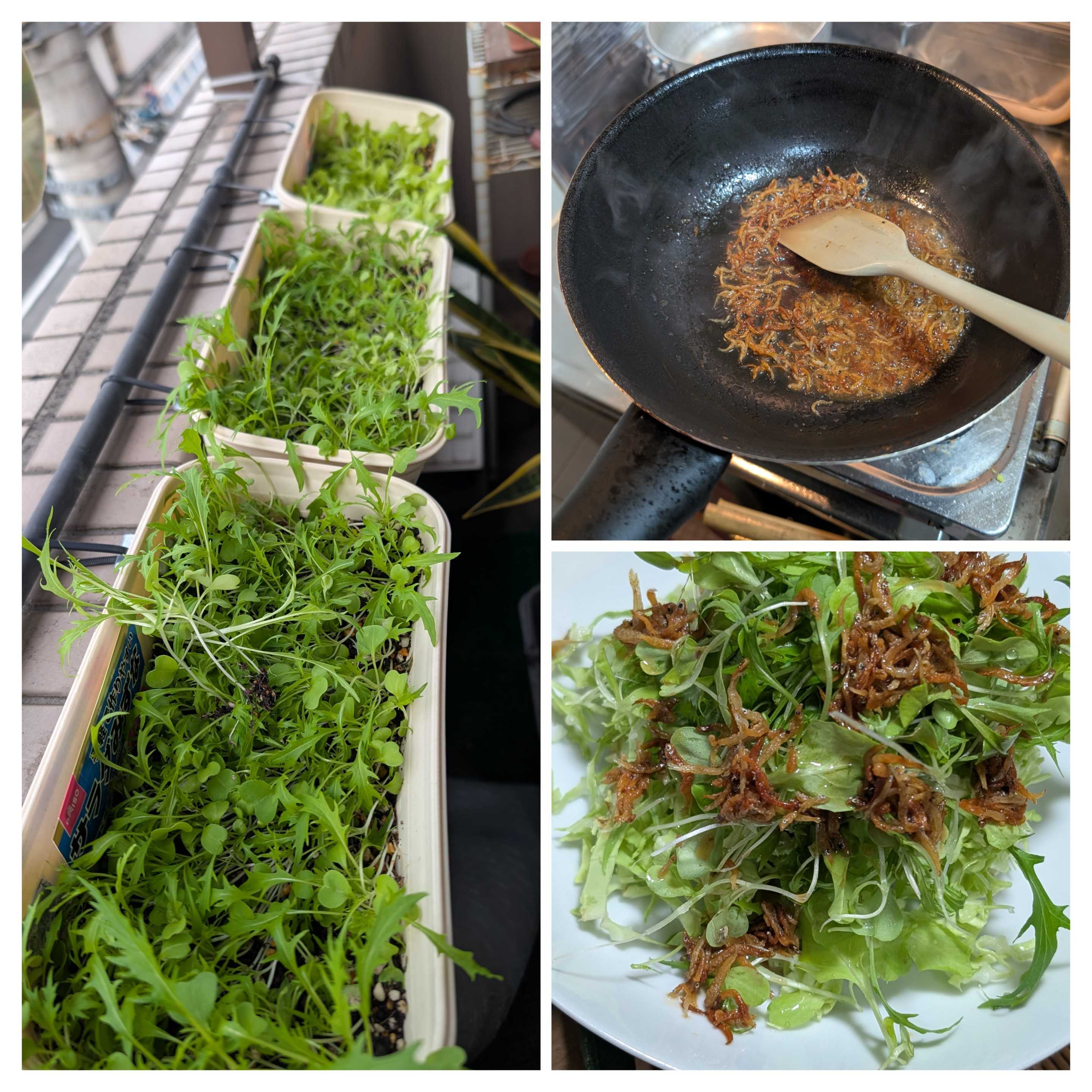 オッサンベランダ家庭菜園🪴収穫🧺サラダ水菜とサニーレタス🥬新芽🌱で柔らかくて香り良しキャベツ🥬を刻んで冷え冷えサラダ🥬をお皿に盛って🥗ドレッシング作りましょうしらすをオリーブオイルで炒めます市販の和風ドレッシングを投入熱々に冷えている新鮮サラダ🥗に、、、SuperHotのDressing、、、乗せて、、、美味😋