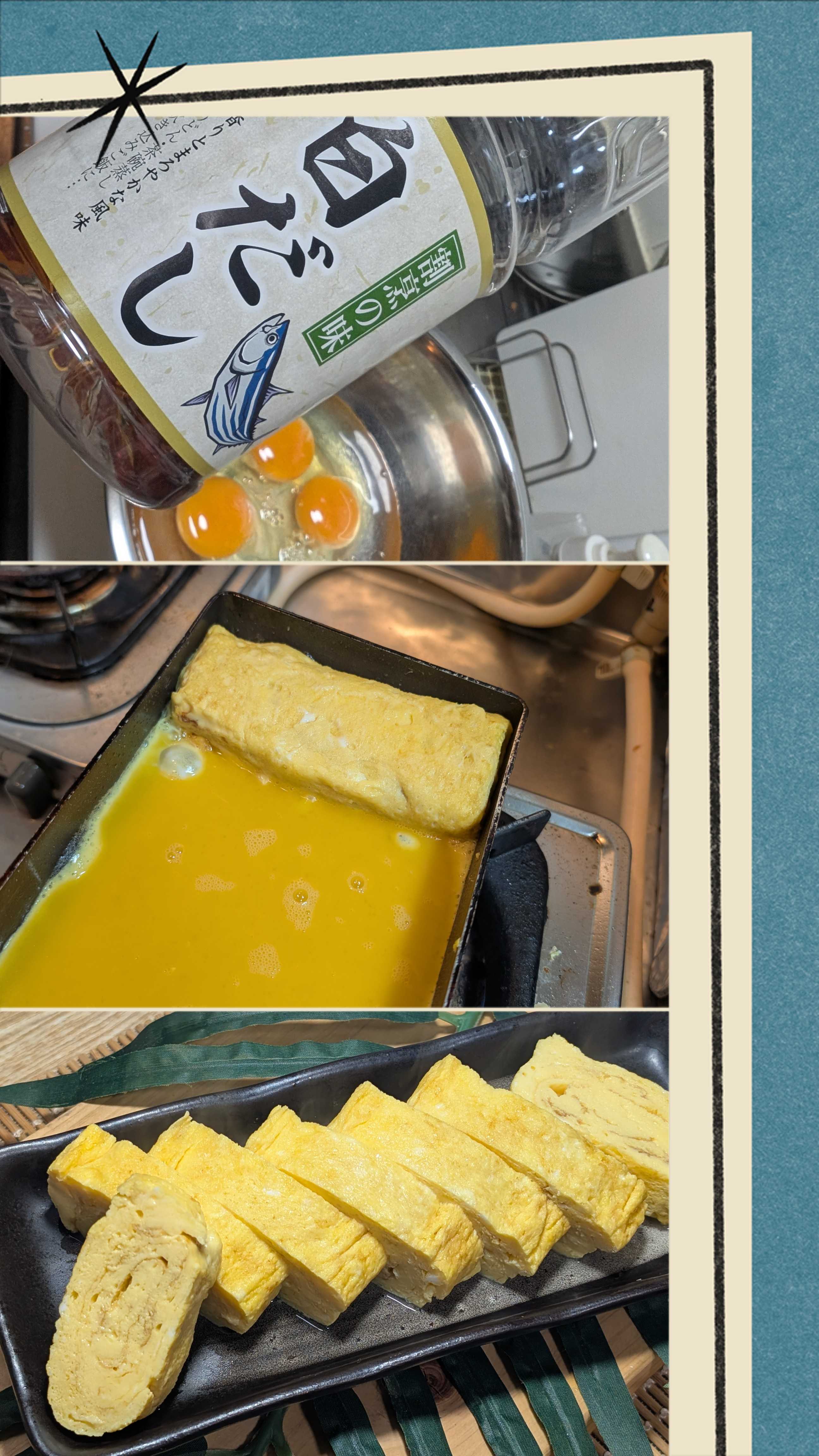 あ〜〜卵🥚が、、、賞味期限間近でいっぱいある😱オッサンの一人暮らしあるあるかと🤔平日お一人晩酌🍶🍻のおつまみでもと卵🥚いっぱいなのでだし巻き🥚風でもボウルに卵3個お水💧50〜70cc、白だしちょろっとお好みでよく混ぜて焼き1回目焼き2回目、1回目がちょいと焦げた😱やっぱりお料理おサボりすると、、、3回目の巻き巻き🌀ここで挽回😤オッサン飯🍚なら上等仕上げでは😝ちょいとお料理技術頑張ります😰オッサンの晩酌🍶🍻開始しました😊