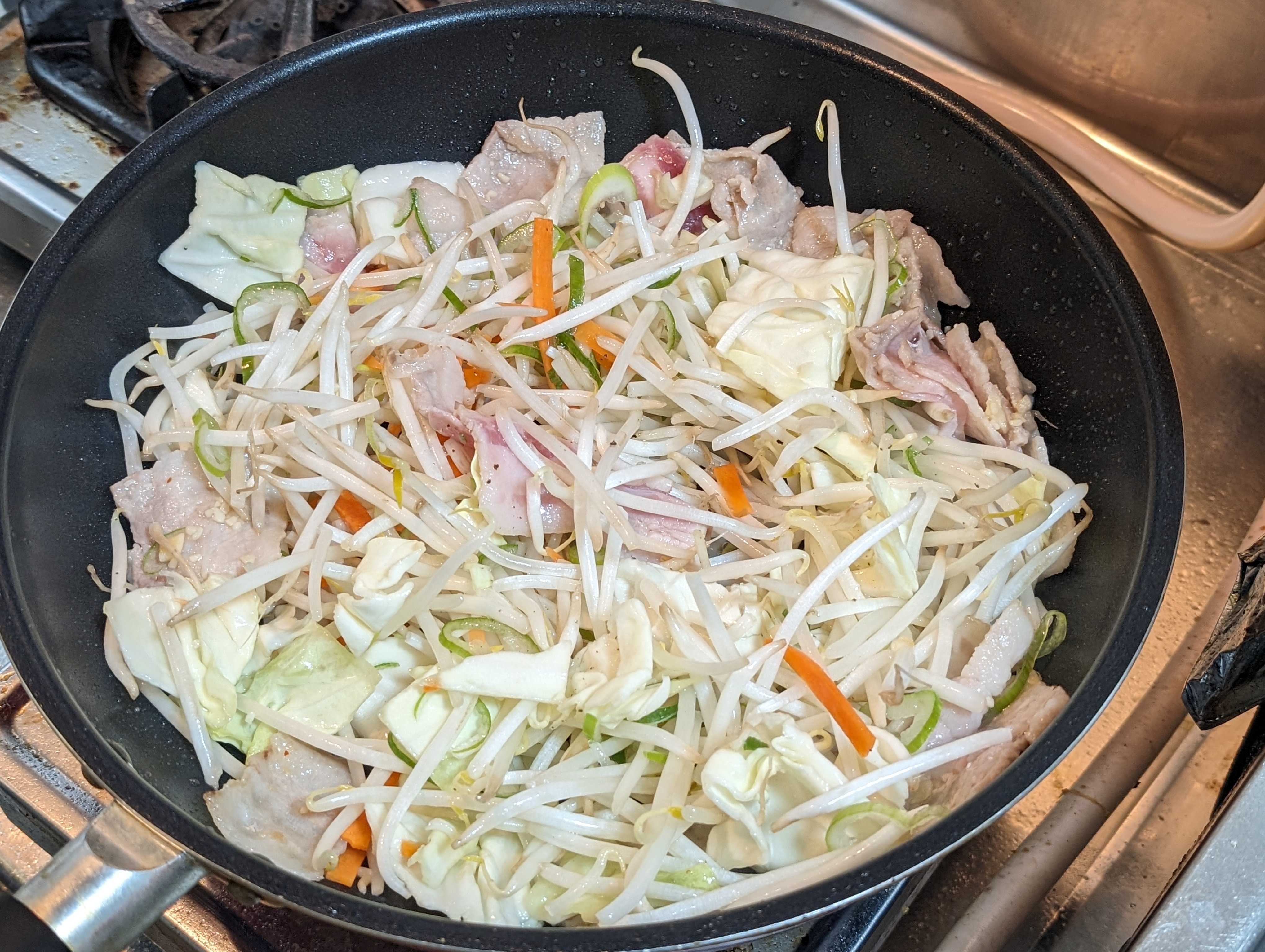 野菜ミックスをドーンと投入、ササっと作るのでもやしも一緒に