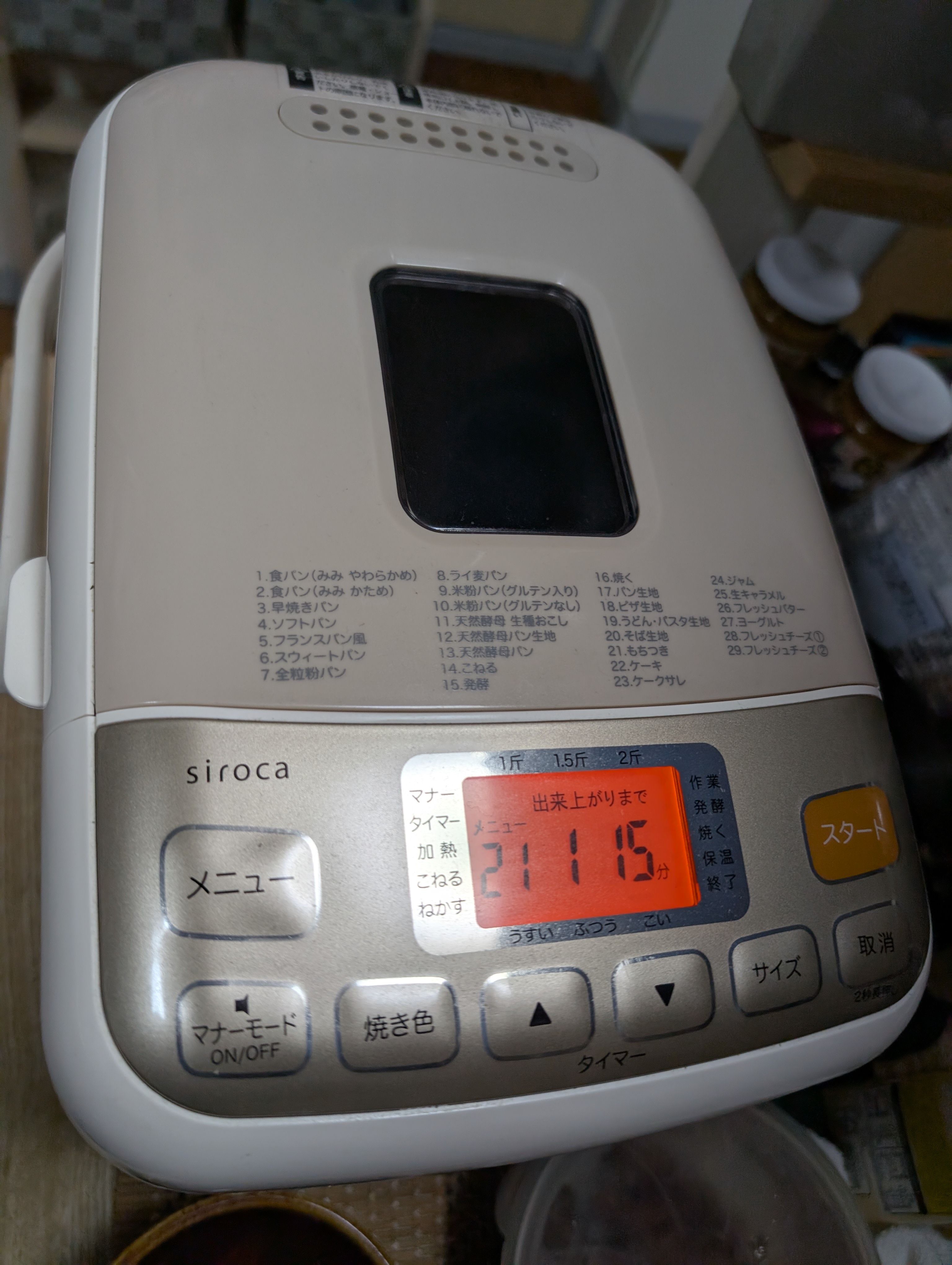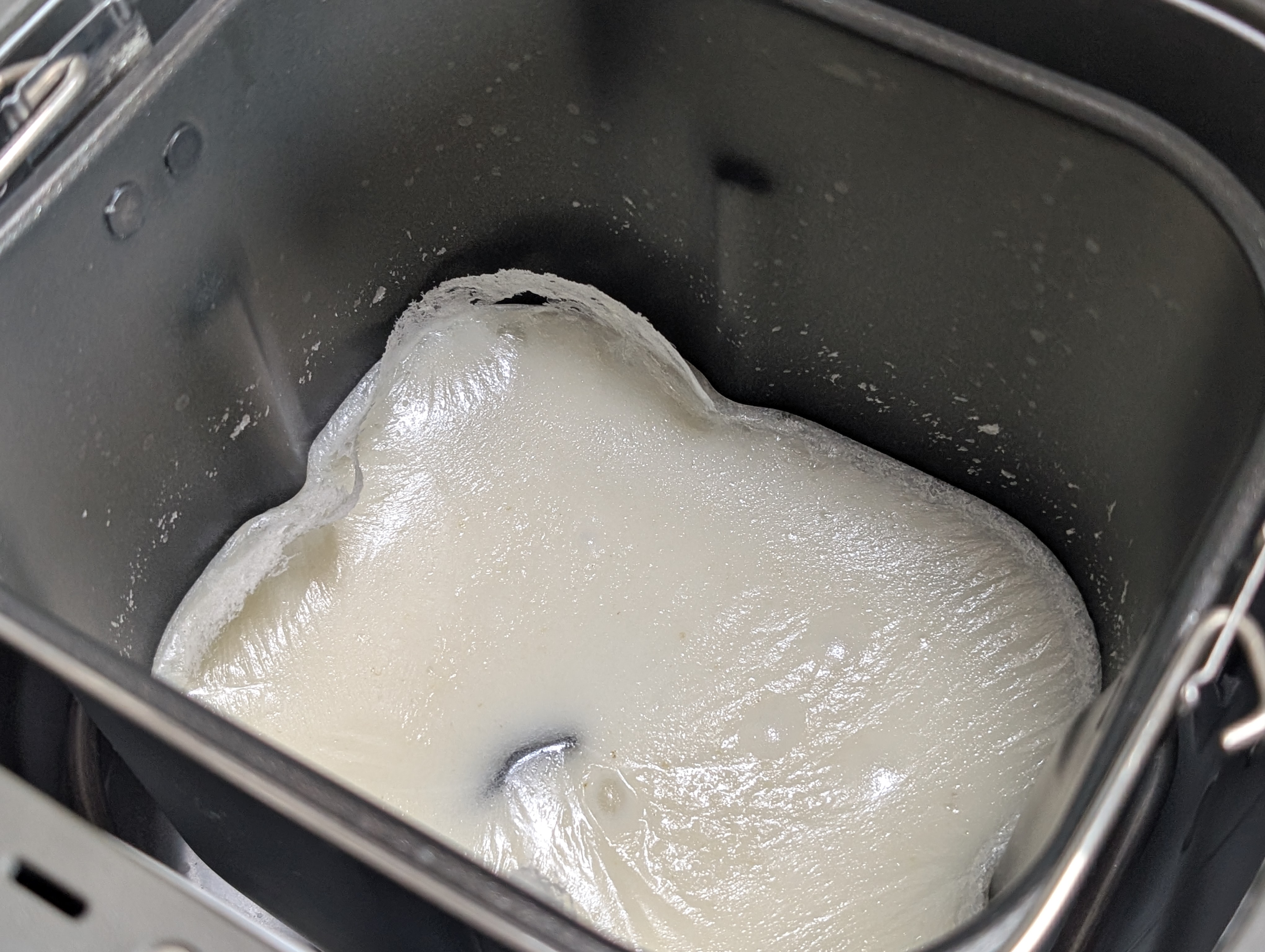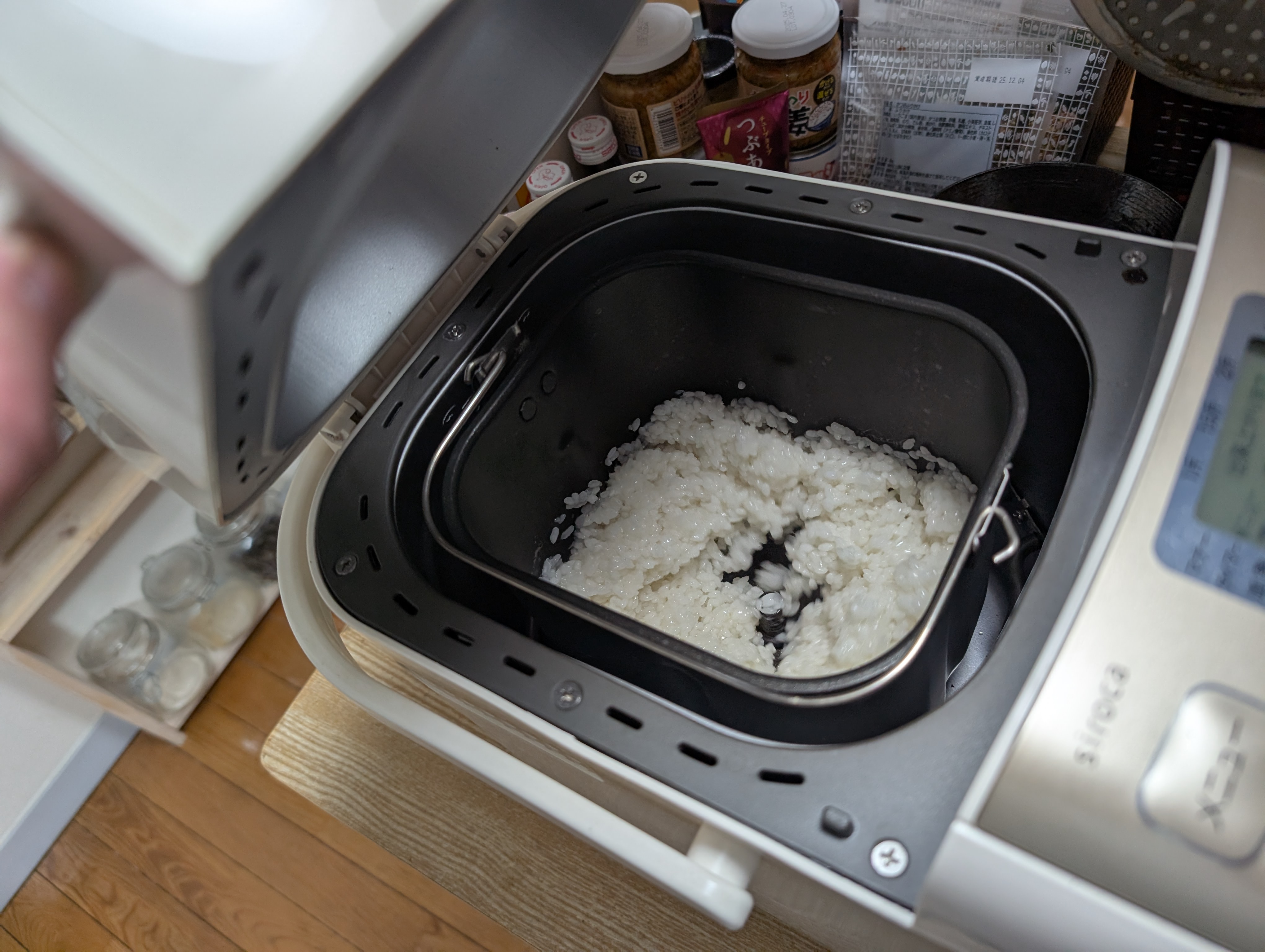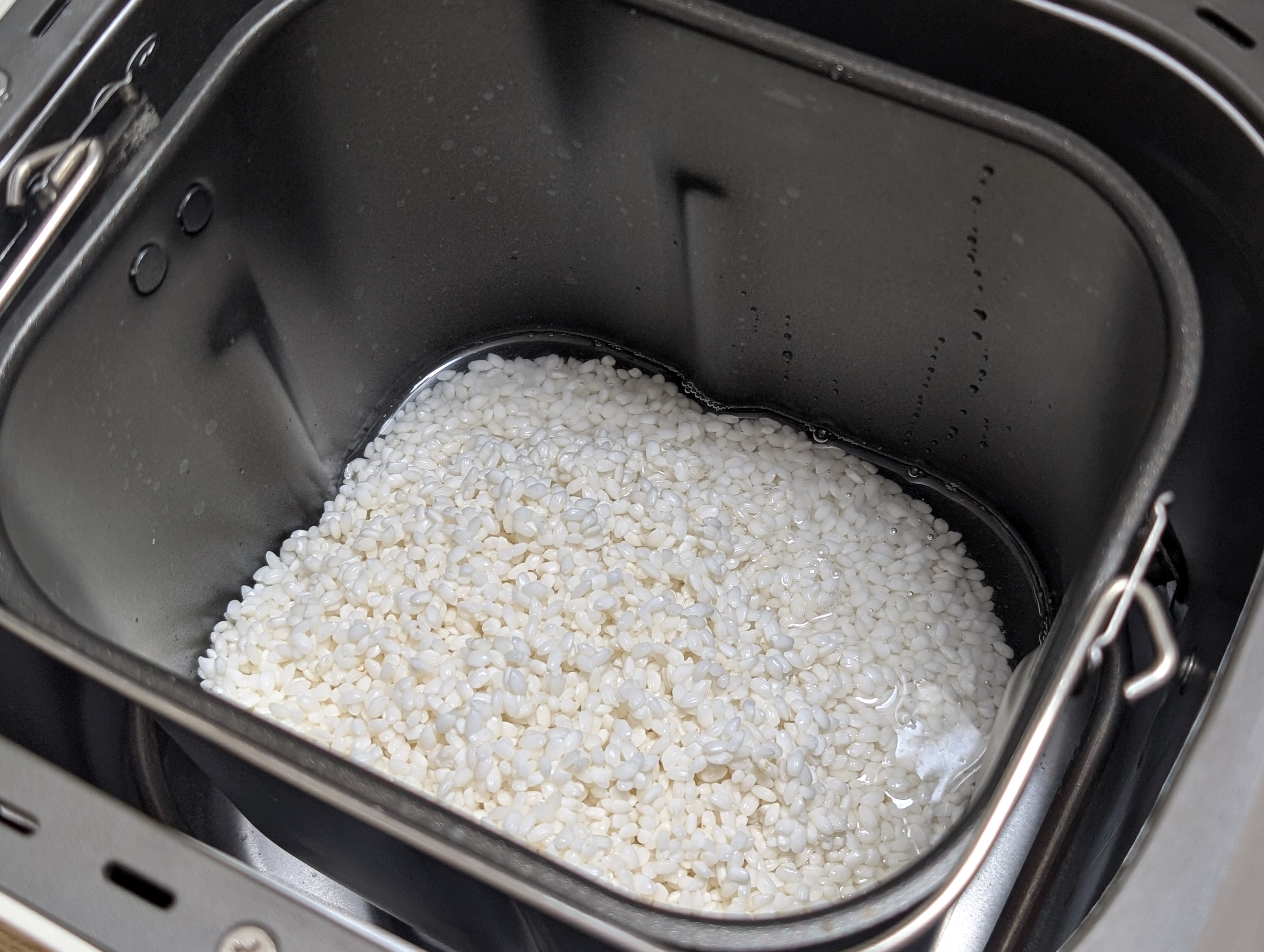 最近のパン焼き機は万能で、洗って少し水にさらしたもち米とお水をセット