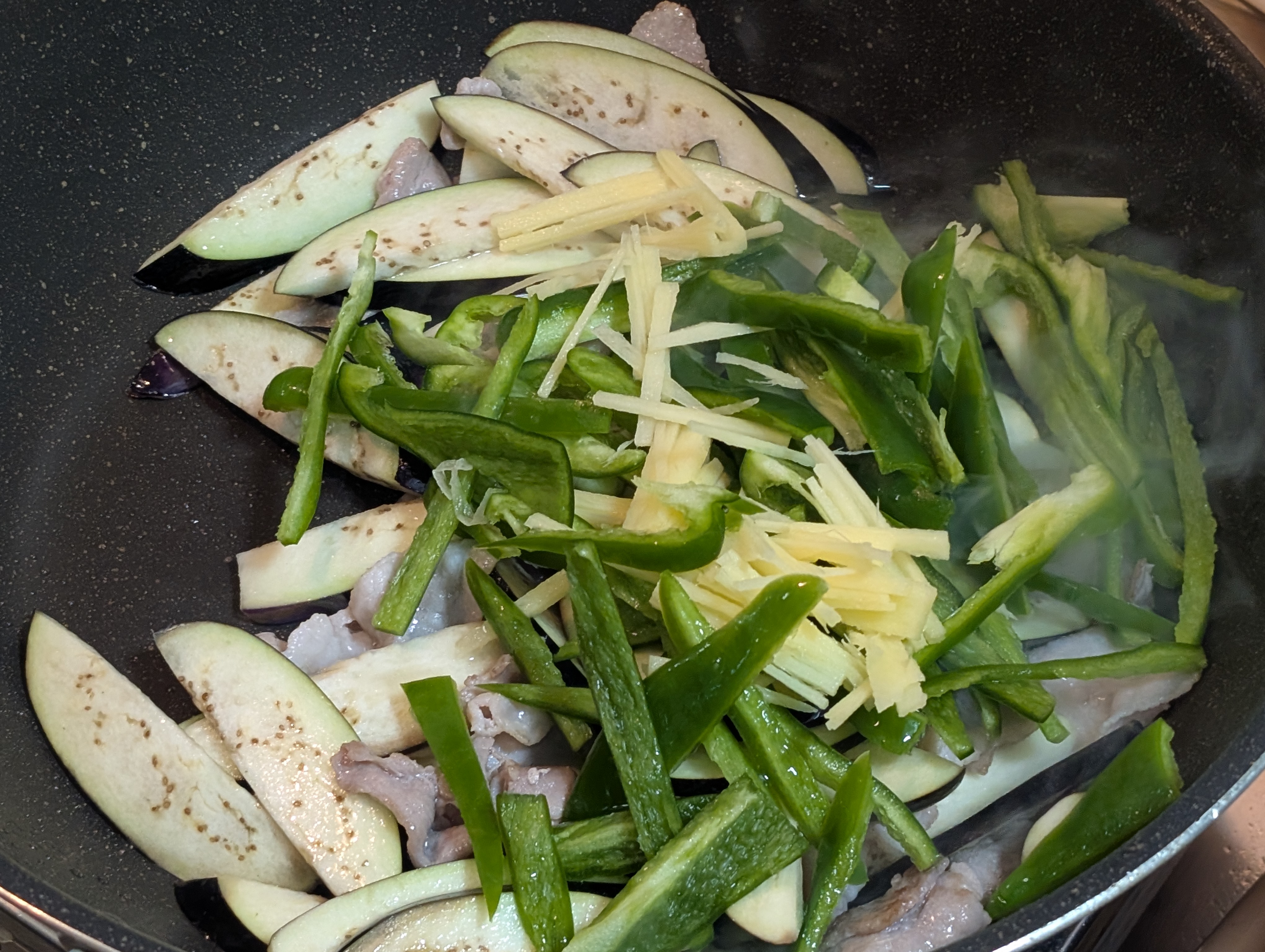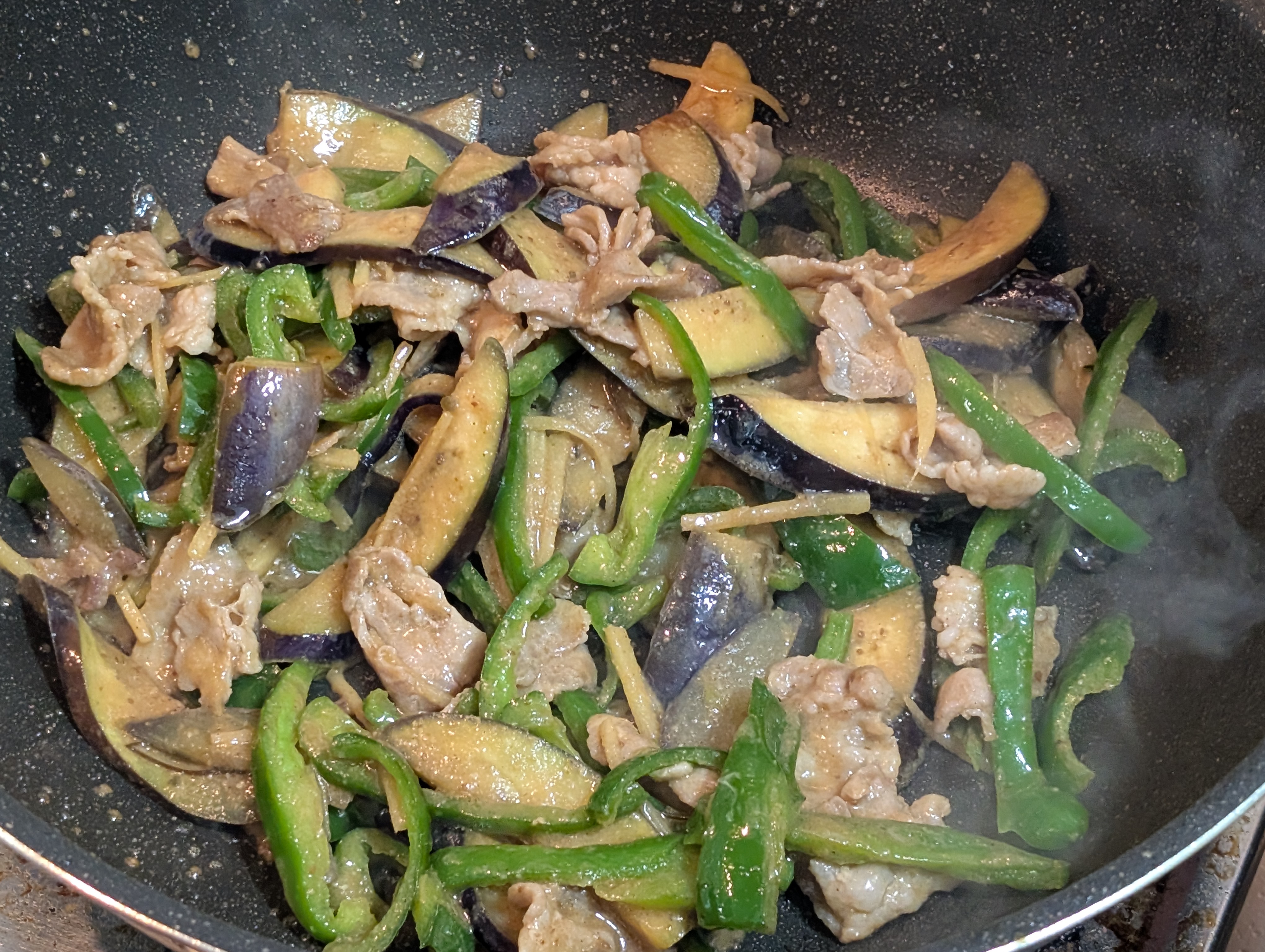 🍆🫑🫚を投入、軽く追い油で、なす🍆っちゃ油でしょう😍