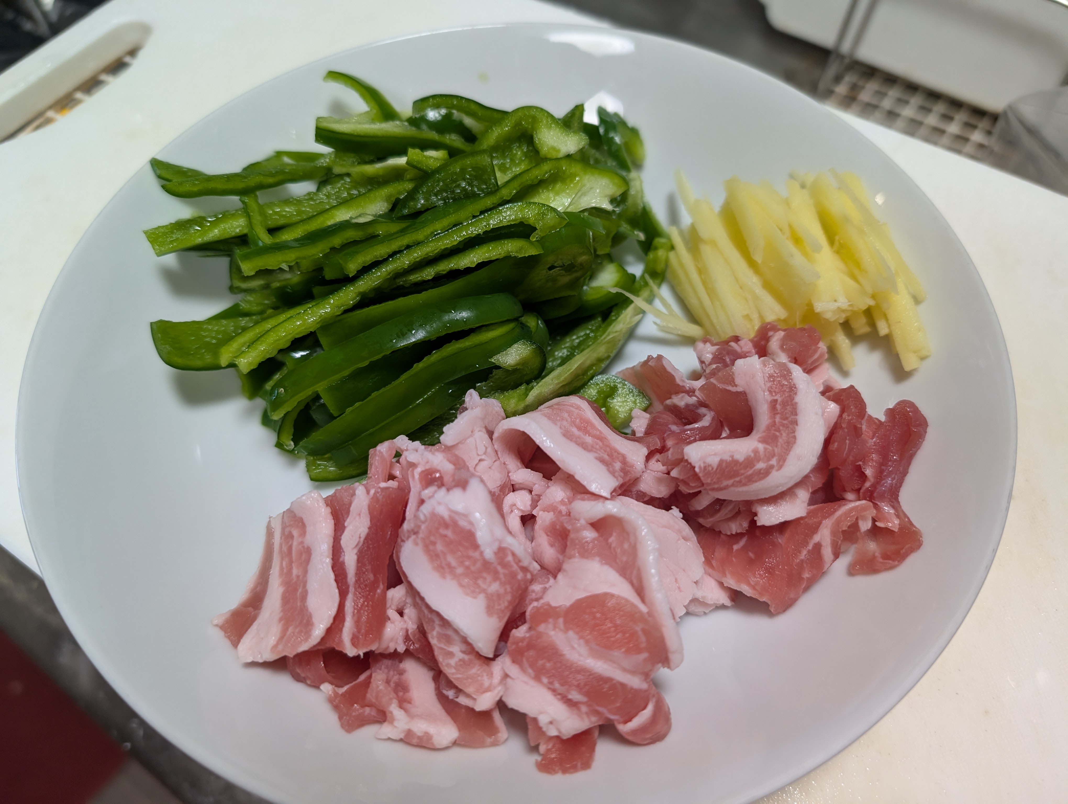 ピーマン🫑、生姜🫚、豚肉🐷をカット
