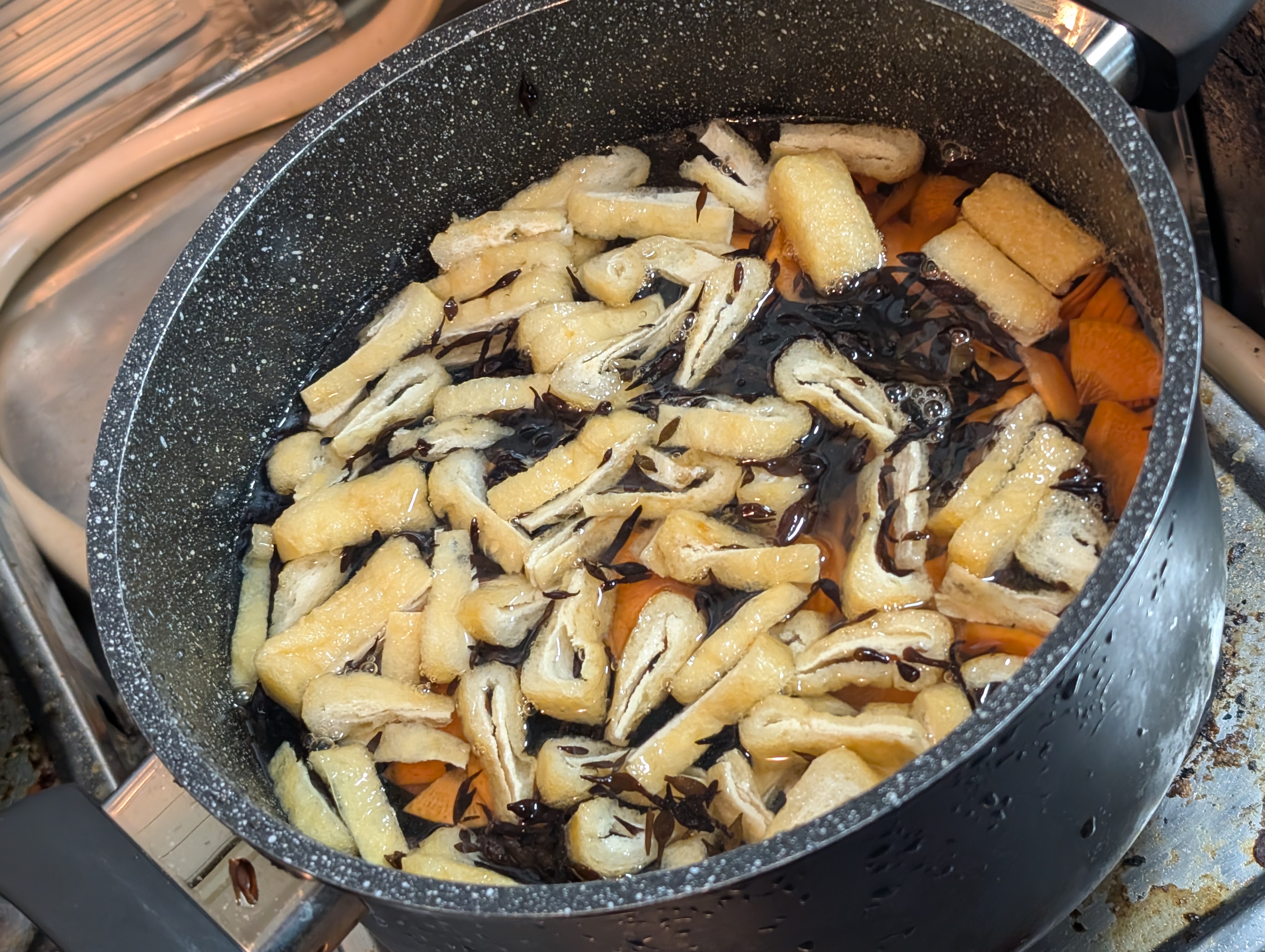 冷凍保存していた油揚げ、人参🥕、ひじきを煮ていきます、水、酒、ザラメ糖、醤油、顆粒あごだし