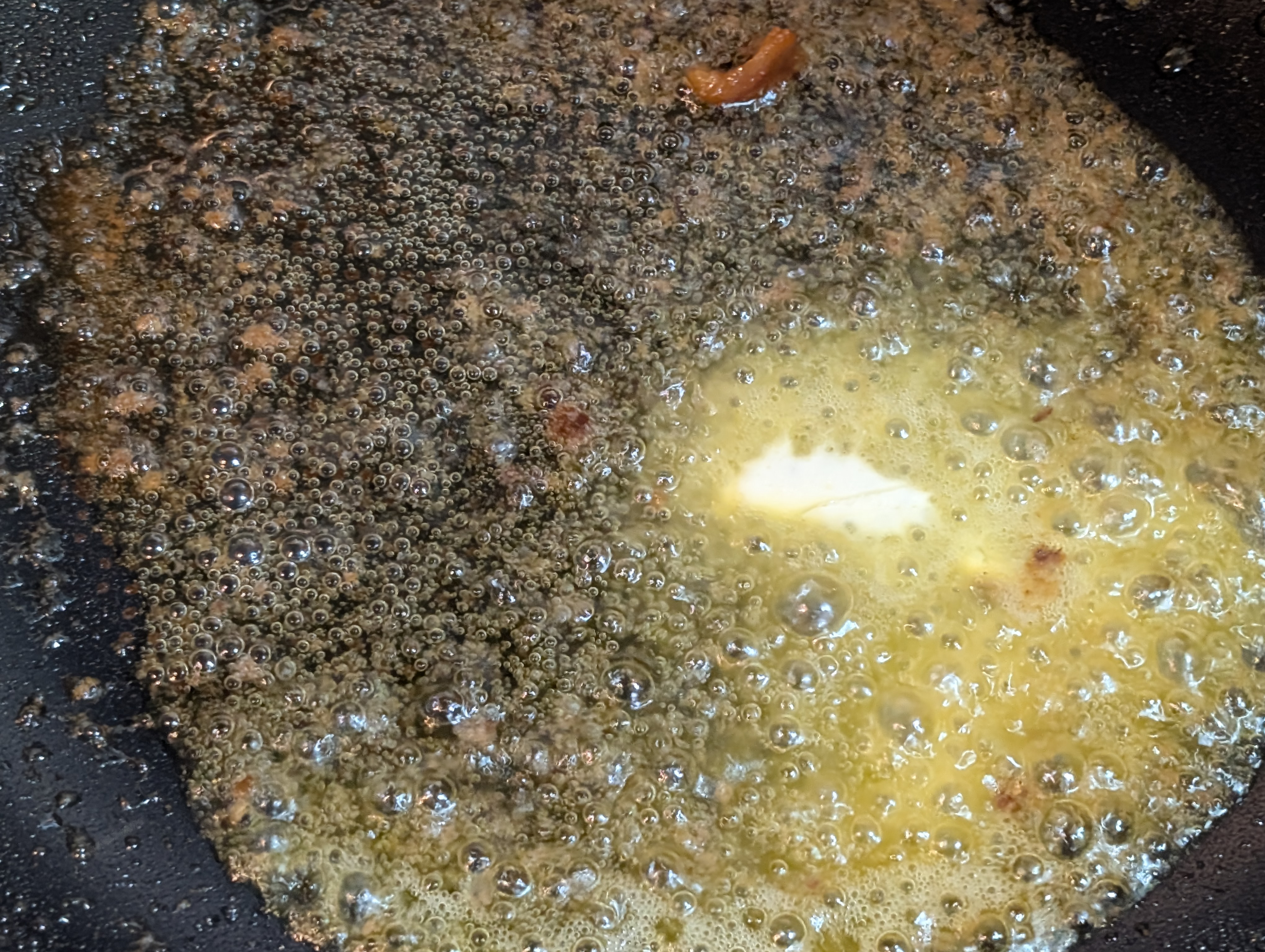 残ったオリーブオイルと肉汁にバター🧈を入れて一煮立て