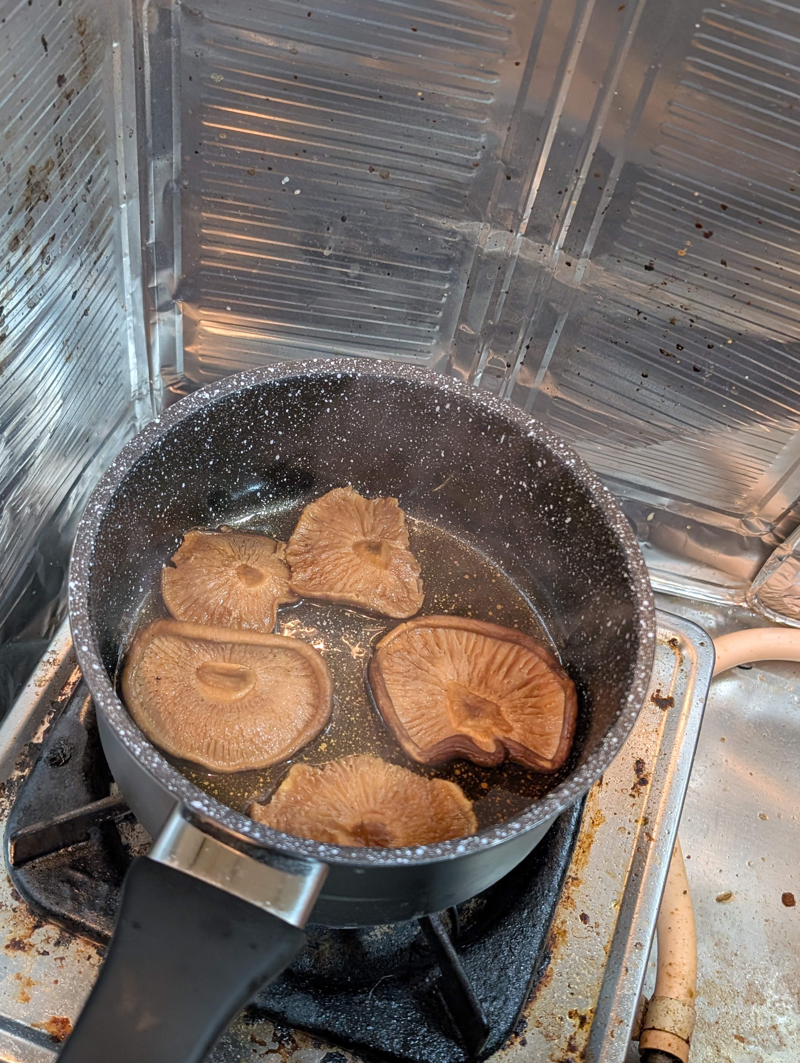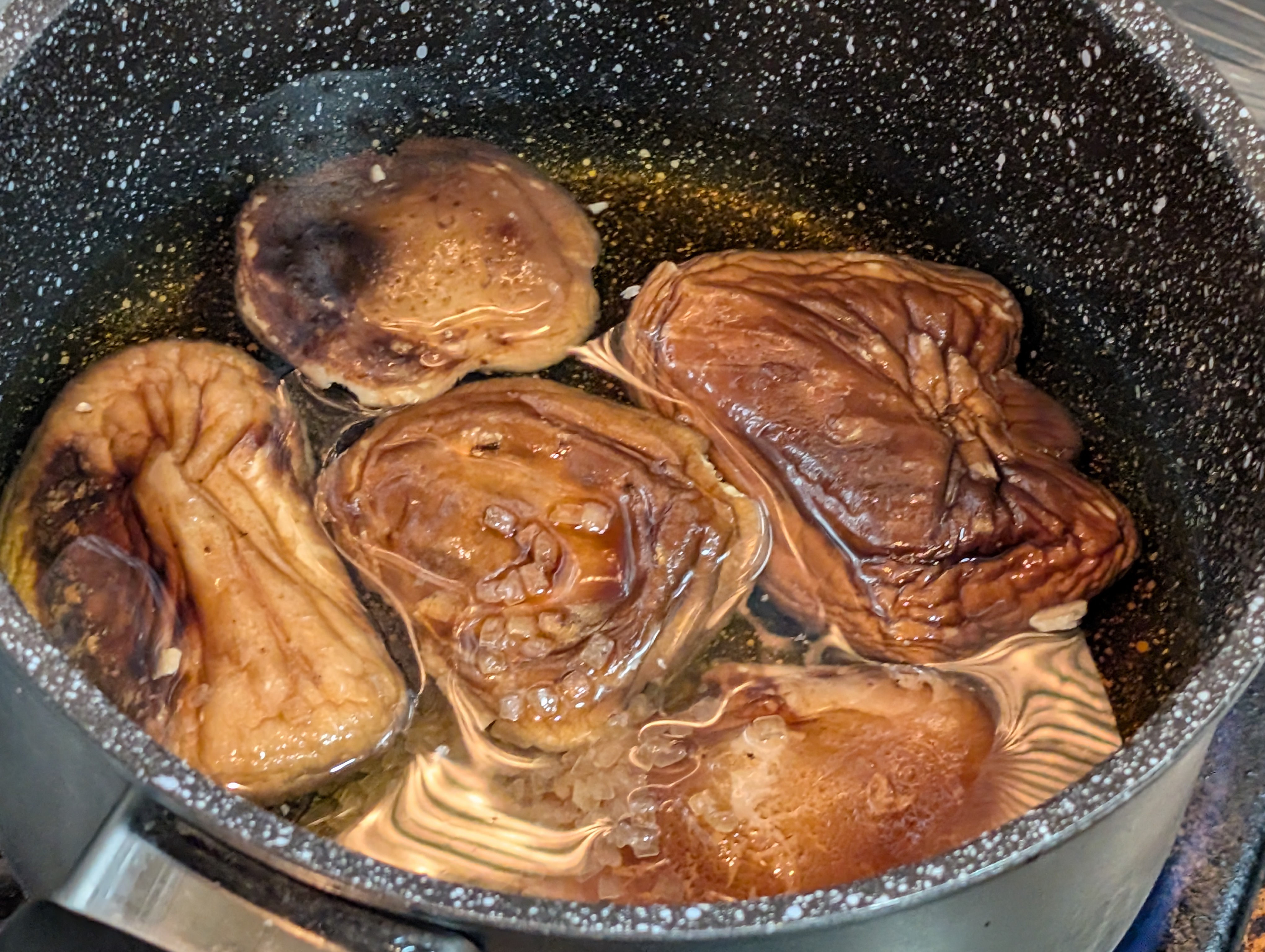 椎茸の戻し汁を少々投入、1/3浸る程度