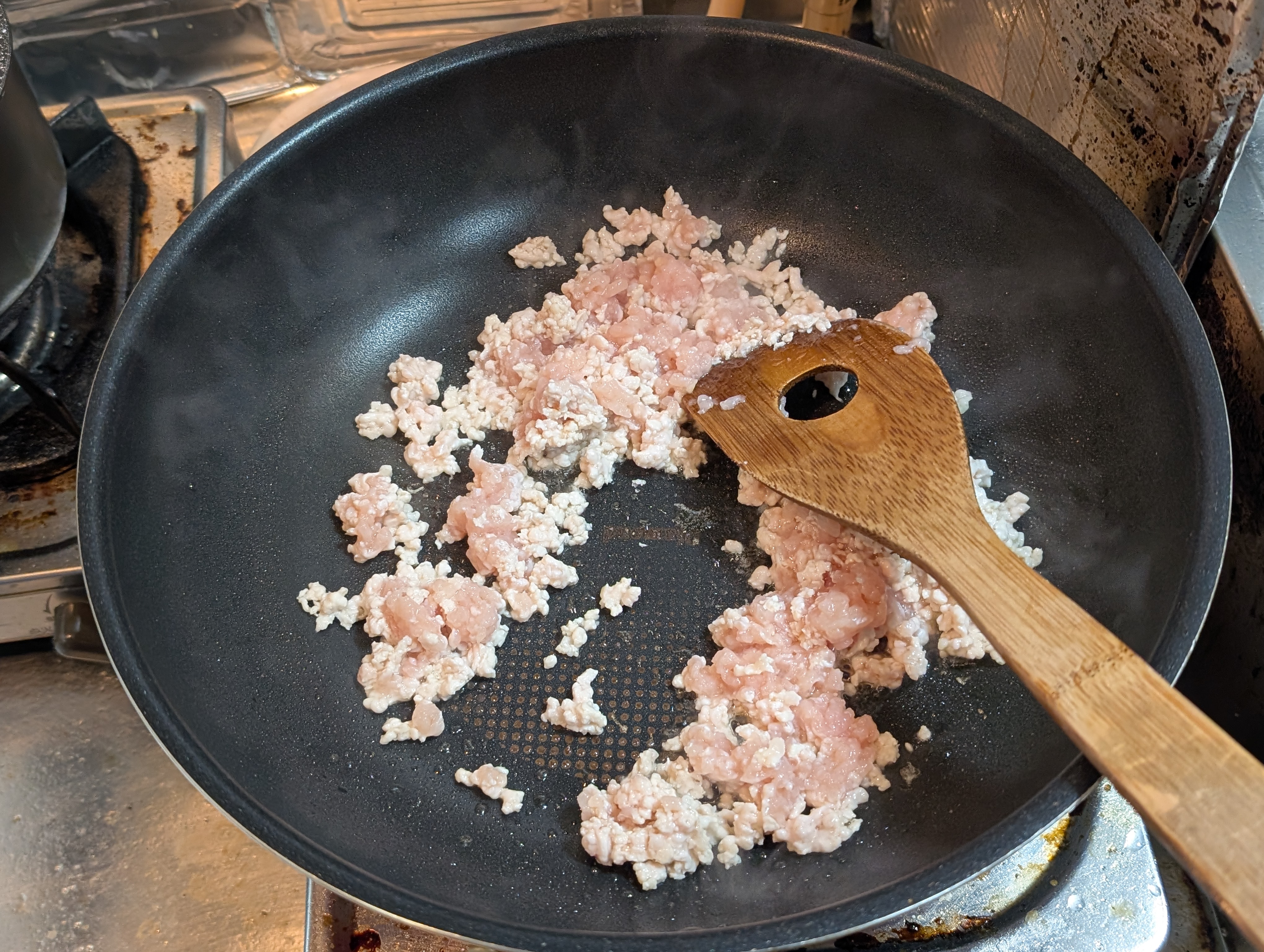 サラダ油とごま油で🐔むね挽肉を炒めて