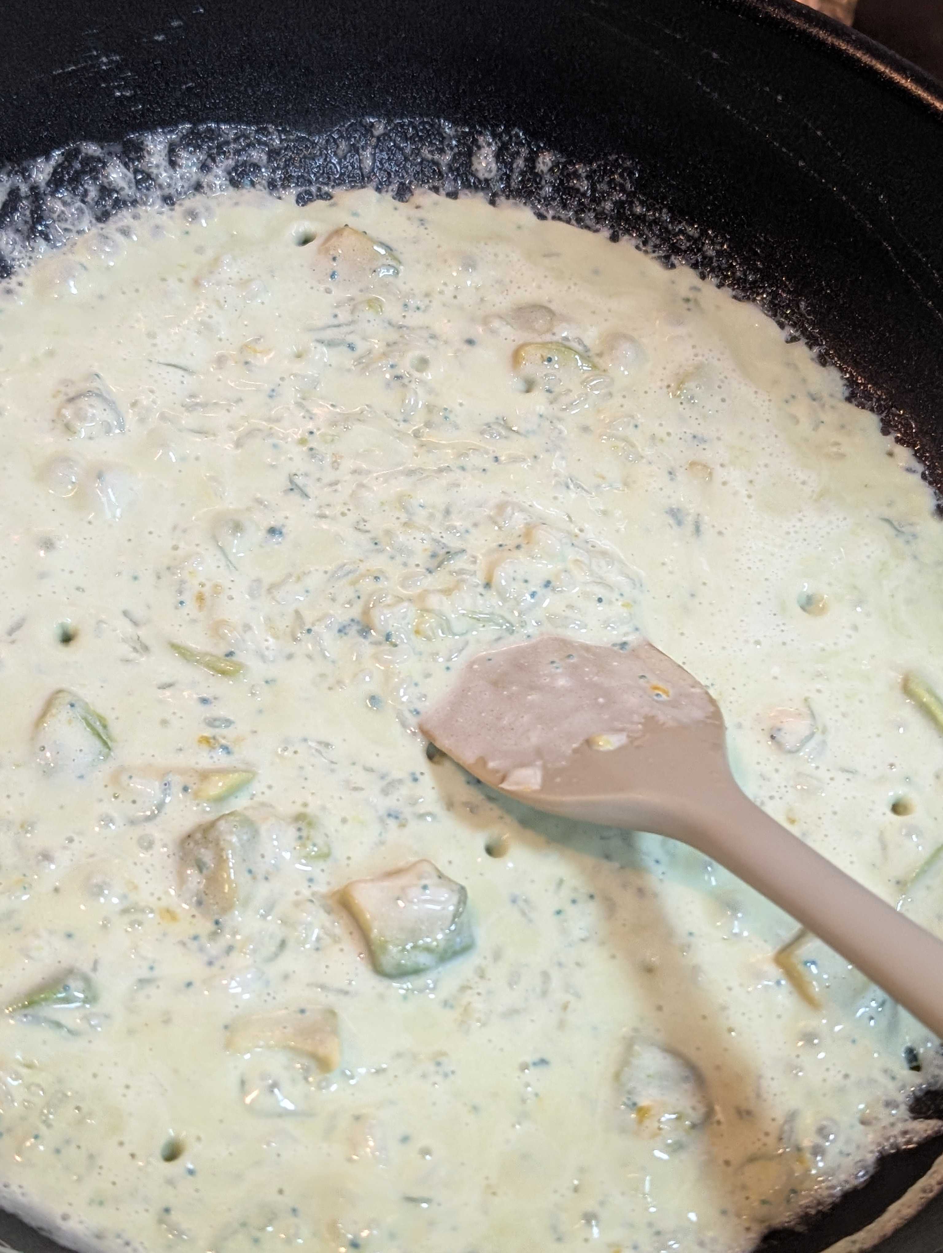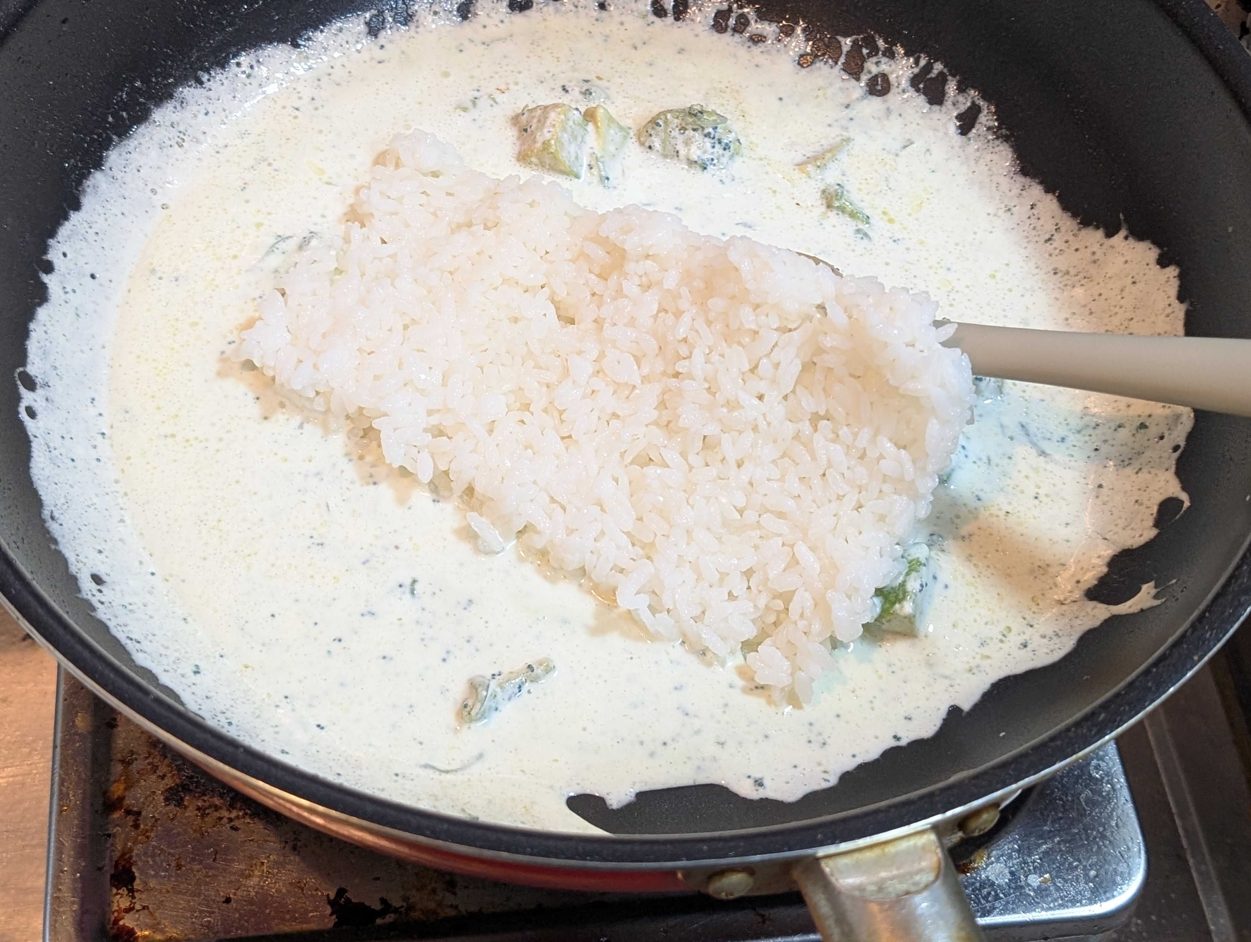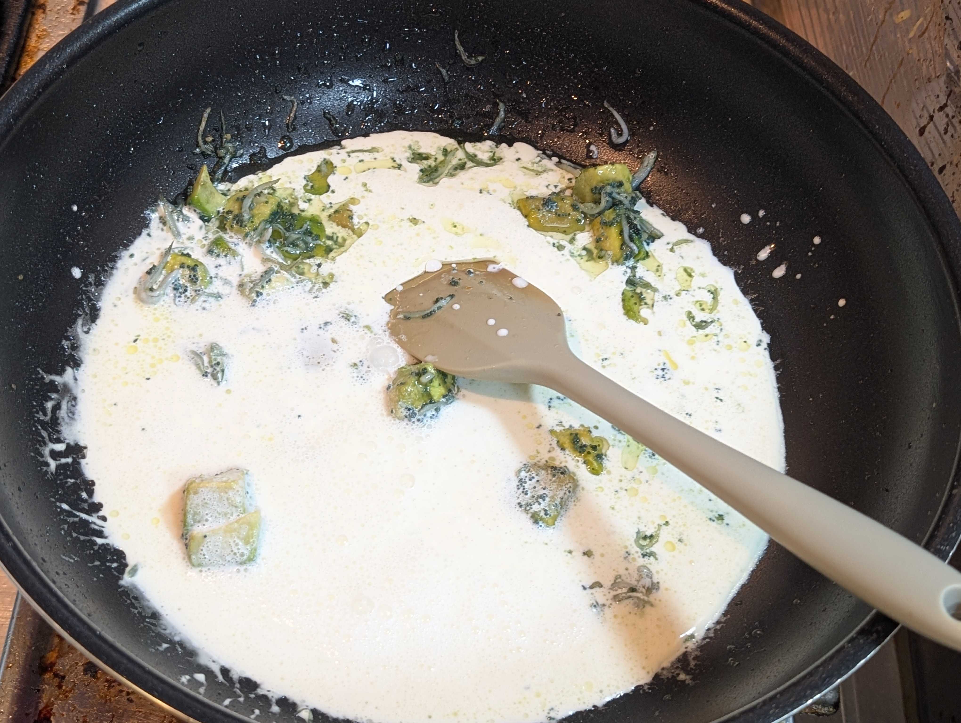 生クリーム投入、味つけは塩コショウとお好みの魚介系の顆粒だしでOK
