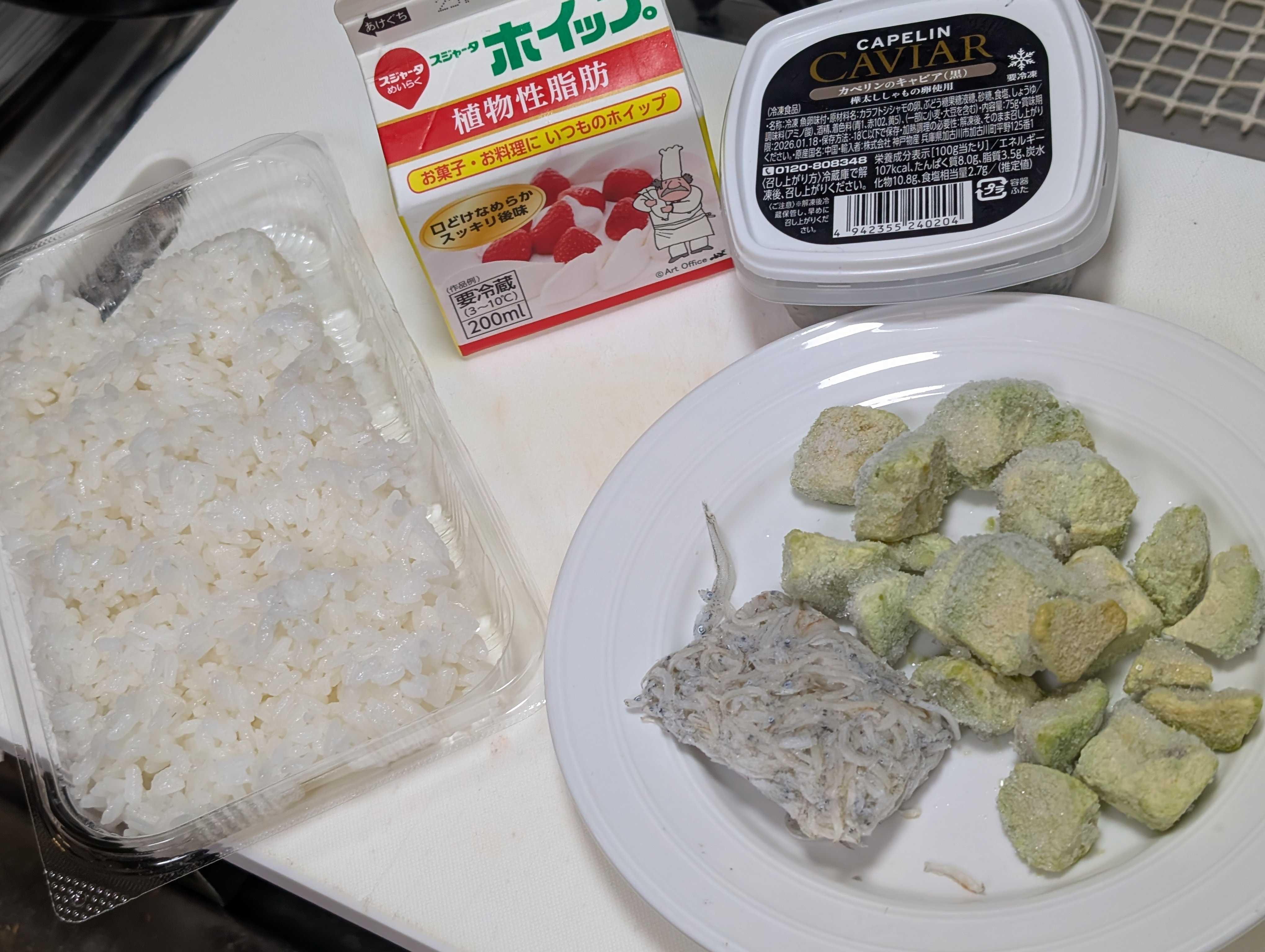 植物性ヘルシー生クリーム、安い時に購入小分けしらす、業務スーパーの冷凍アボカド🥑、数百円のキャビア🤯みたいなカペリン(ししゃも卵)のキャビア🥳お家🏠で楽しむ「彩りちゃん」