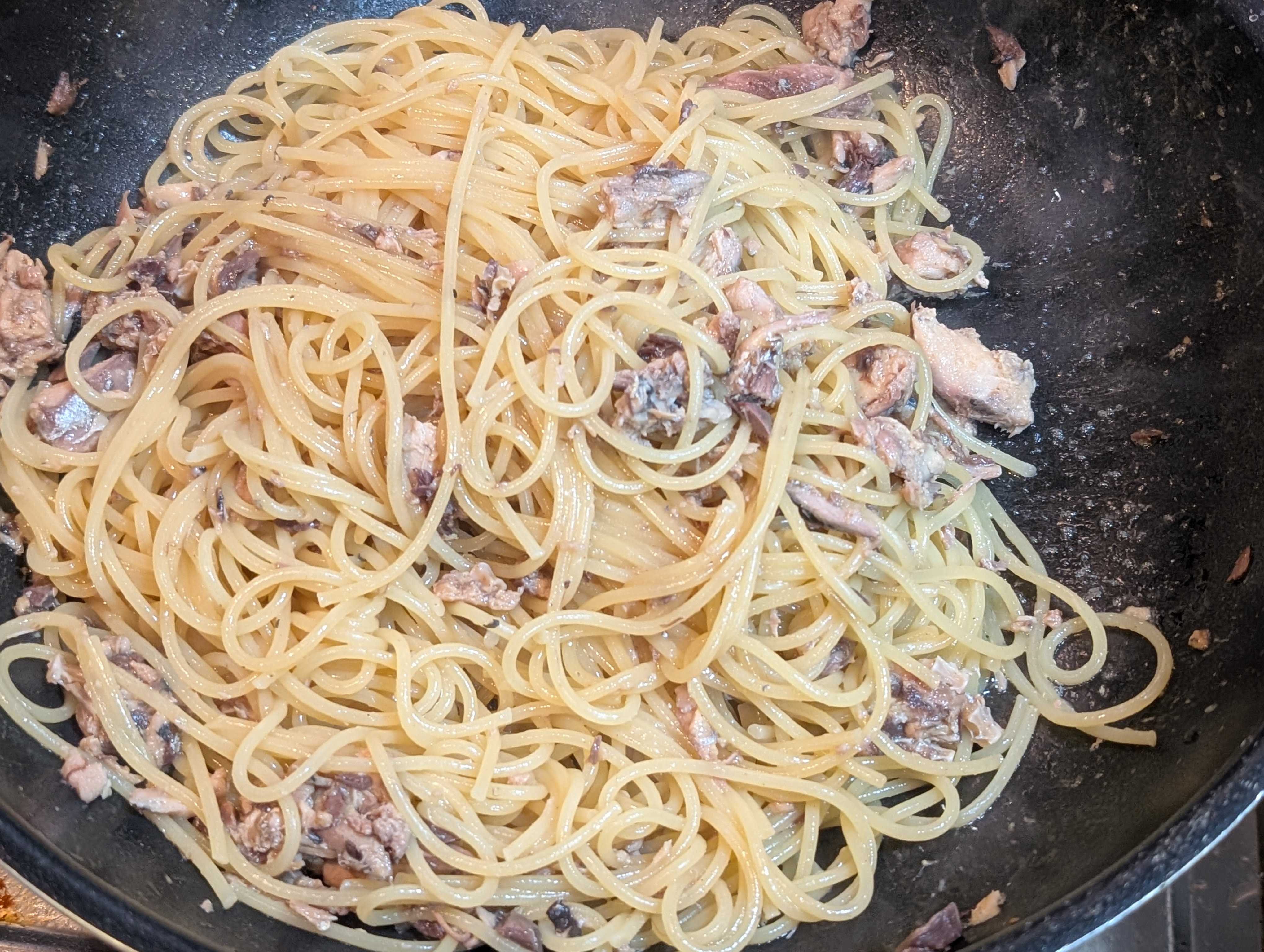 茹で上がったスパゲッティを投入、しっかり炒めます😤 混ぜるだけは❌️