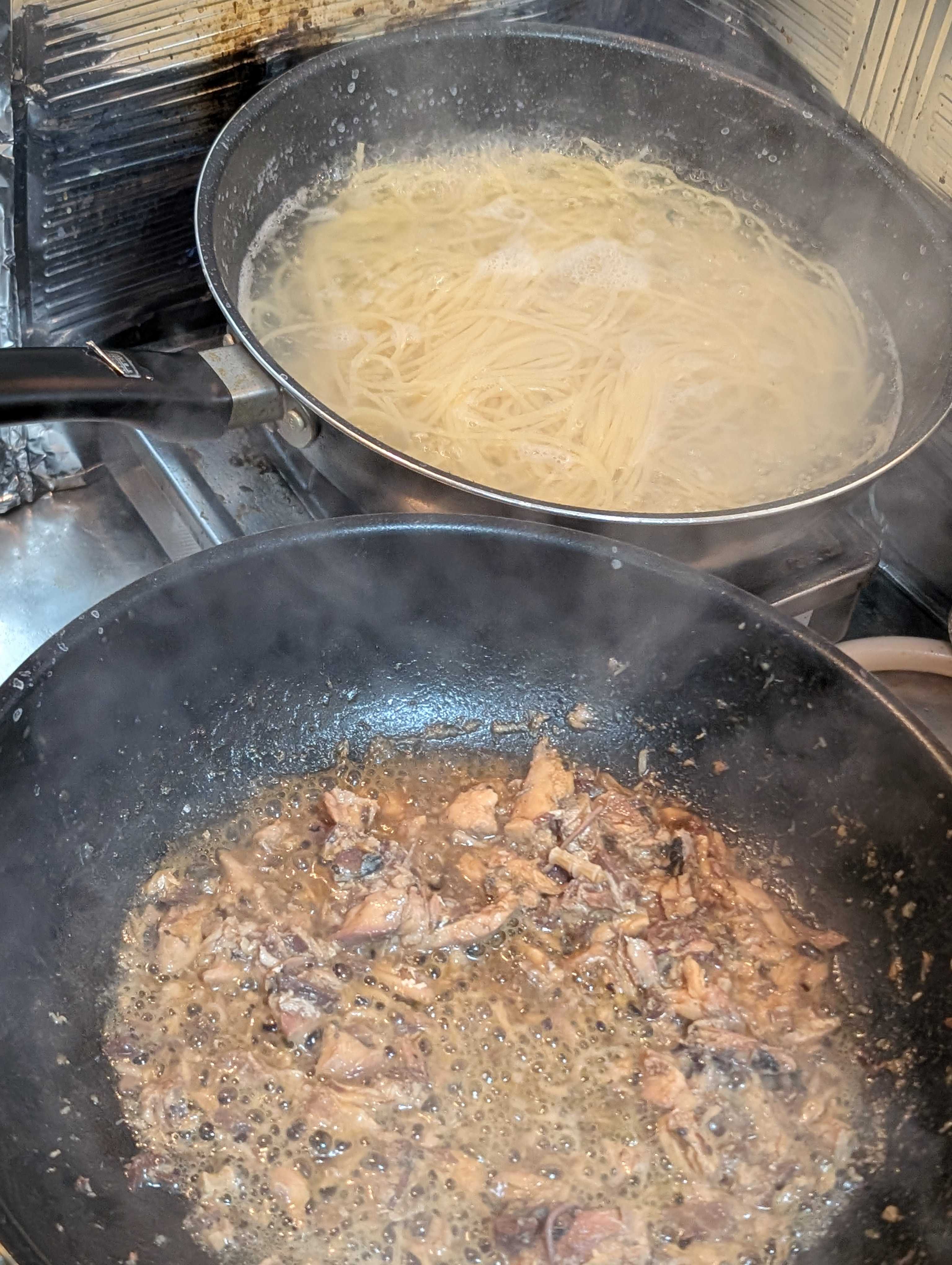 同時にスパゲッティもボイル、ちょっと茹で汁入れて