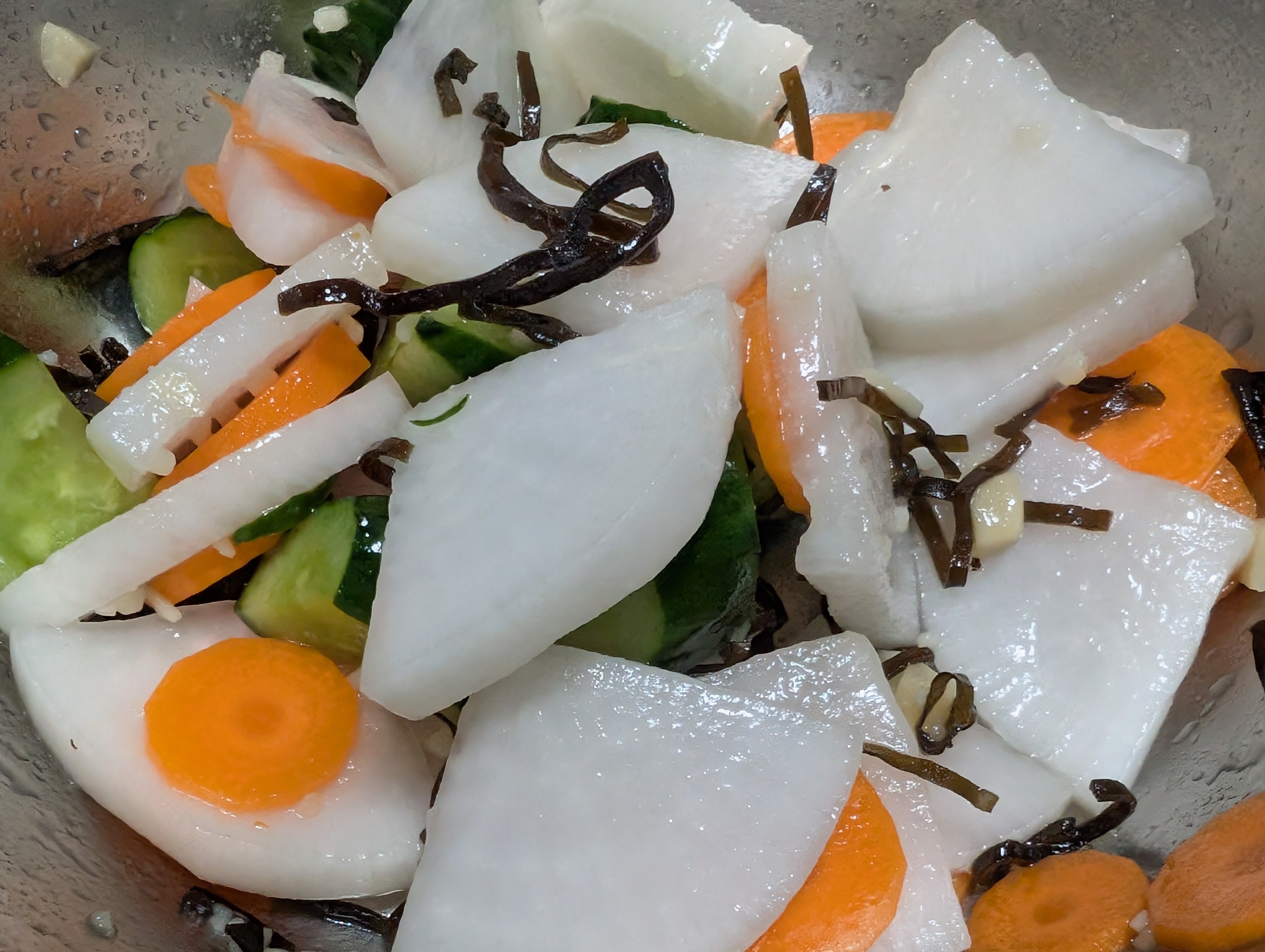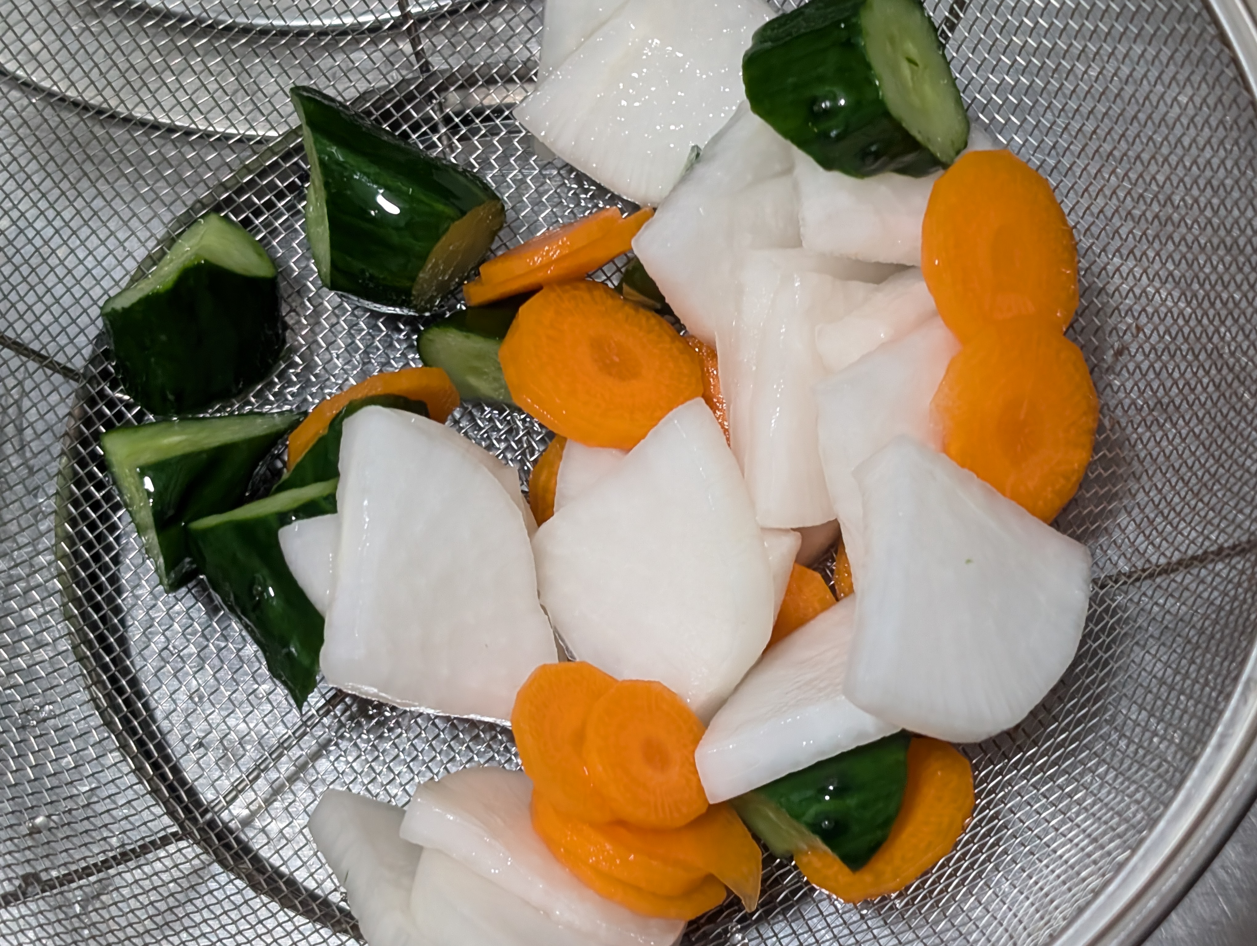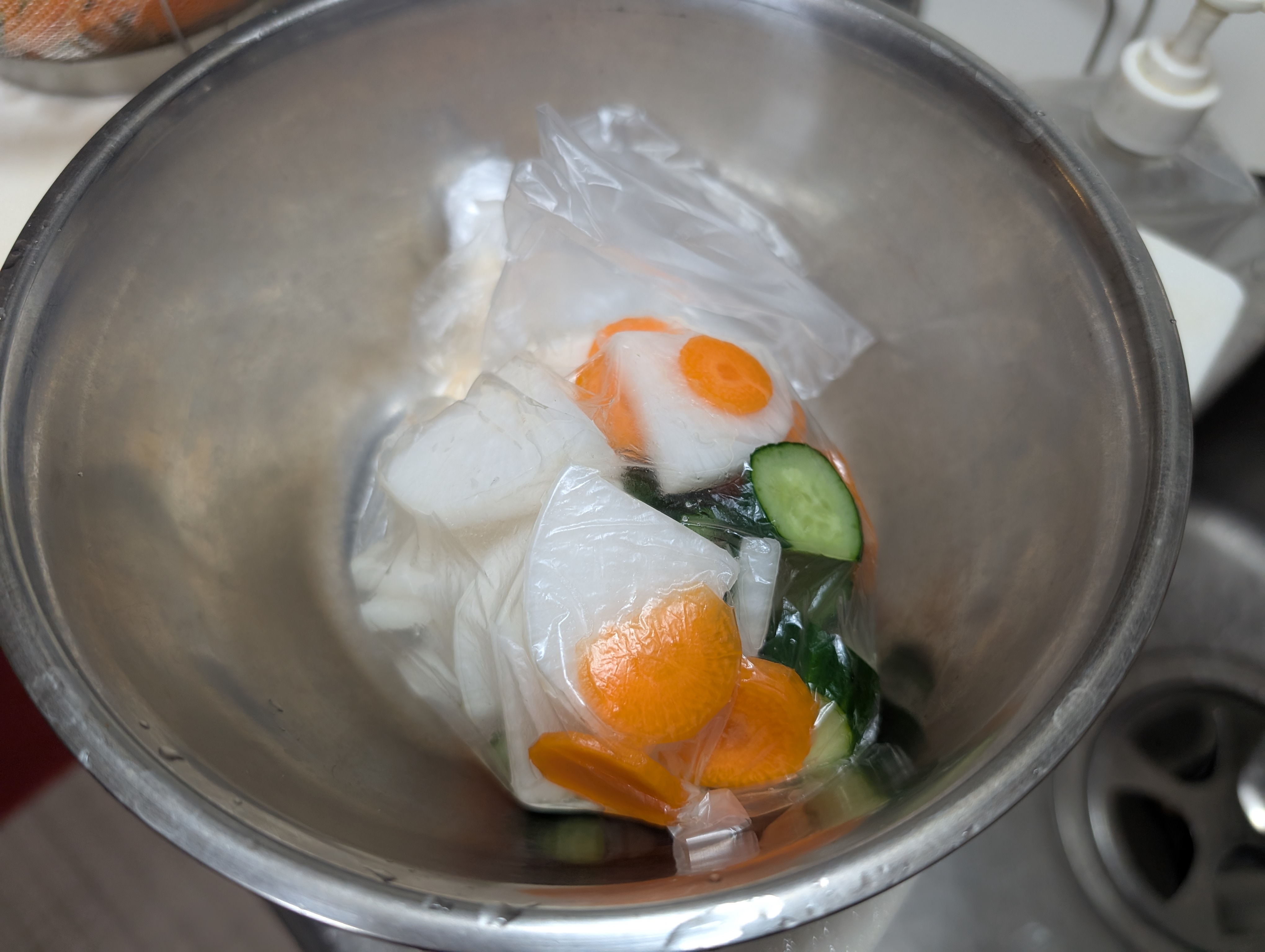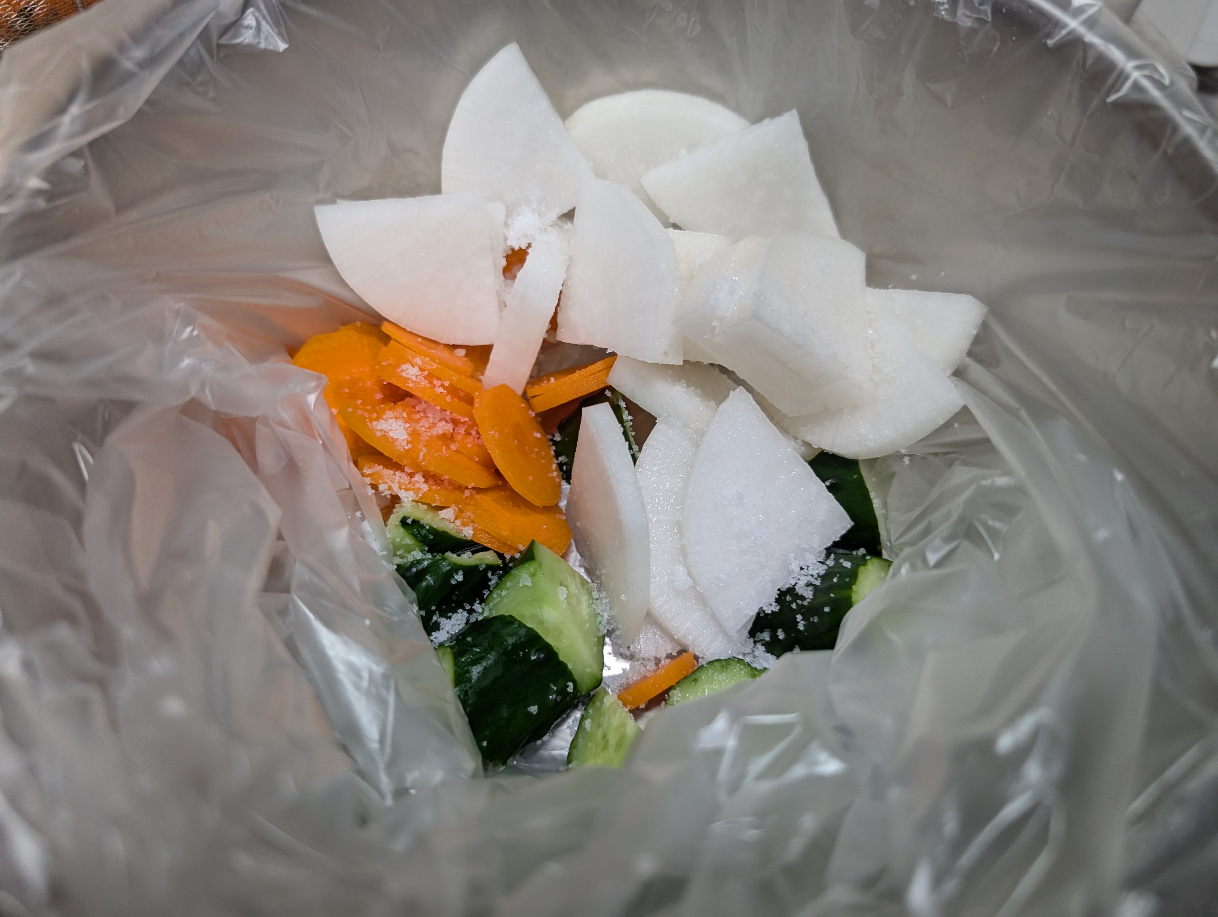 ビニール袋にお野菜を、今回は胡瓜🥒人参🥕大根で、軽く塩を降ってフリフリ😜
