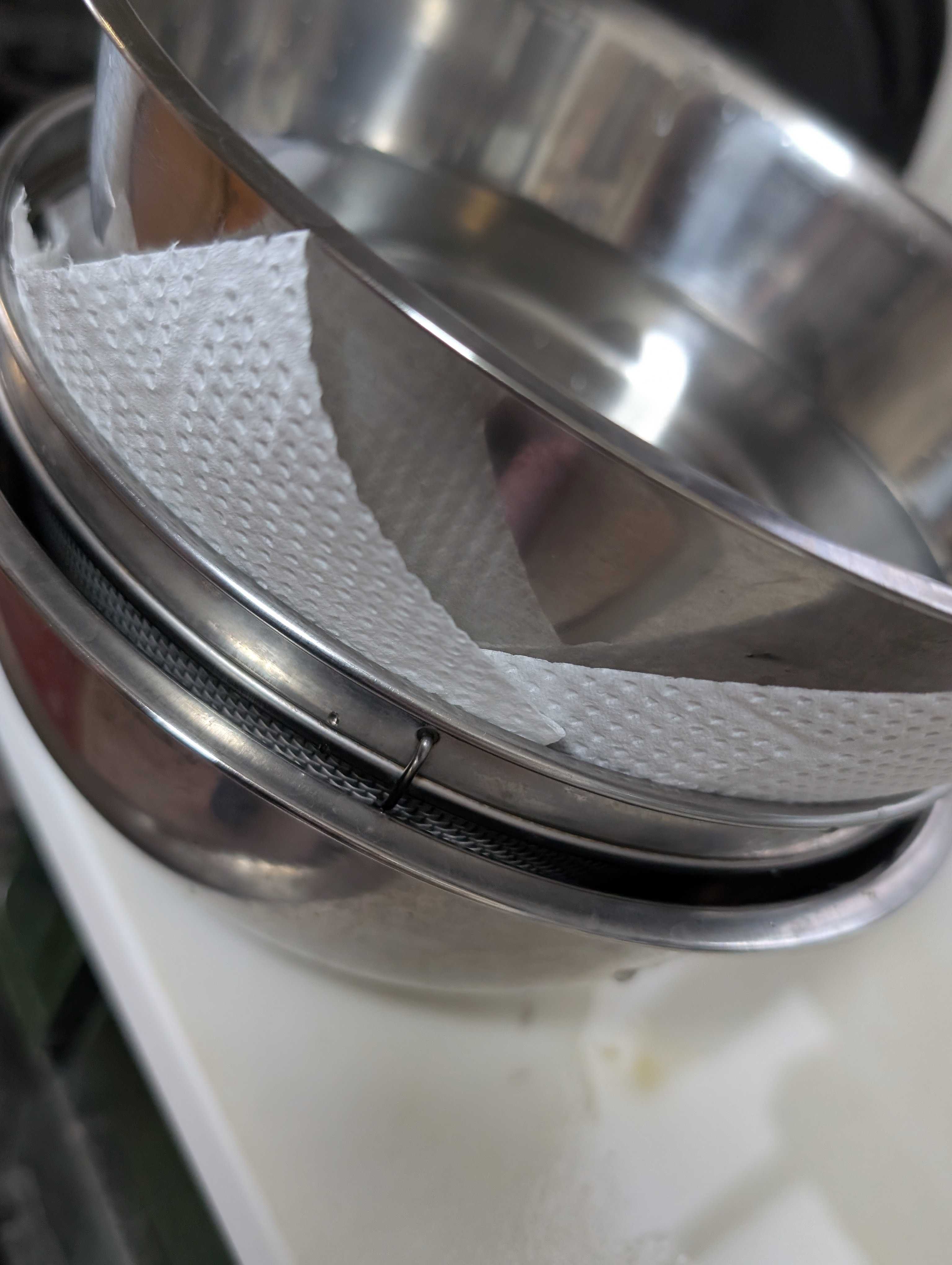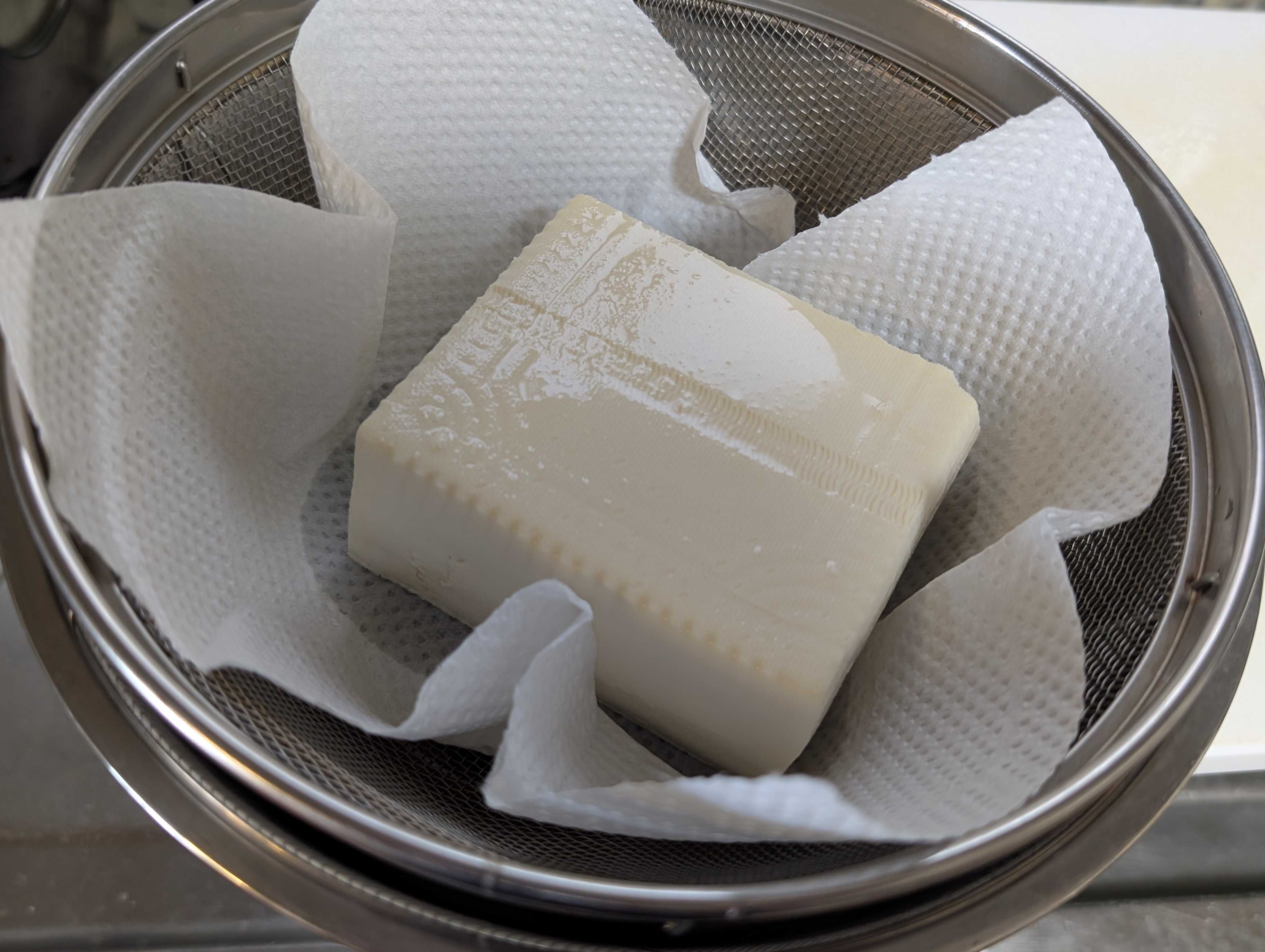 木綿豆腐をキッチンペーパーをかましてざるへ