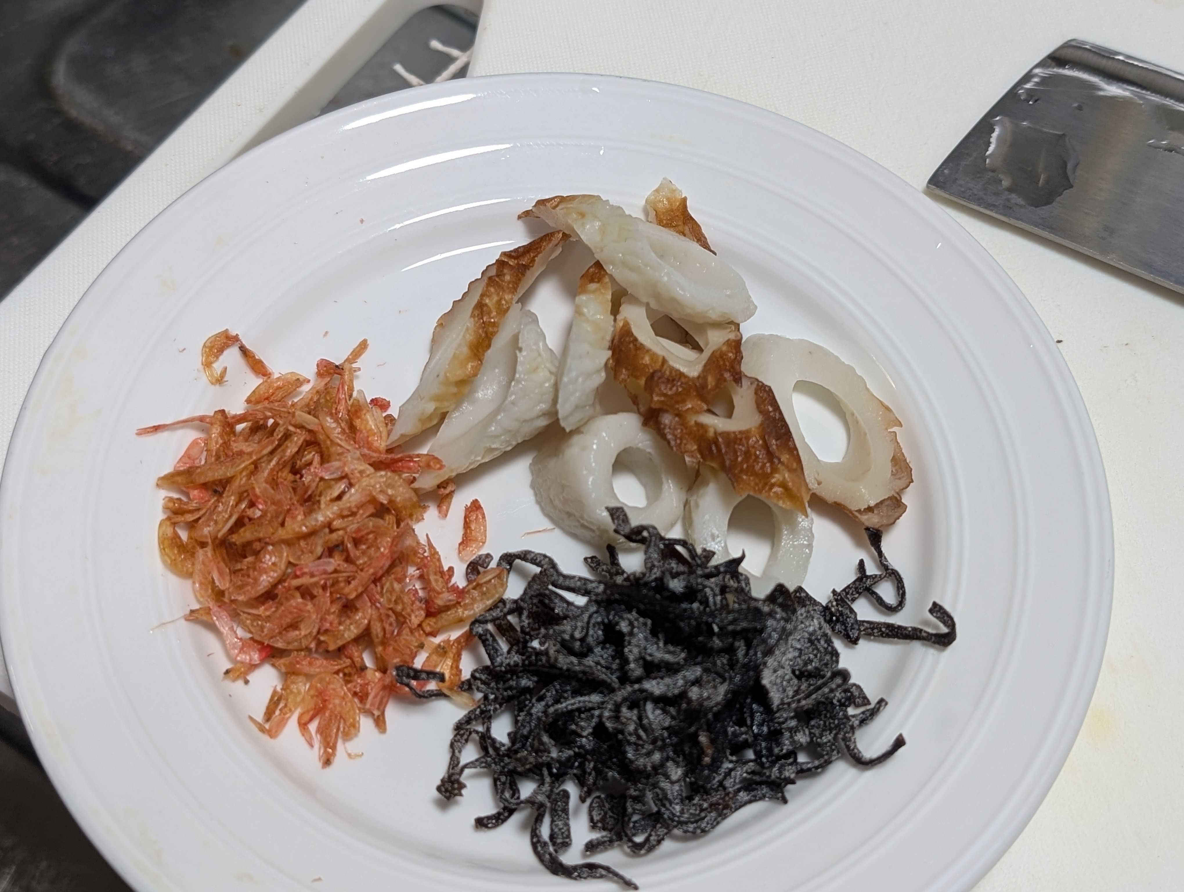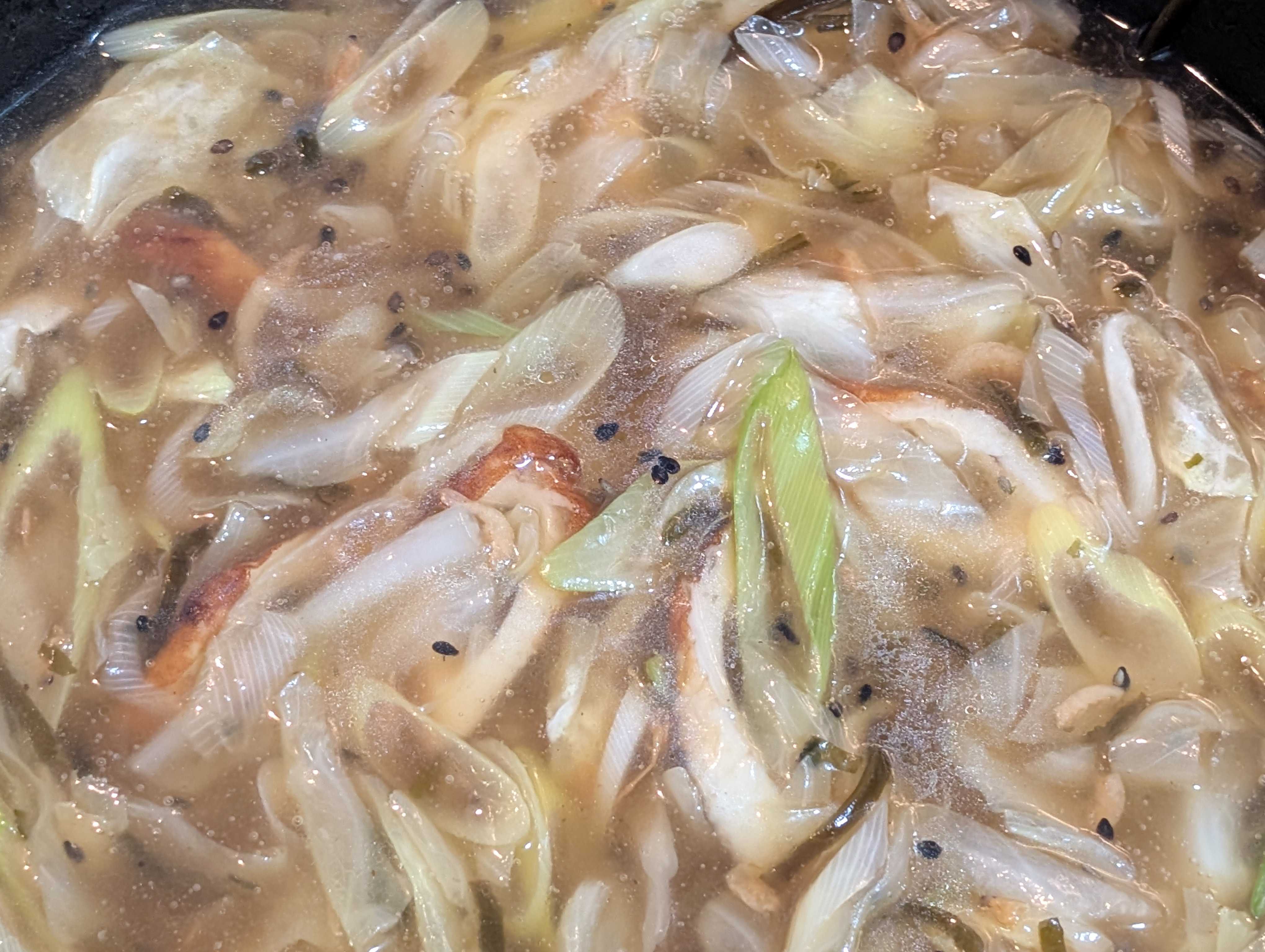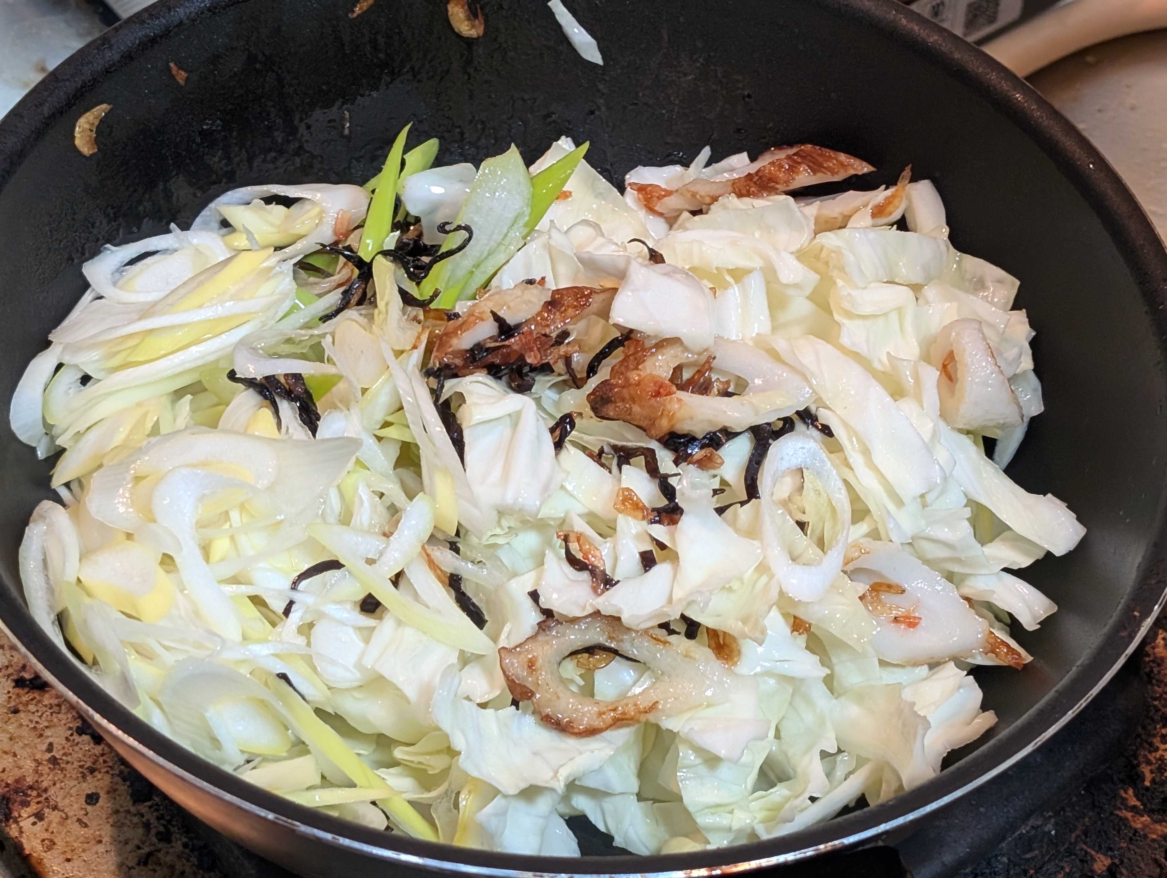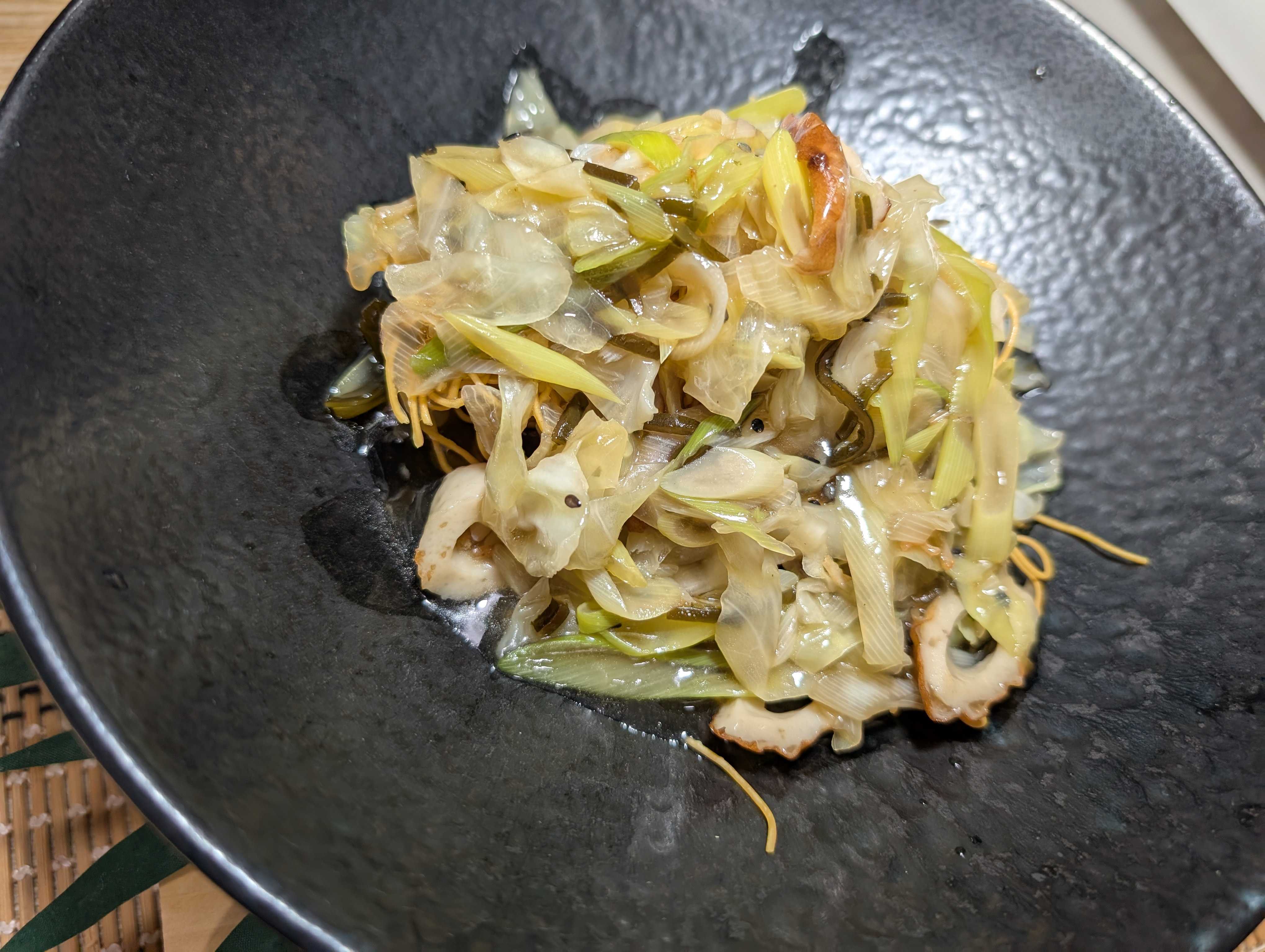 キャベツもあったのでかっとして冷蔵庫漁って出てきた子達サッと炒めて野菜投入お水を゙入れて和風だし等で味つけ良い感じに煮込んで水溶き片栗粉でトロミをつけて仕上げはごま油1周市販の皿うどんの麺たっぷり餡をかけて完成です✨
