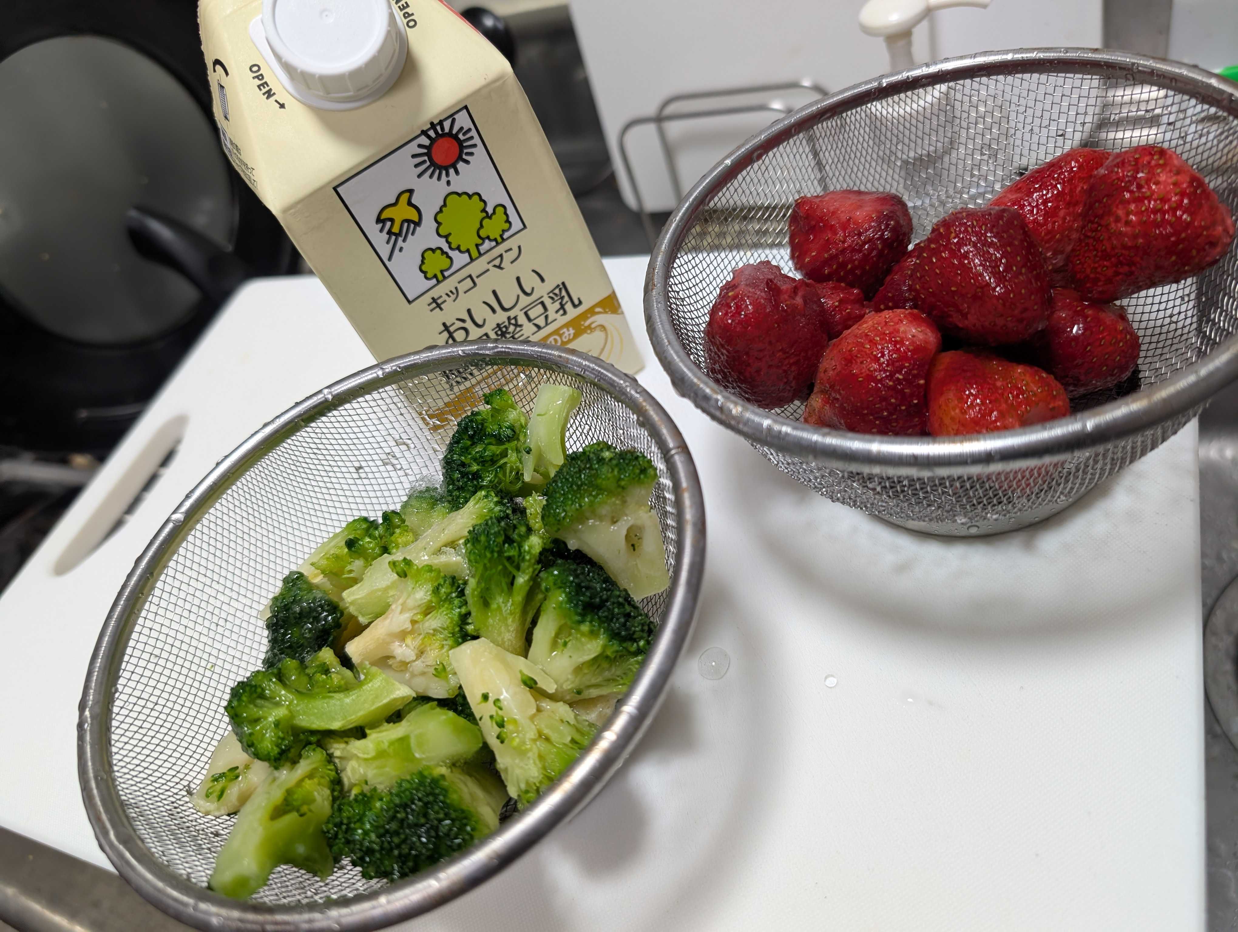 無調整豆乳と、冷凍ブロッコリー🥦、ストロベリー🍓