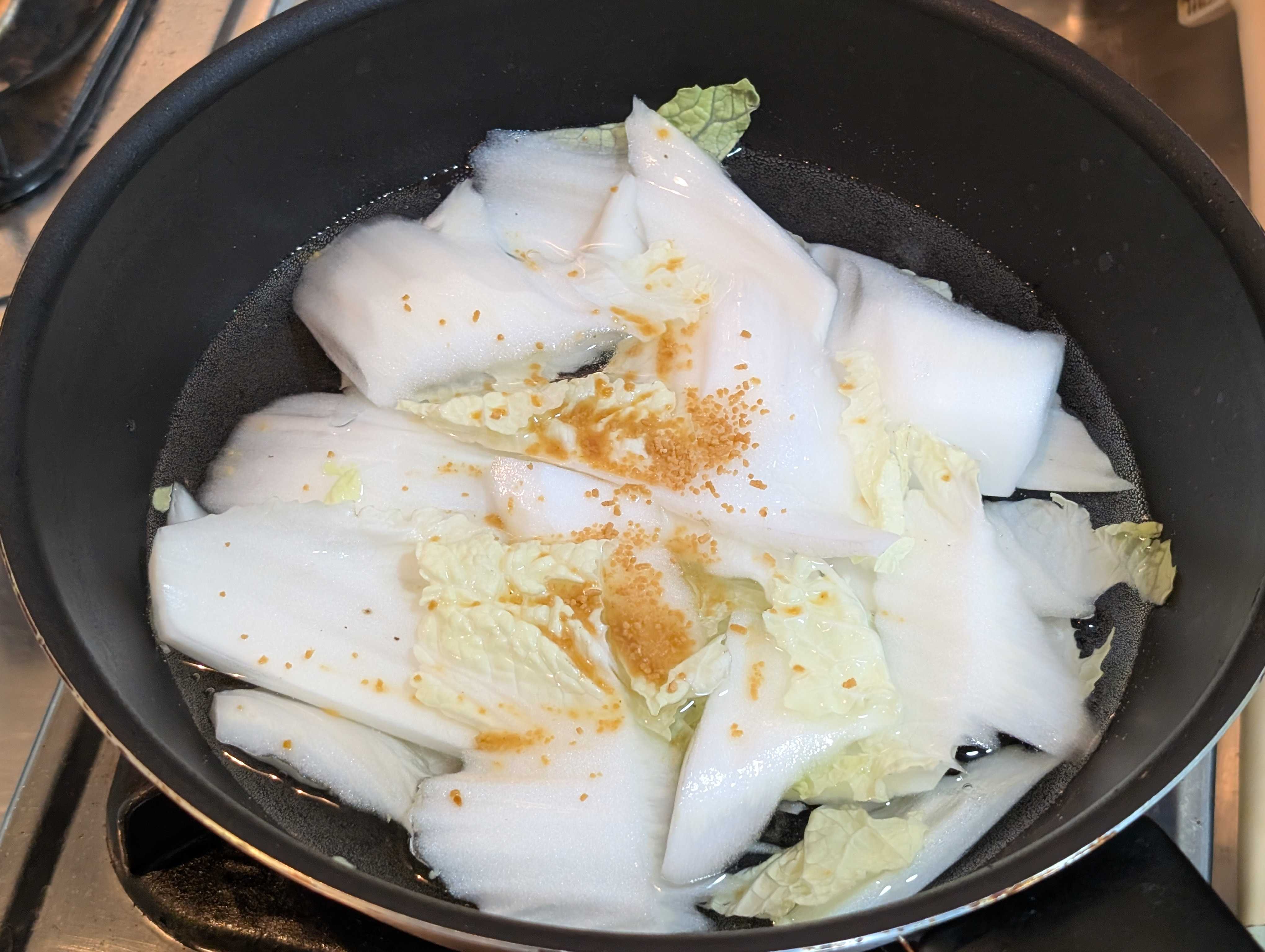 お鍋に水、白菜、コンソメを入れて