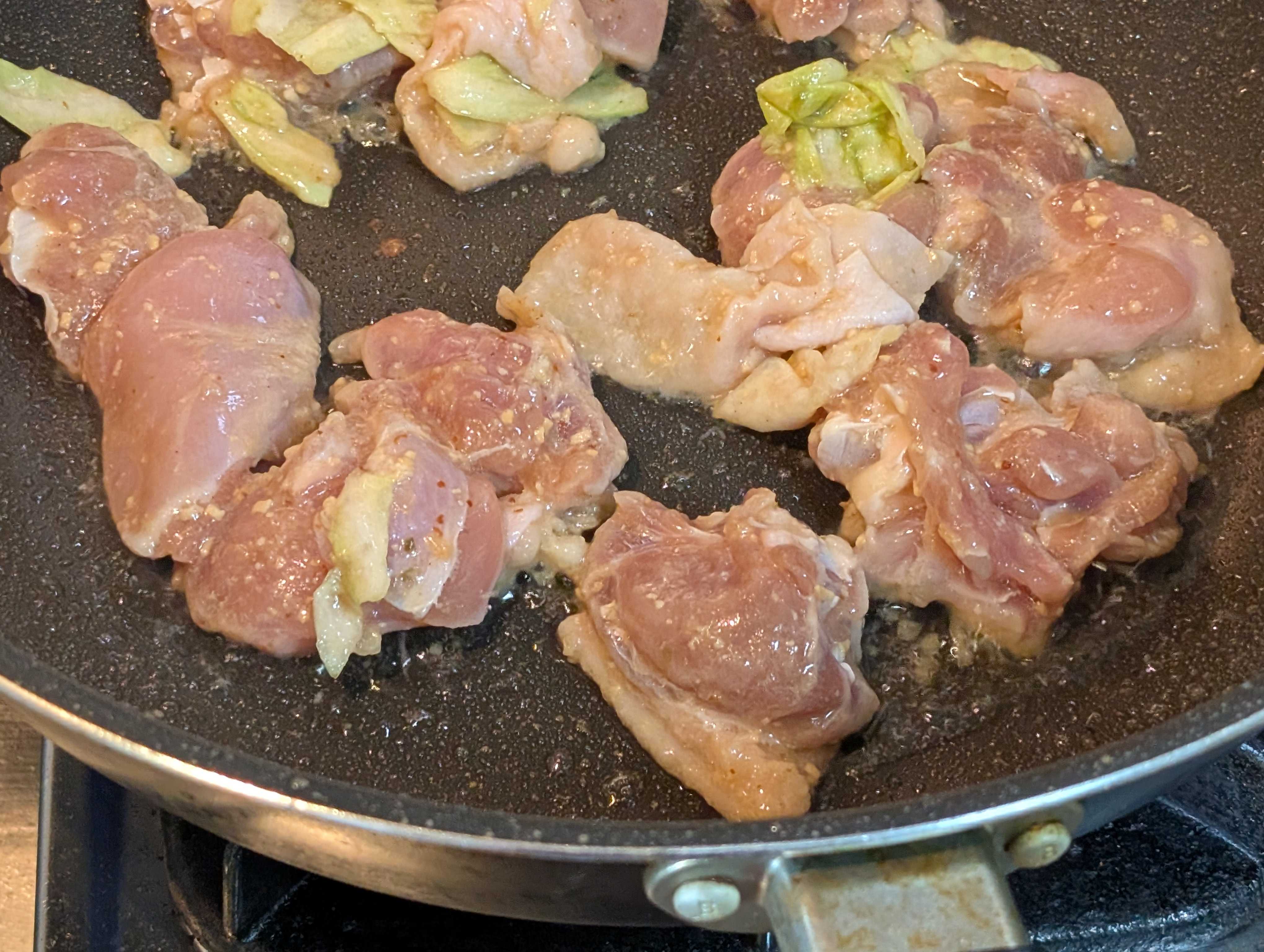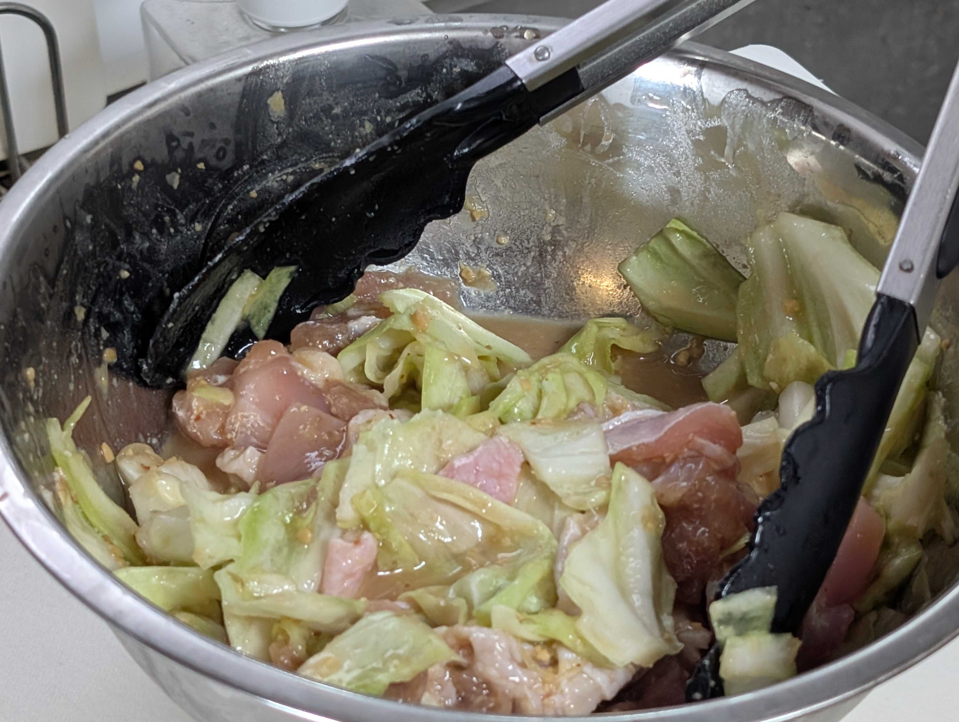一口大にカットした🐔ももとキャベツに味噌、酒、味醂で味付け、30分程漬け込んで